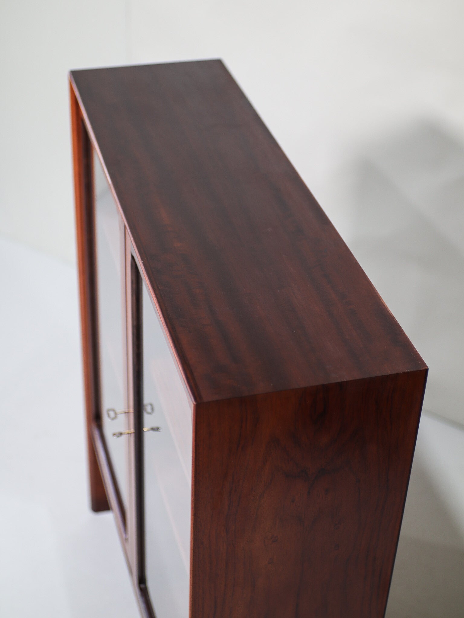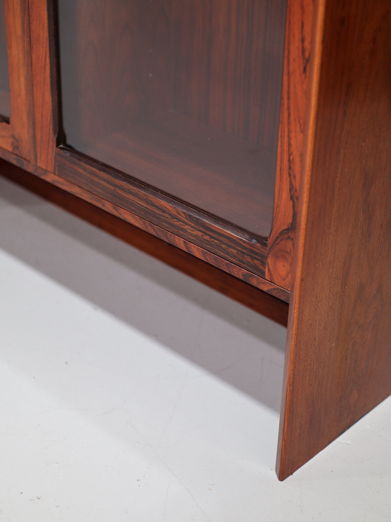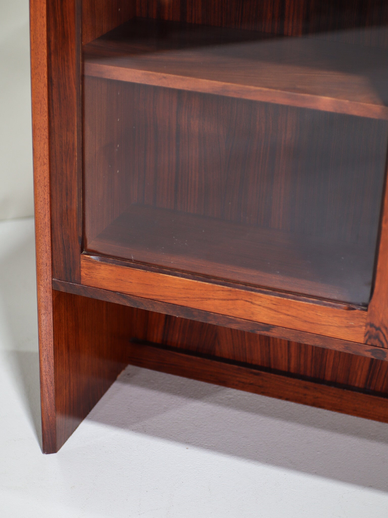 Prachtige vitrinekast ontworpen door E. Brouer voor Brouer Møbelfabrik in Denemarken, jaren '60. Deze kast is gemaakt van palissanderhout en heeft vier in hoogte verstelbare planken achter twee glazen deuren. Ideaal als buffetkast, boekenkast, drankkast etc.