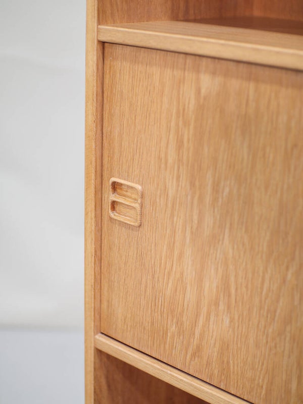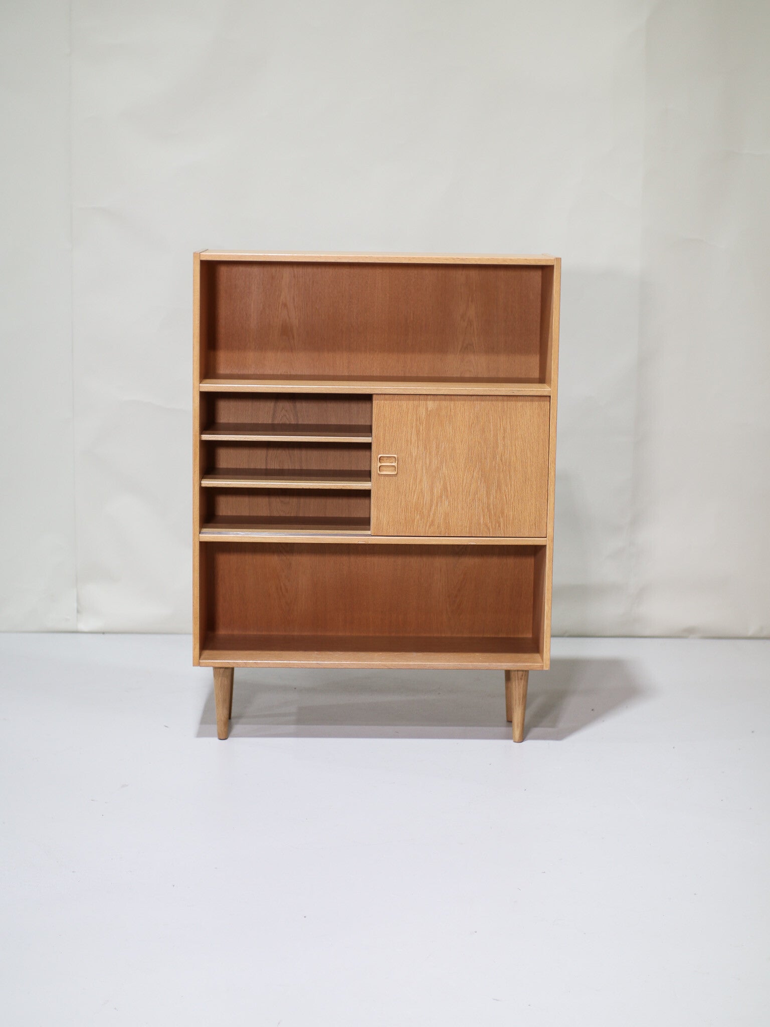 Mooie vintage boekenkast uit Denemarken, jaren '60. Deze kast is gemaakt van licht eikenhout. De kast is speels ingedeeld met twee open vakken en in het midden een gesloten gedeelte met twee schuifdeurtjes en daarachter twee planken en een vak.