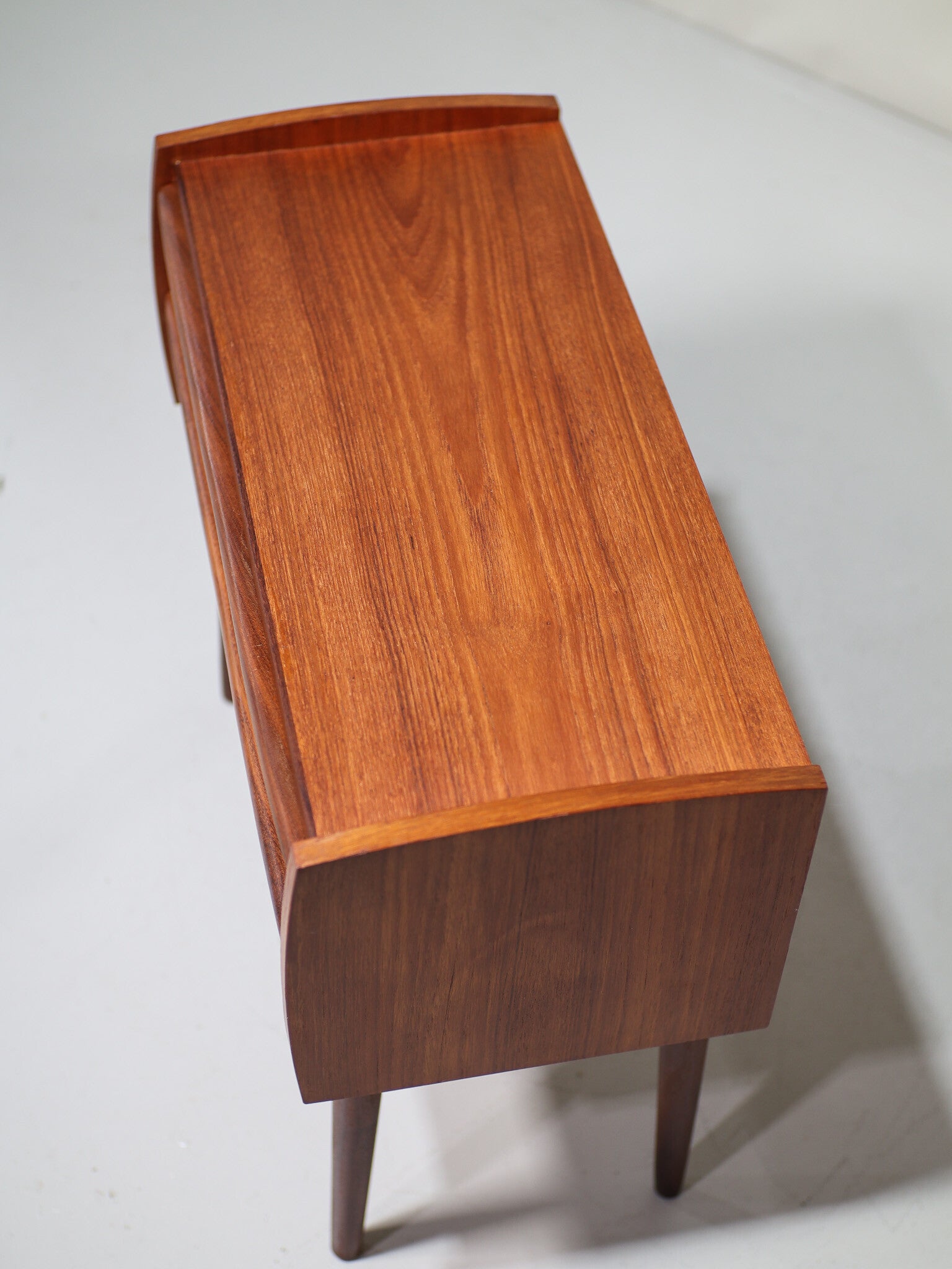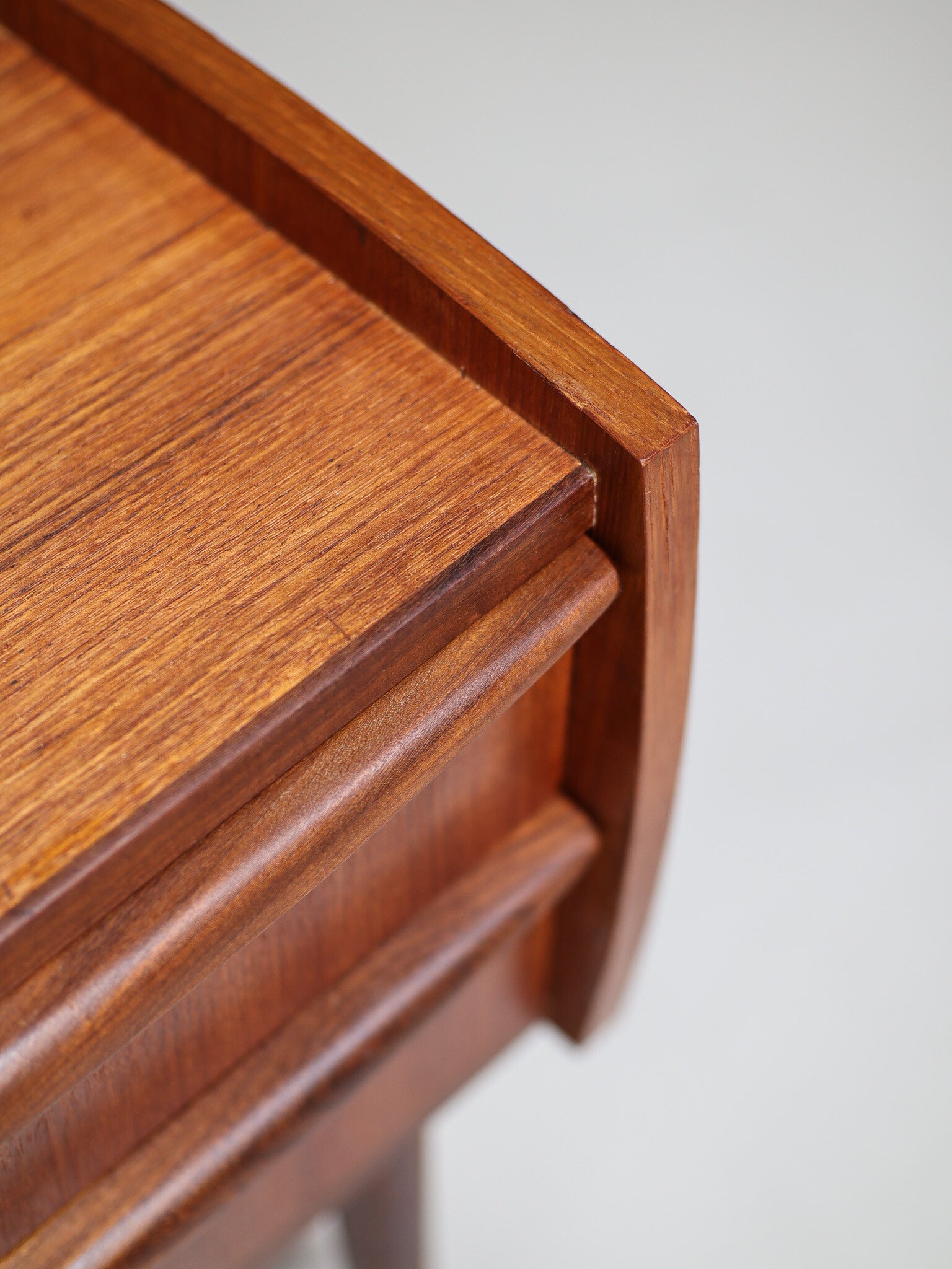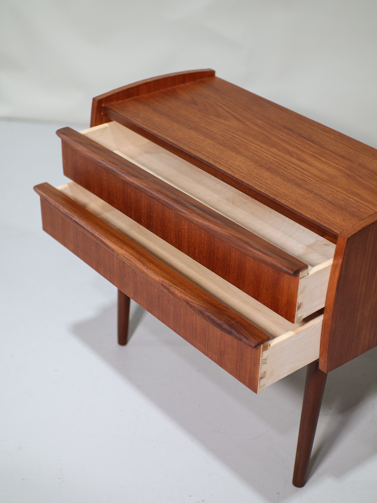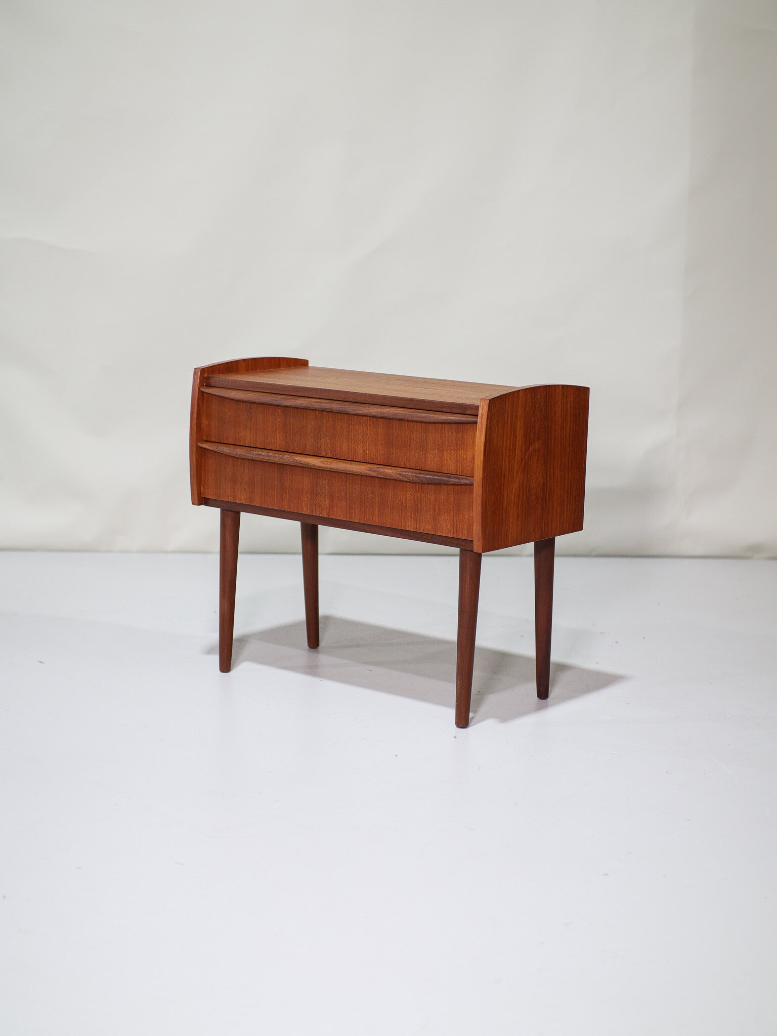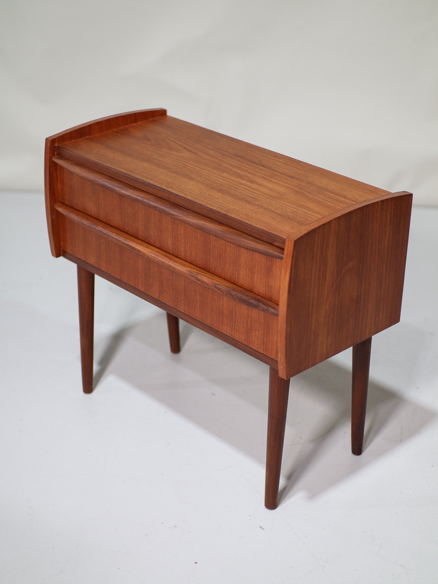 Prachtig ladekastje uit Denemarken, jaren '60. Dit kastje heeft twee lades met mooie lange grepen van gebogen hout. Een tijdloos, minimalitsich mid-century design met ronde / organische vormen. Zeer geschikt als o.a. nachtkastje of halkastje.