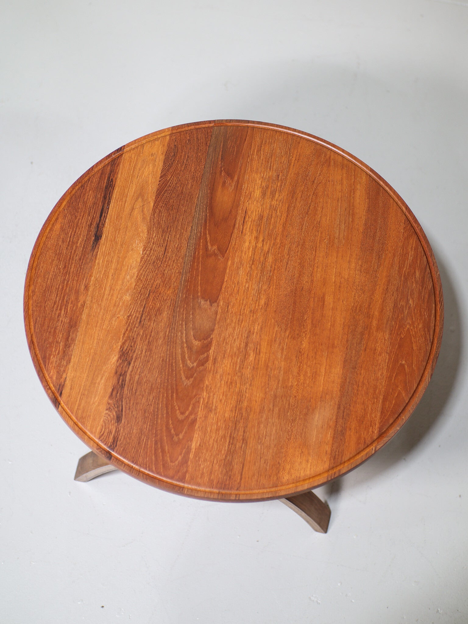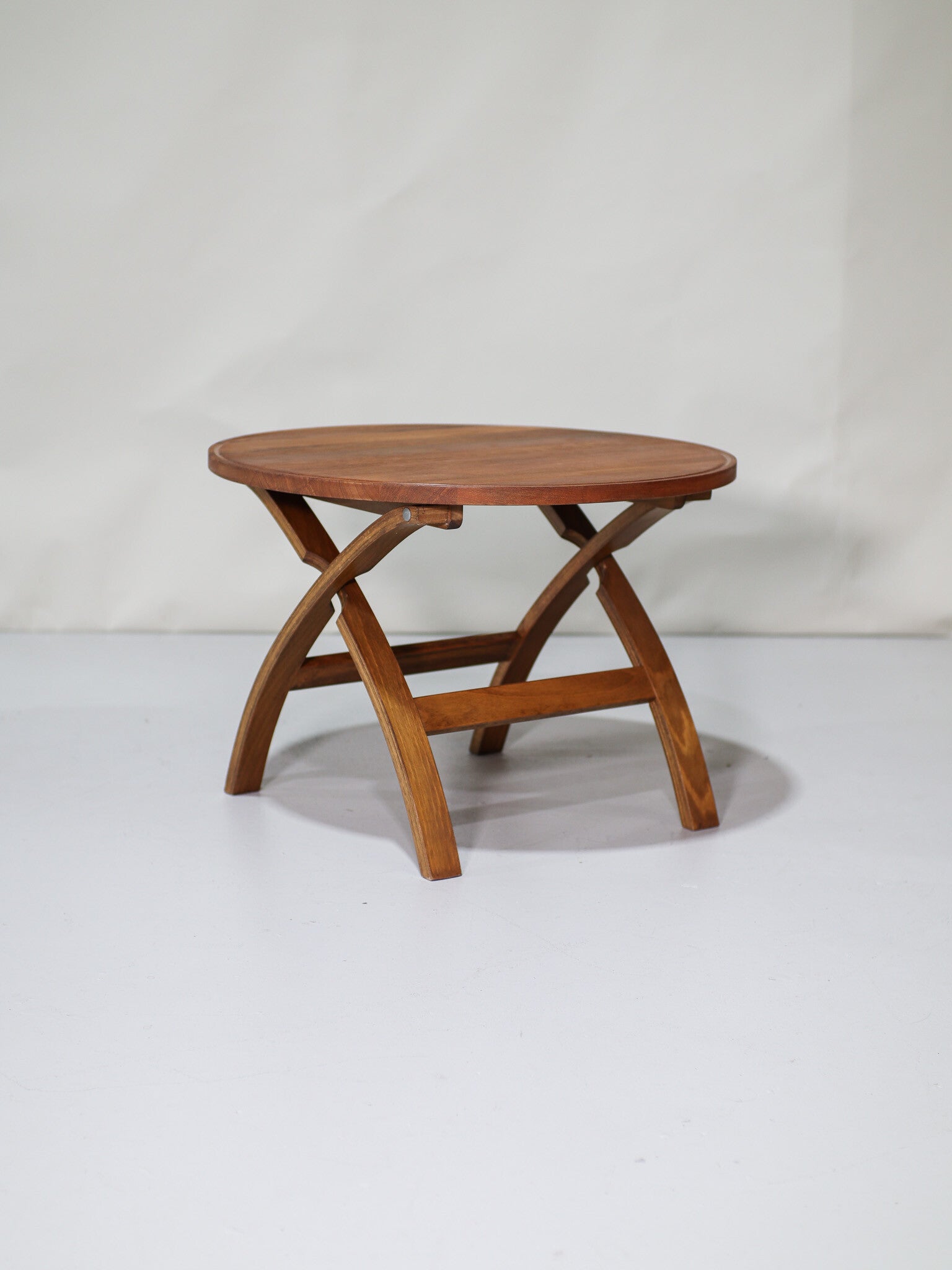 Mooie ronde bijzettafel in de jaren '60 geproduceerd door Haslev Møbelsnedkeri in Denemarken. Deze vintage tafel is gemaakt van teakhout en heeft een bijzondere vormgeving met een X-poot. Ook geschikt als salontafel.