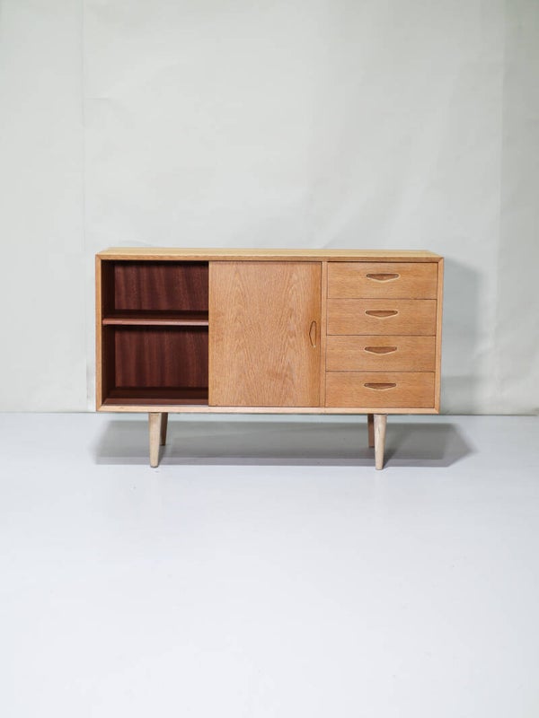 Mooi dressoir geproduceerd door Ølholm Møbelfabrik in Denemarken, jaren '60. Dit licht eikenhouten sideboard heeft twee schuifdeuren en vier ruime lades met unieke grepen. In de kast zit een in hoogte verstelbare plank. Geschikt als onder andere tv-meubel of bouw de kast om tot badkamermeubel!