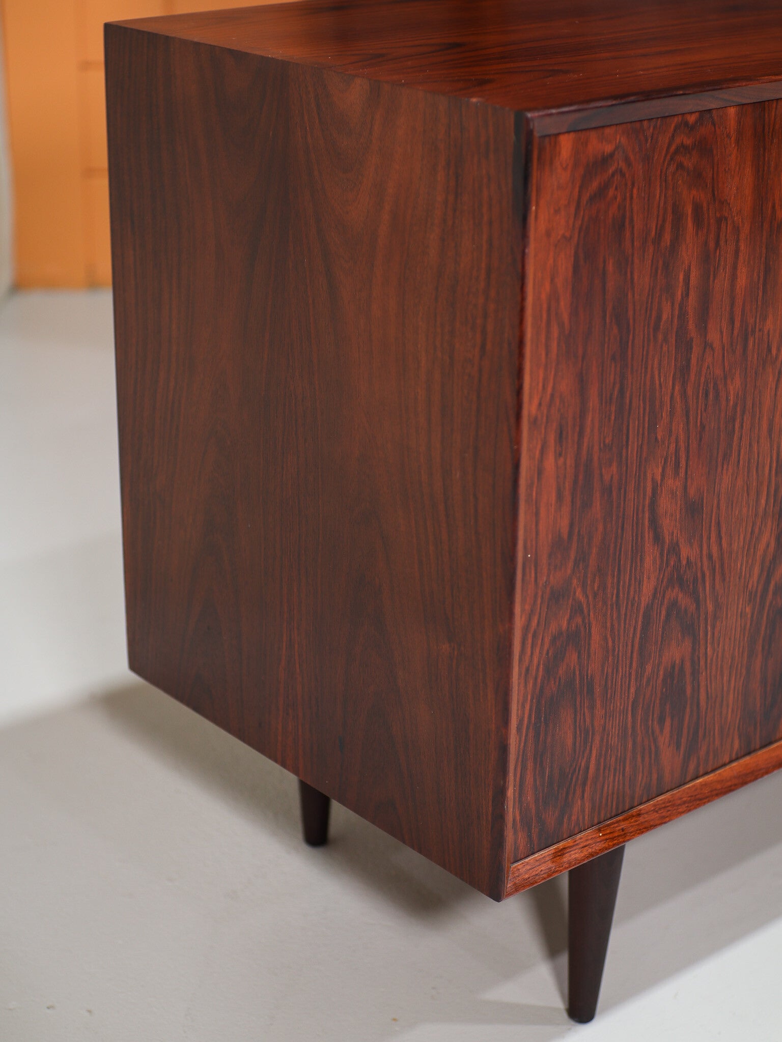 Prachtige kast ontworpen door E. Brouer voor Brouers Møbelfabrik in Denemarken, jaren '60. Dit dressoir is gemaakt van palissanderhout met een mooie houttekening. De kast heeft twee deuren die mooi sluiten met een magneet. Daarachter zitten twee in hoogte verstelbare planken. Geschikt als onder andere tv-meubel, platenkast of bouw hem om tot badkamermeubel!