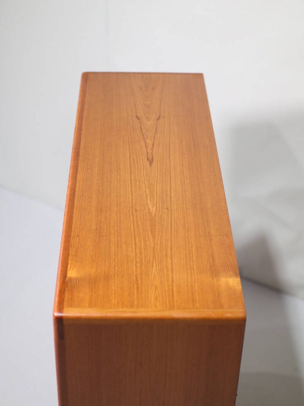 Prachtige kast geproduceerd door Silkeborg in de jaren '60, Denemarken. Deze kast is gemaakt van teakhout en heeft twee tambour deuren die soepel wegrollen in de kast. De deuren hebben mooie houten greepjes. In de kast zitten vier in hoogte verstelbare planken.