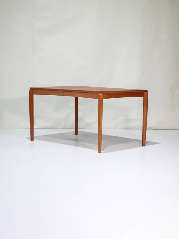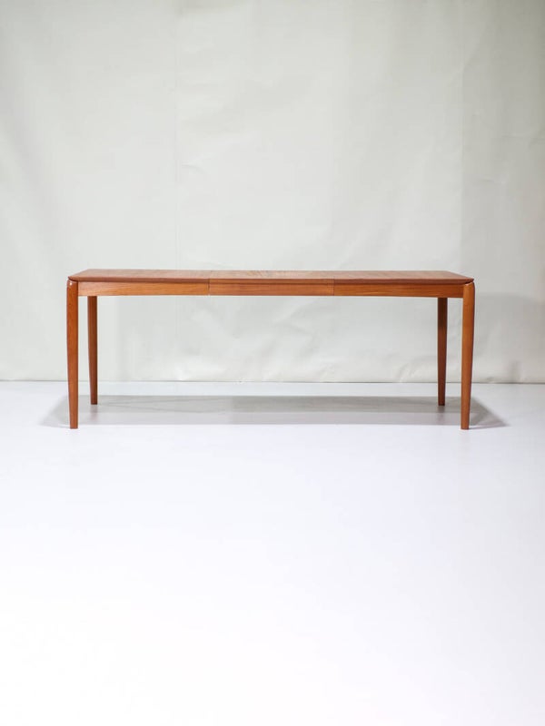 Prachtige en zeldzame eettafel ontworpen door H.W. Klein voor Bramin in de jaren '60, Denemarken. Deze rechthoekige eettafel is uitschuifbaar en met één extra tussenblad verlengbaar. Deze kan in de tafel opgeborgen worden. De tafel is gemaakt van teakhout en prachtig afgewerkt met een mooie rand en bijzonder vormgegeven poten. Echte Deense vakmanschap!