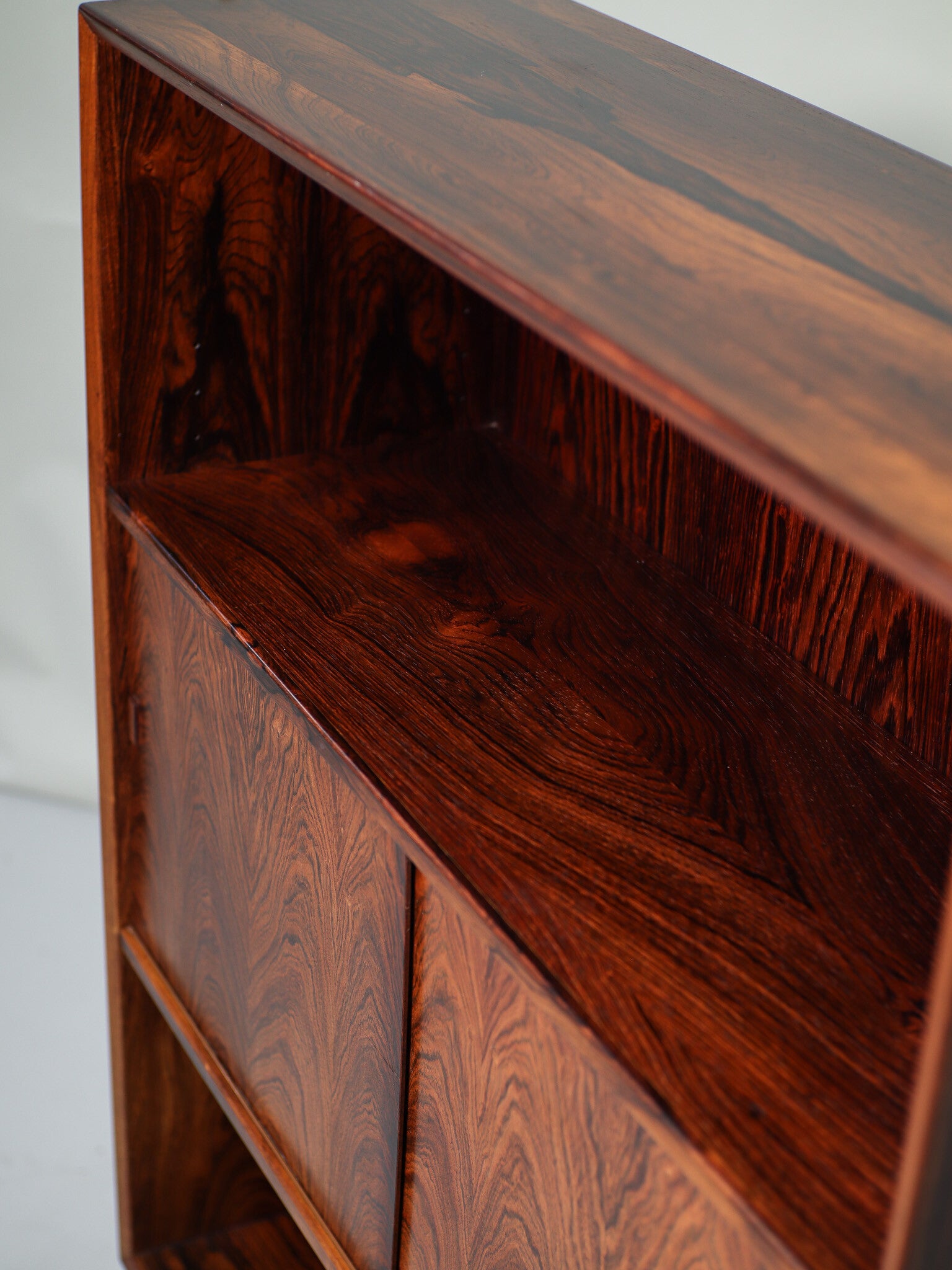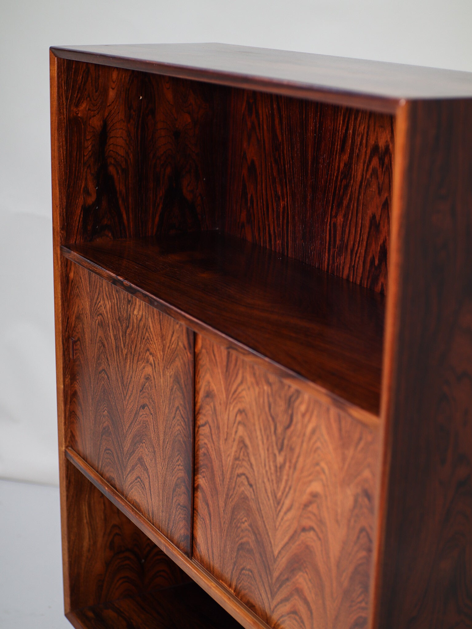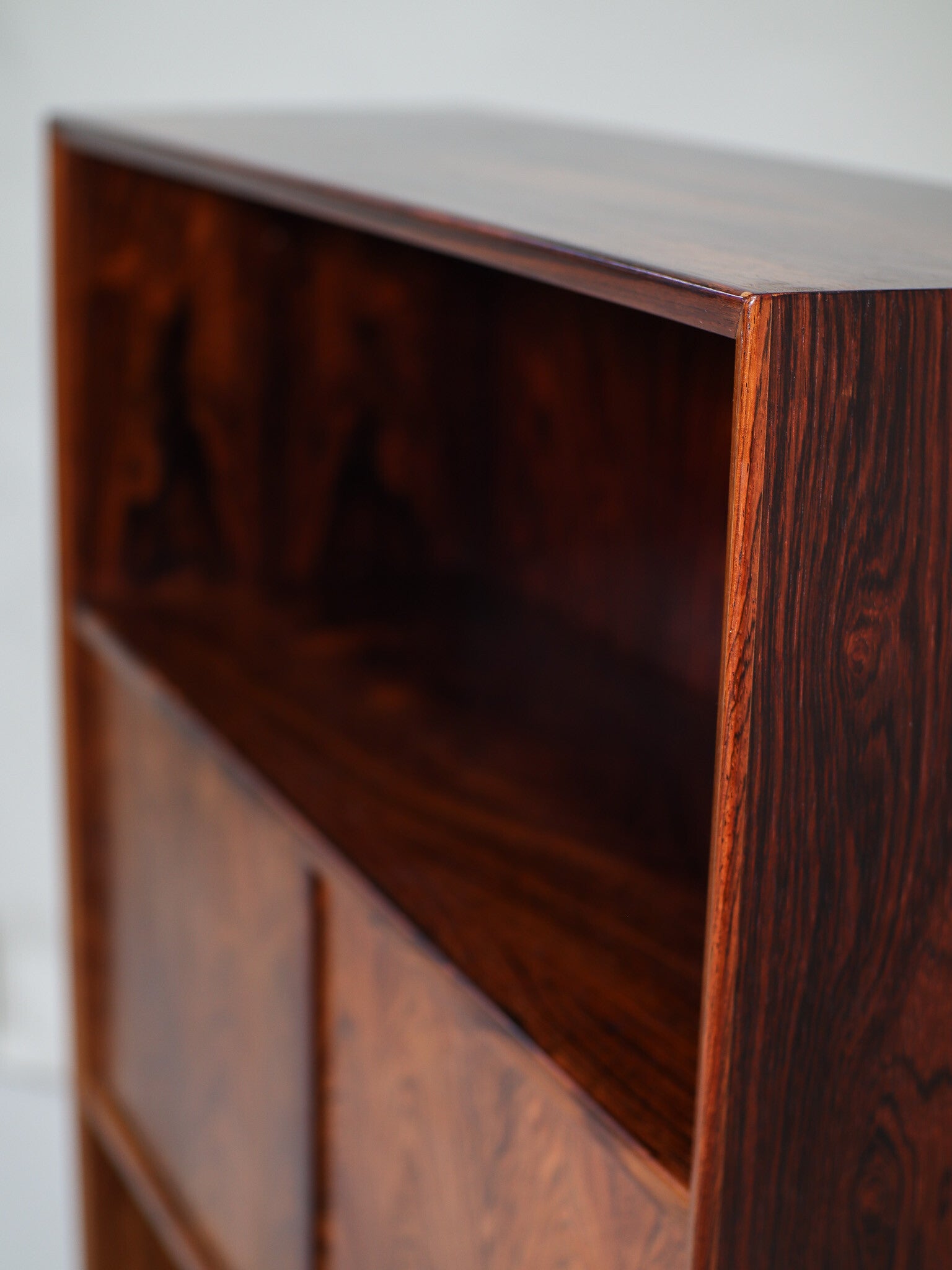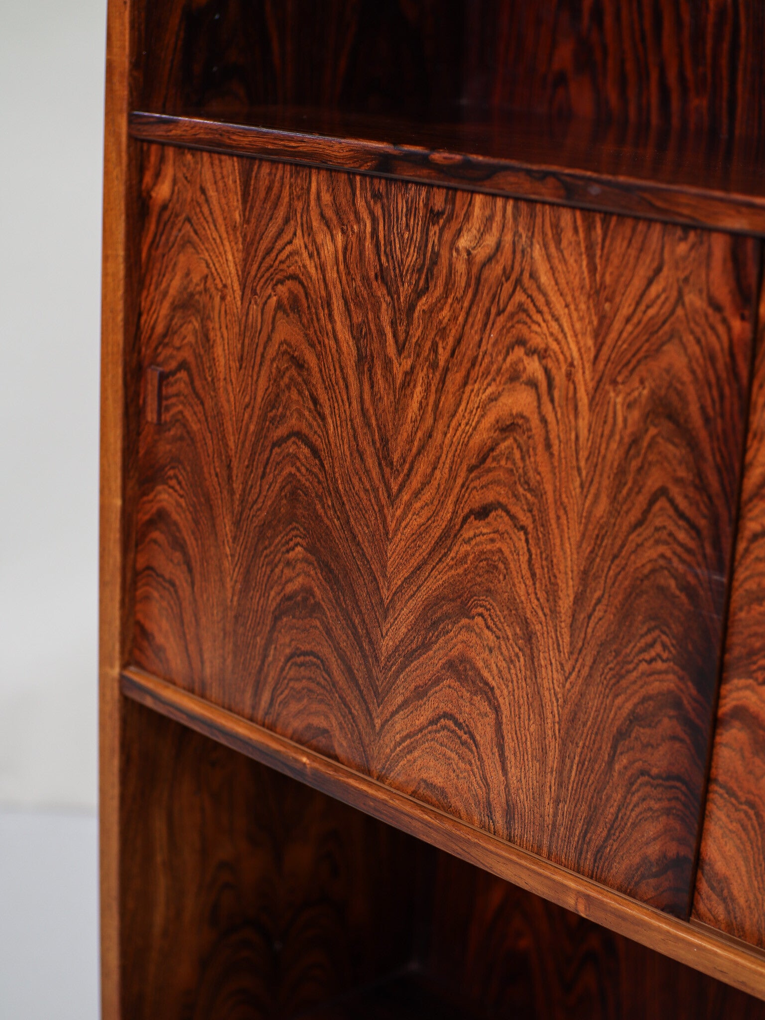 Prachtige hoge boekenkast met deurtjes in het midden geproduceerd door Skovby Møbelfabrik in Denemarken, jaren '60. Deze vintage kast is gemaakt van palissanderhout met een zeer bijzondere houttekening. De kast is mooi afgewerkt met schuine randen.