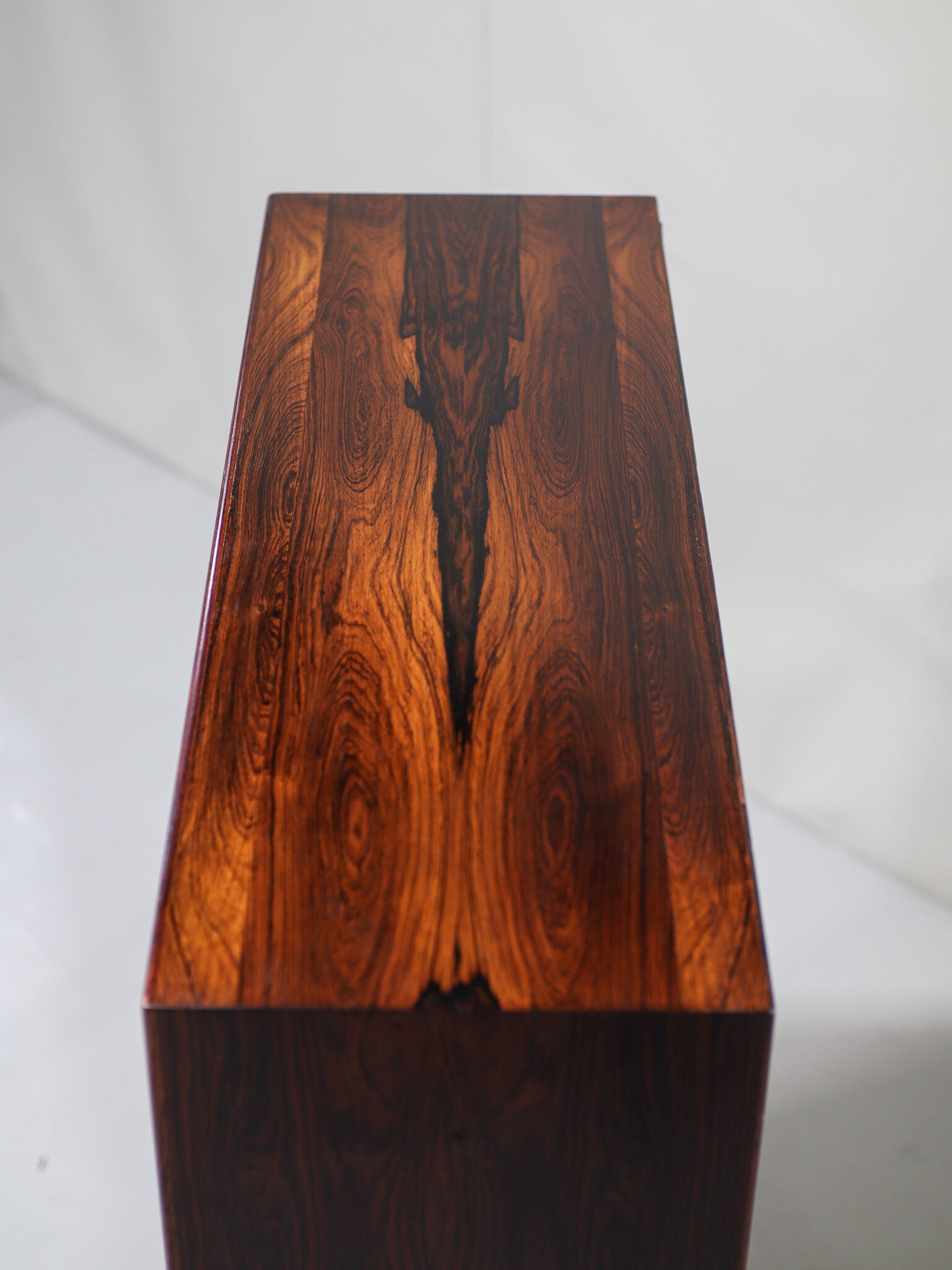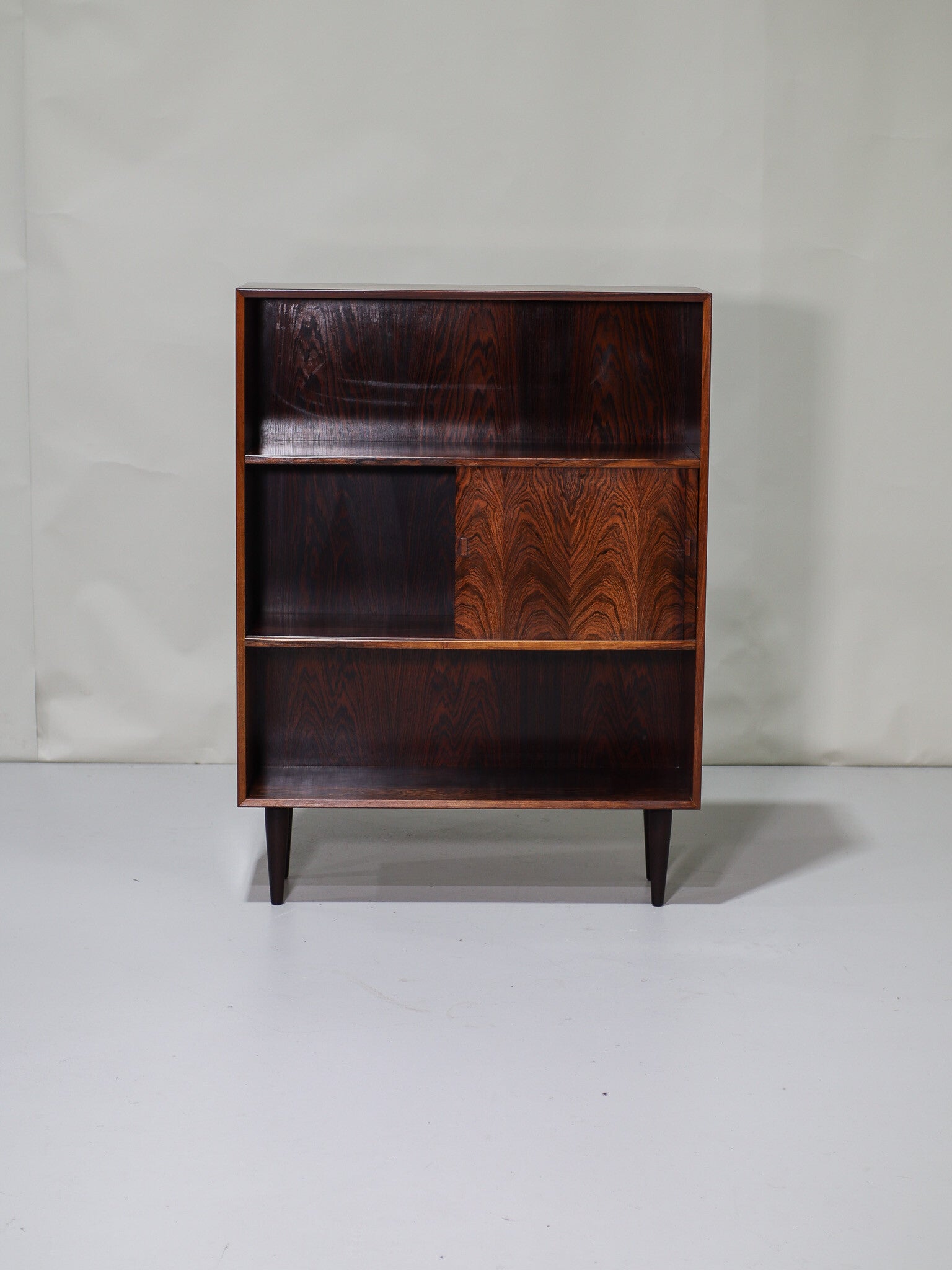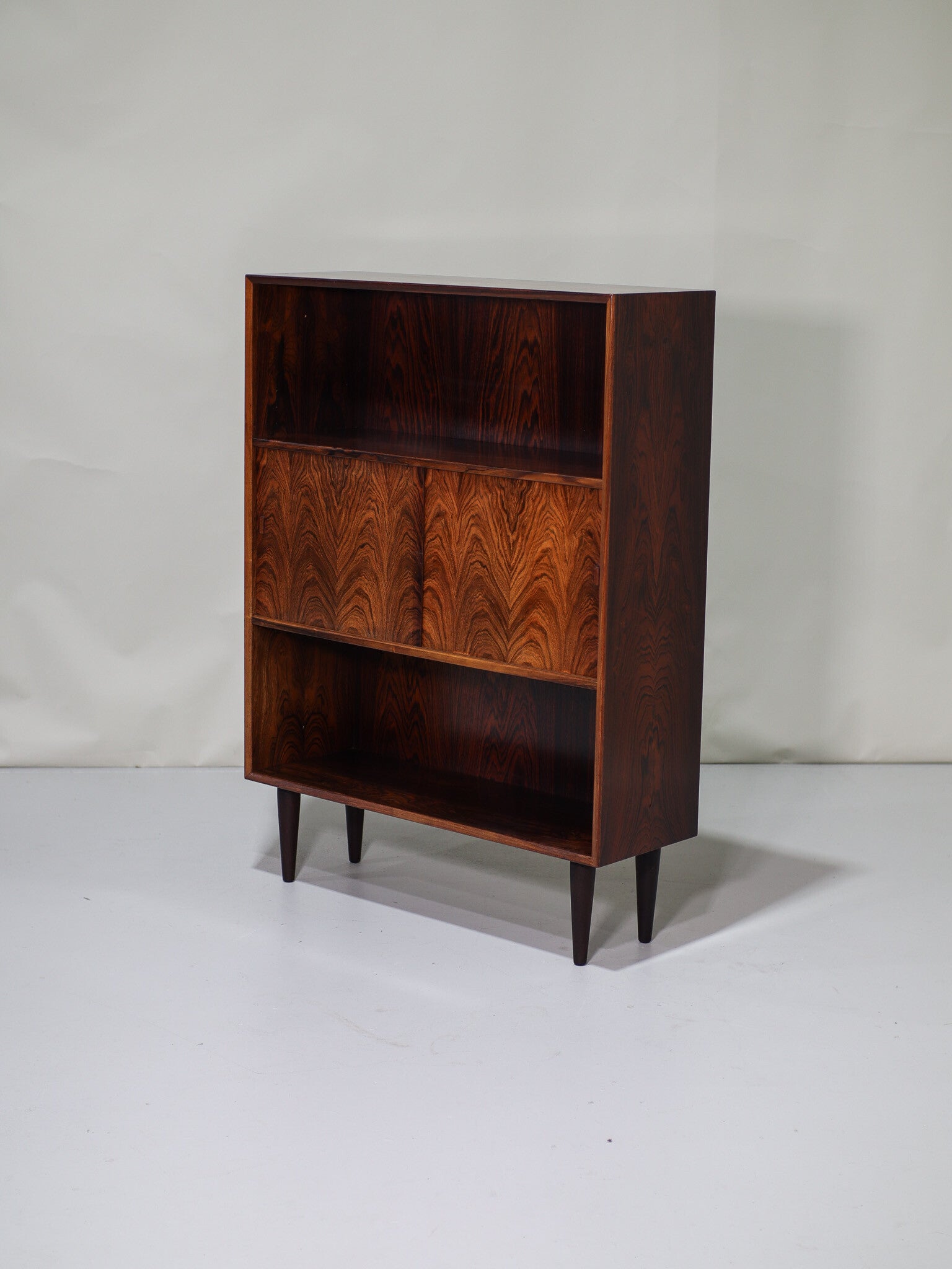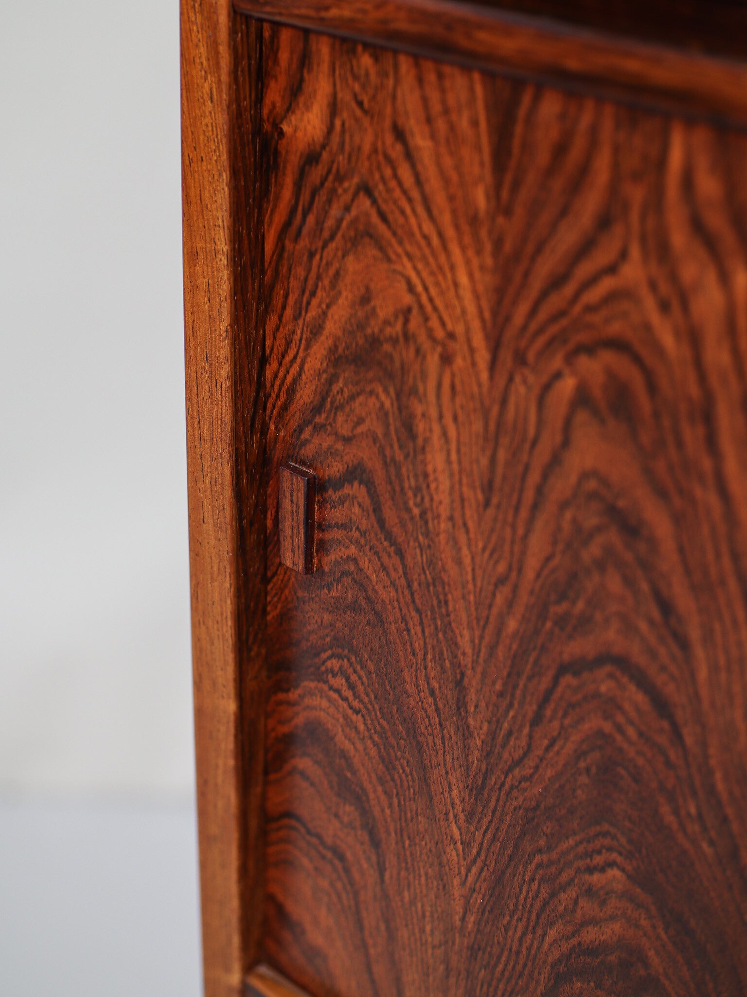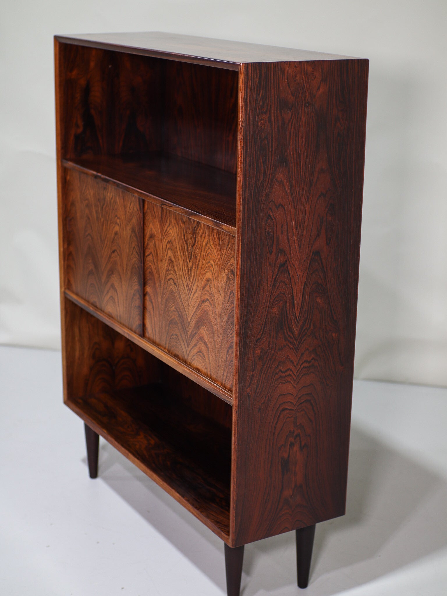 Prachtige hoge boekenkast met deurtjes in het midden geproduceerd door Skovby Møbelfabrik in Denemarken, jaren '60. Deze vintage kast is gemaakt van palissanderhout met een zeer bijzondere houttekening. De kast is mooi afgewerkt met schuine randen.