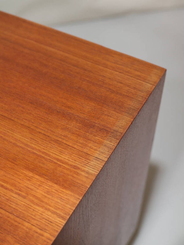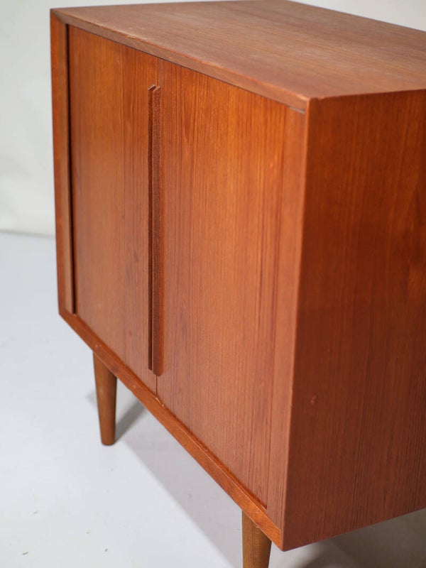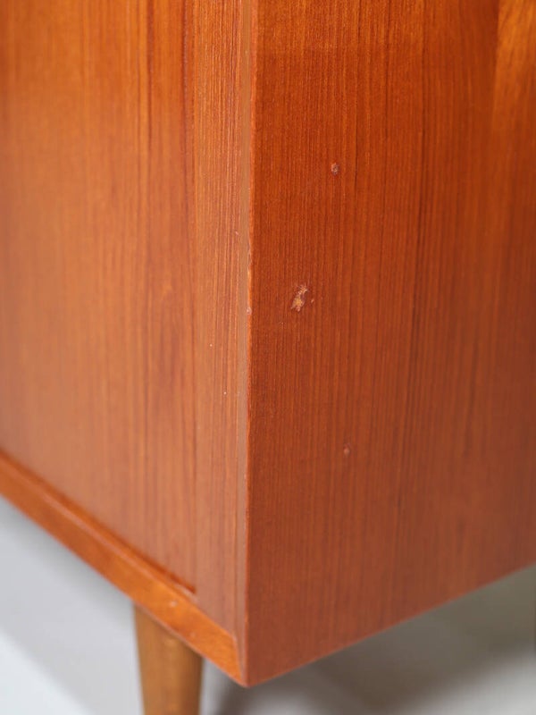 Prachtig dressoir geproduceerd door Ølholm Møbelfarbik in de jaren '60 in Denemarken. Deze kast is gemaakt van teakhout en heeft twee tambour deuren die soepel wegrollen in de kast. In de kast zit een in hoogte verstelbare plank en twee lades.