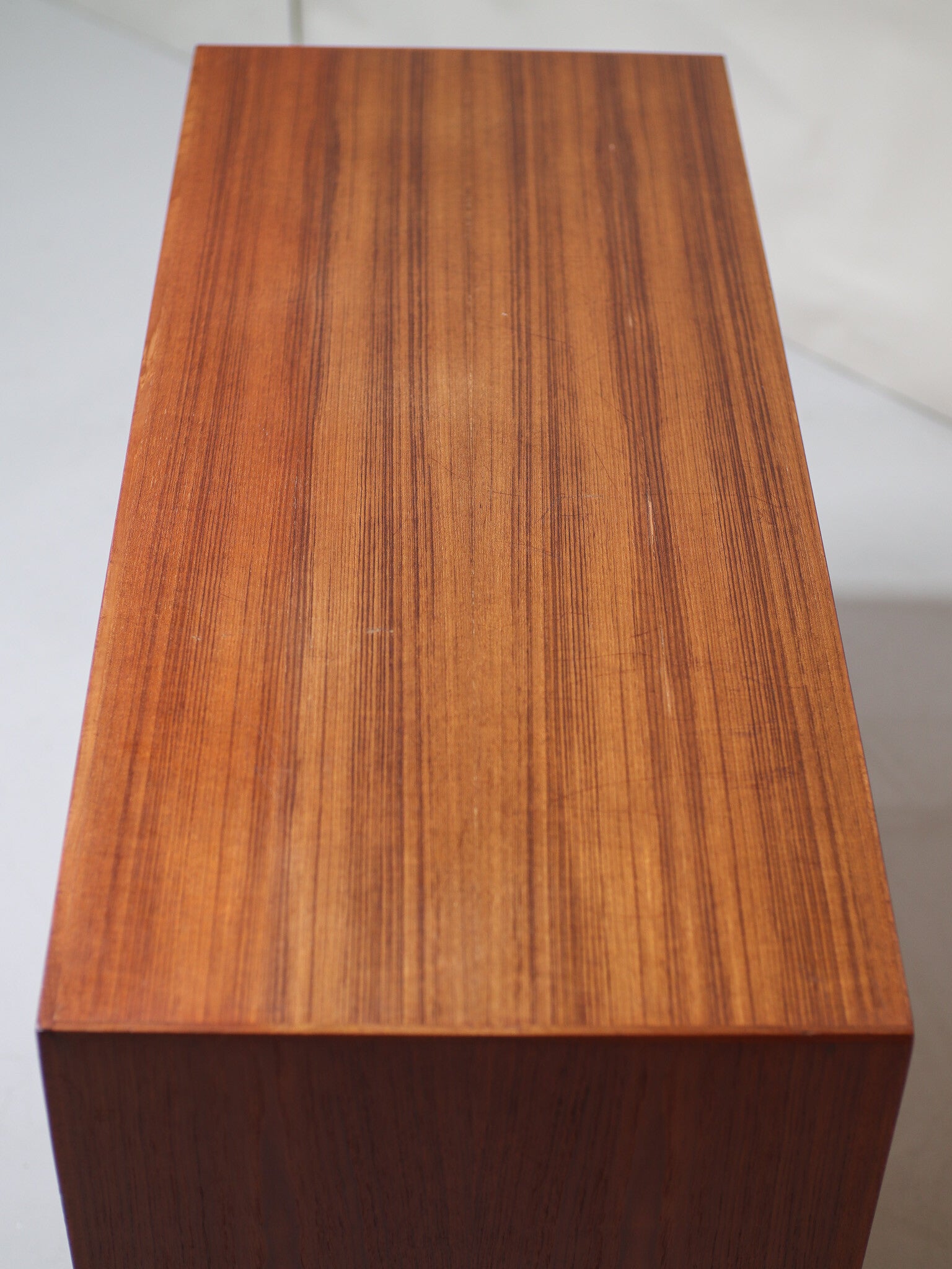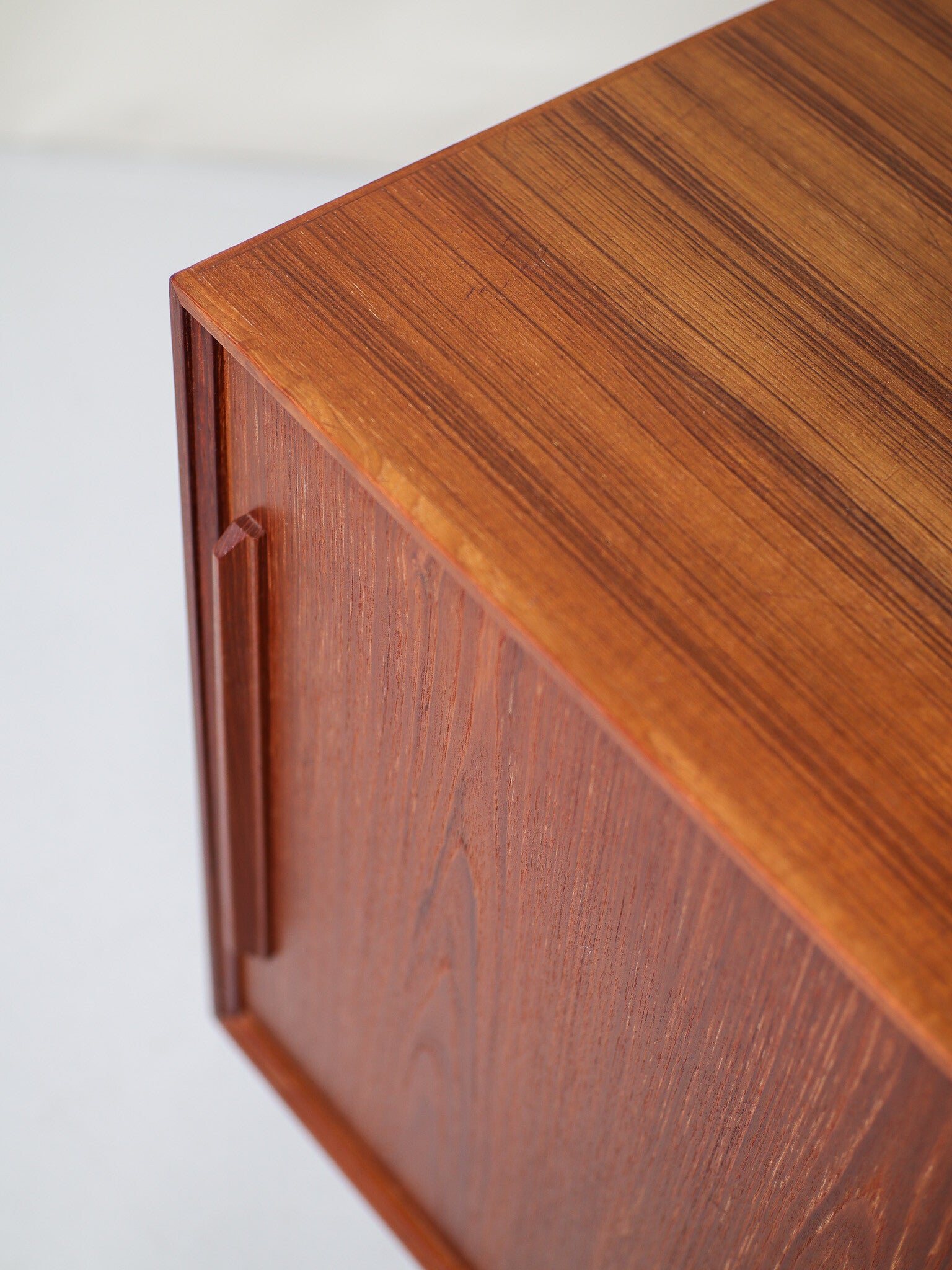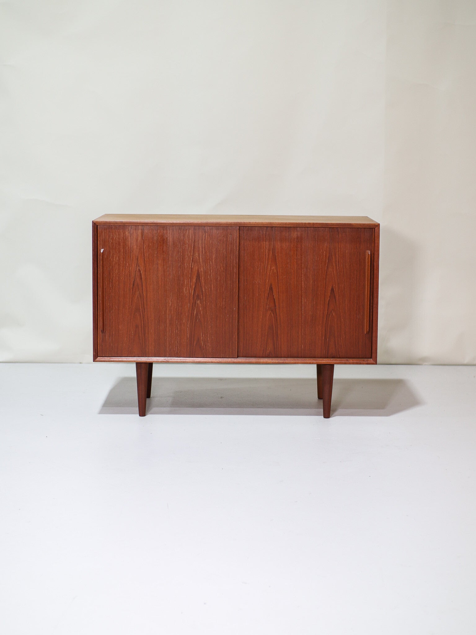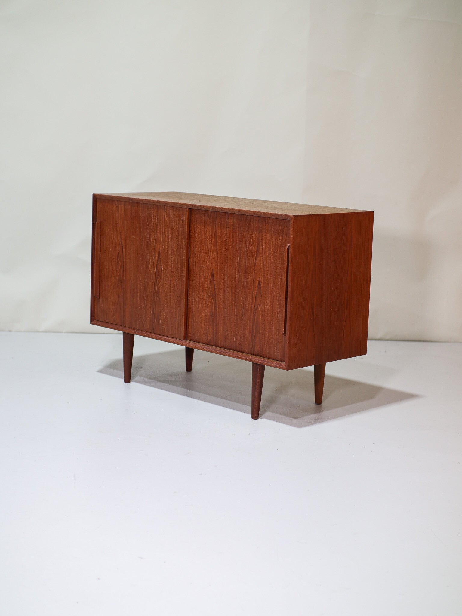 Mooi dressoir uit Denemarken geproduceerd in de jaren '60. Deze kast is gemaakt van teakhout en heeft twee schuifdeuren met mooie lange grepen. In de kast zit één in hoogte verstelbare plank. Geschikt als bijvoorbeeld tv-meubel, lp-kast / platenkast, spelletjeskast of bouw hem om tot badkamermeubel!