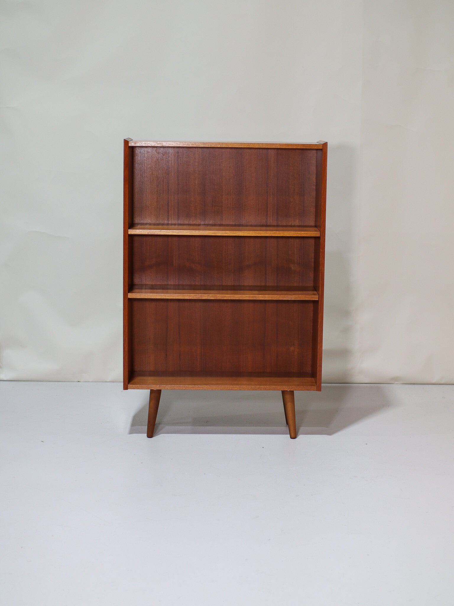 Mooie middelhoge boekenkast geproduceerd door Ølholm Møbelfabrik in Denemarken, jaren '60. Deze open boekenkast is gemaakt van teakhout en heeft twee in hoogte verstelbare planken. De kast is mooi afgewerkt met een schuine rand.
