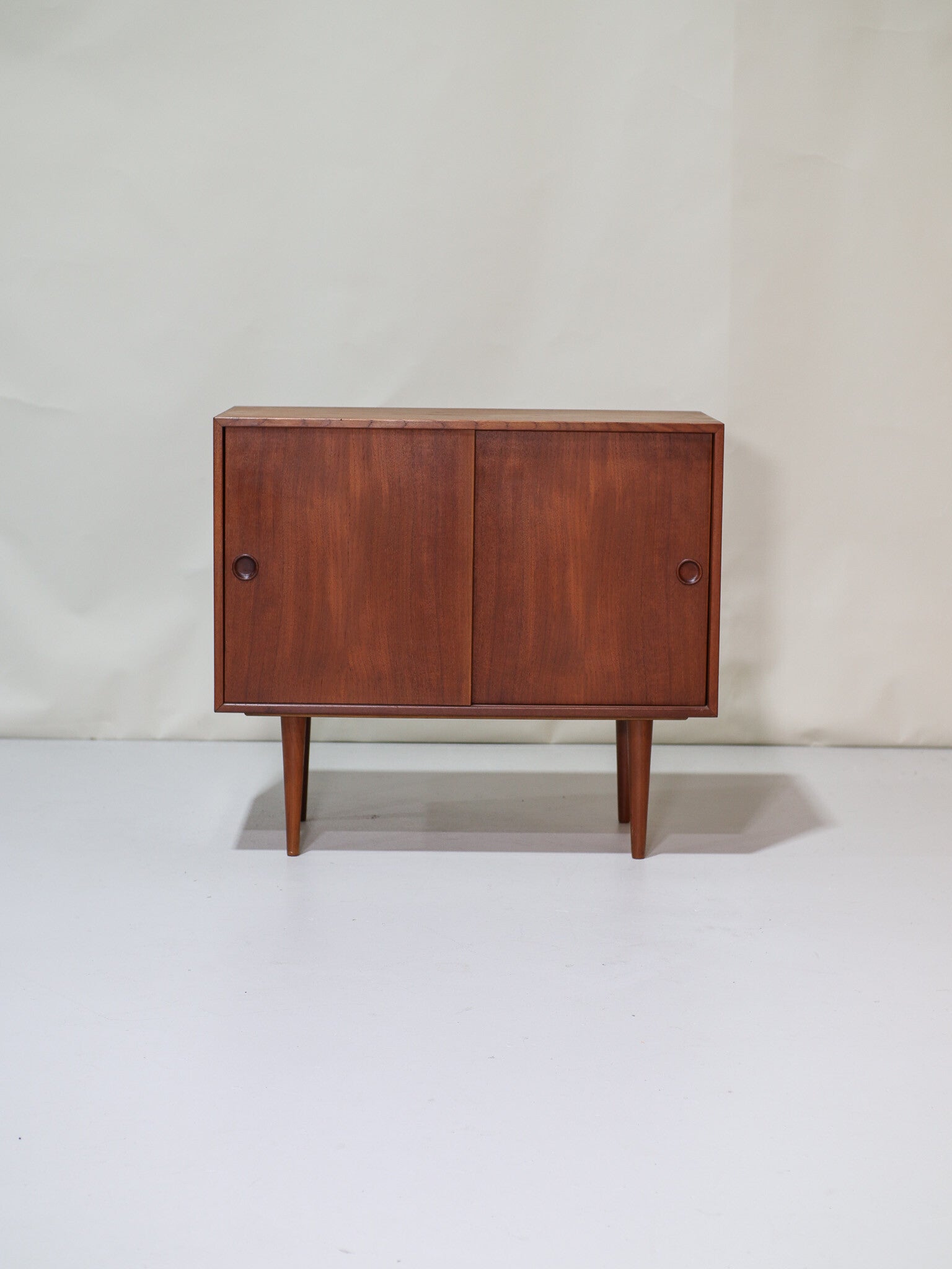 Prachtig dressoir ontworpen door Kai Kristiansen voor FM Feldballes Møbelfabrik in Denemarken in de jaren '60. Deze kast staat op hoge poten en heeft twee schuifdeuren met mooie ronde grepen. In de kast zitten drie in hoogte verstelbare planken en drie kleine lades. Geschikt als onder andere tv-meubel, lp kast / platenkast of bouw hem om tot badkamermeubel!