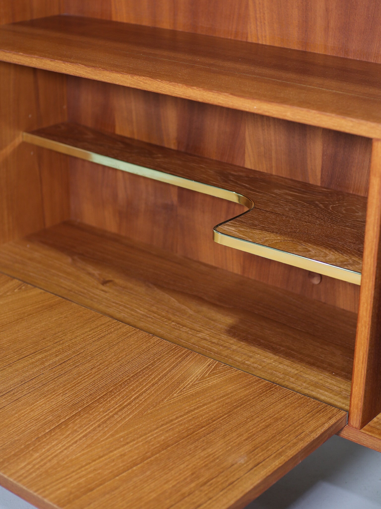 Prachtige boekenkast / vakkenkast geproduceerd door Clausen & Søn in Denemarken, jaren '60. Deze vintage kast is gemaakt van teakhout. Het open gedeelte heeft één vaste plank. Onderin de kast zit een open vak met schotten voor o.a. LP's. Verder heeft de kast een klep met een houten greepje en daarachter een plank met een mooie goudkleurige afwerking. Dit gedeelte is onder andere geschikt om te gebruiken als barkast met flessen onderin en glazen op de plank. Een uniek, praktisch, kwalitatief en tijdloos meubelstuk!