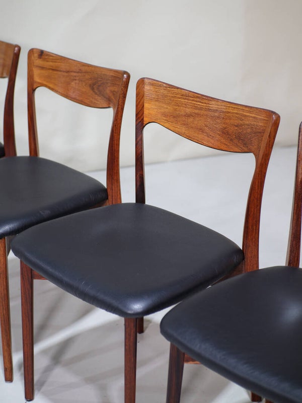 Een set van 6 prachtige eetkamerstoelen ontworpen door Harry Østergaard voor Randers Møbelfabrik in Denemarken, jaren '60. De stoelen zijn gemaakt van palissanderhout met een mooie houttekening. De zittingen zijn opnieuw bekleed met zwart leer. Het frame heeft een stijlvolle vormgeving en is zeer stevig doordat het onder de zitting door loopt in een kruis.