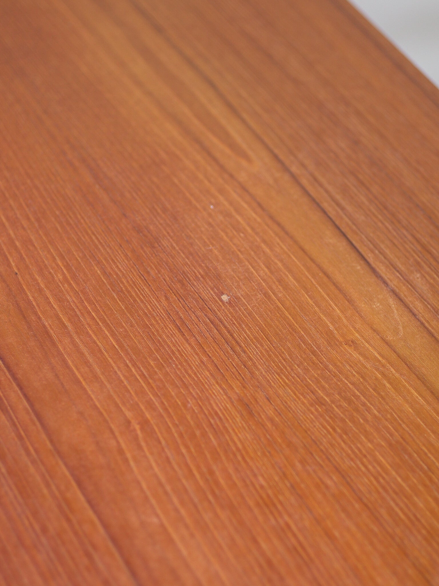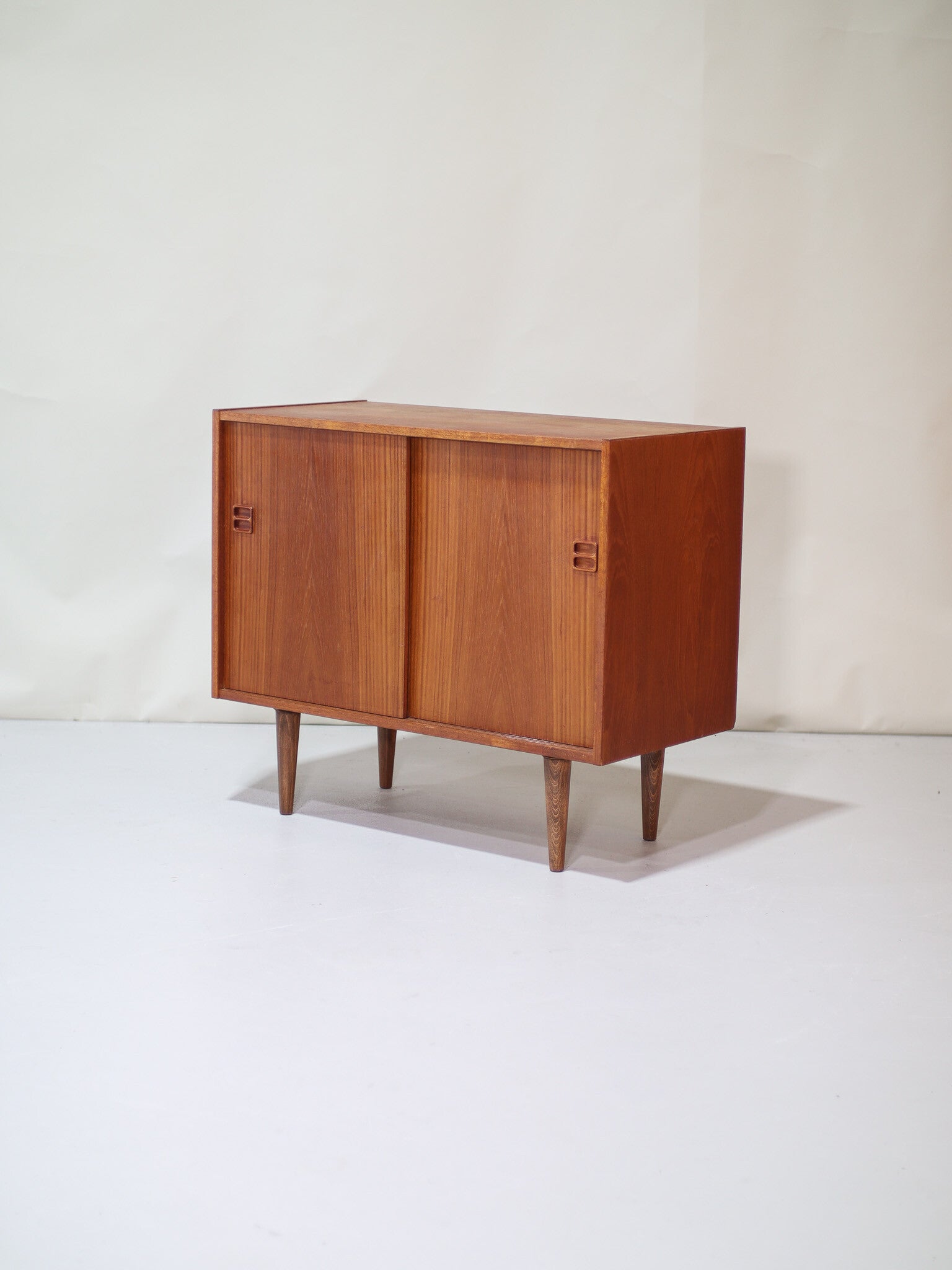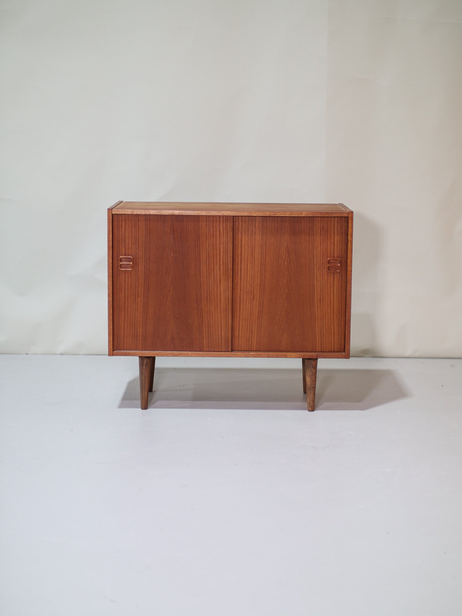 Mooi dressoir uit Denemarken, jaren '60. Dit mid-century kastje is gemaakt van teakhout en heeft twee schuifdeuren. In de kast zit één in hoogte verstelbare plank. Een praktisch en stijlvol opbergmeubel! Ook geschikt als platenkast / lp-kast of om om te bouwen tot badkamermeubel!