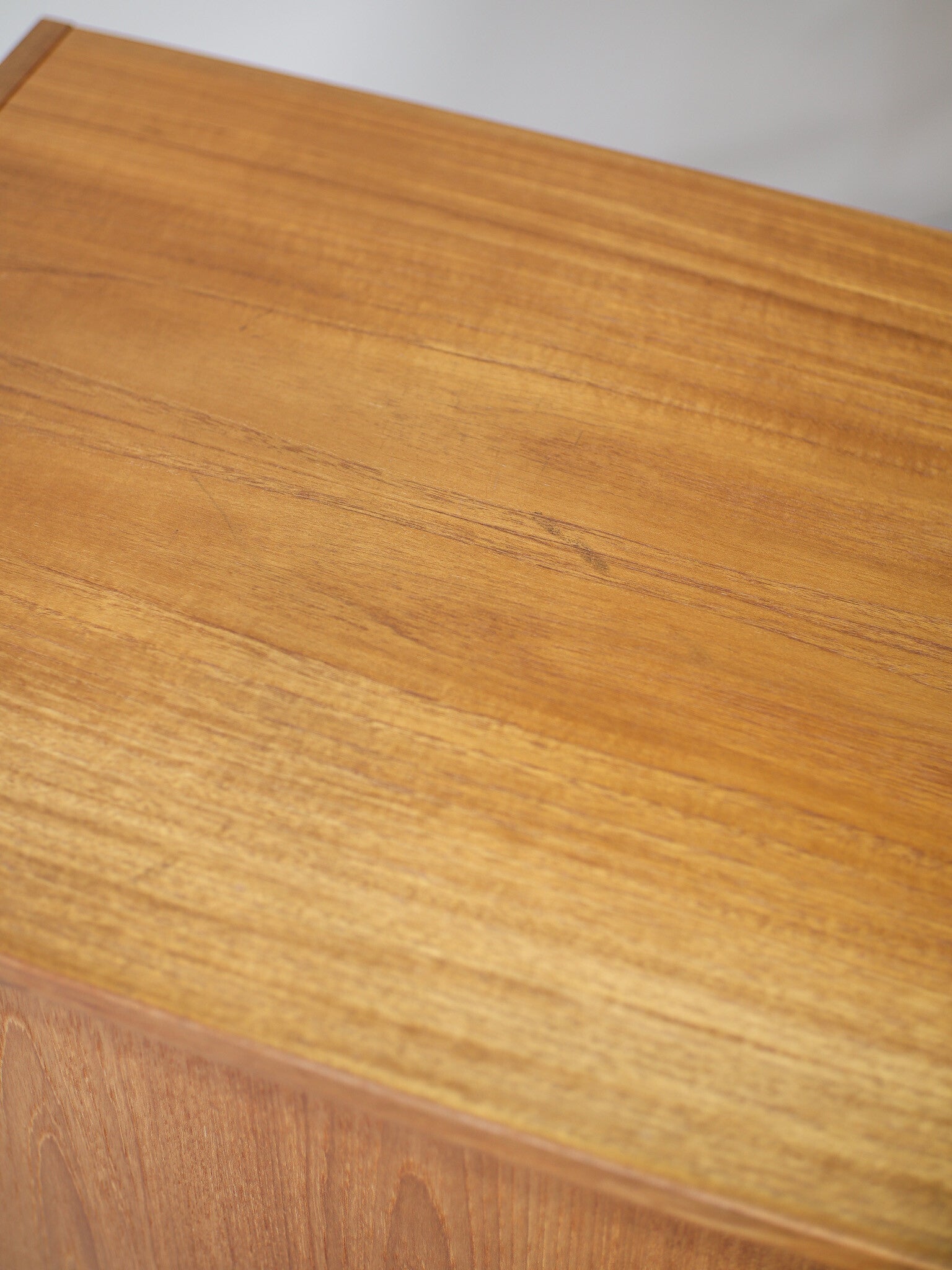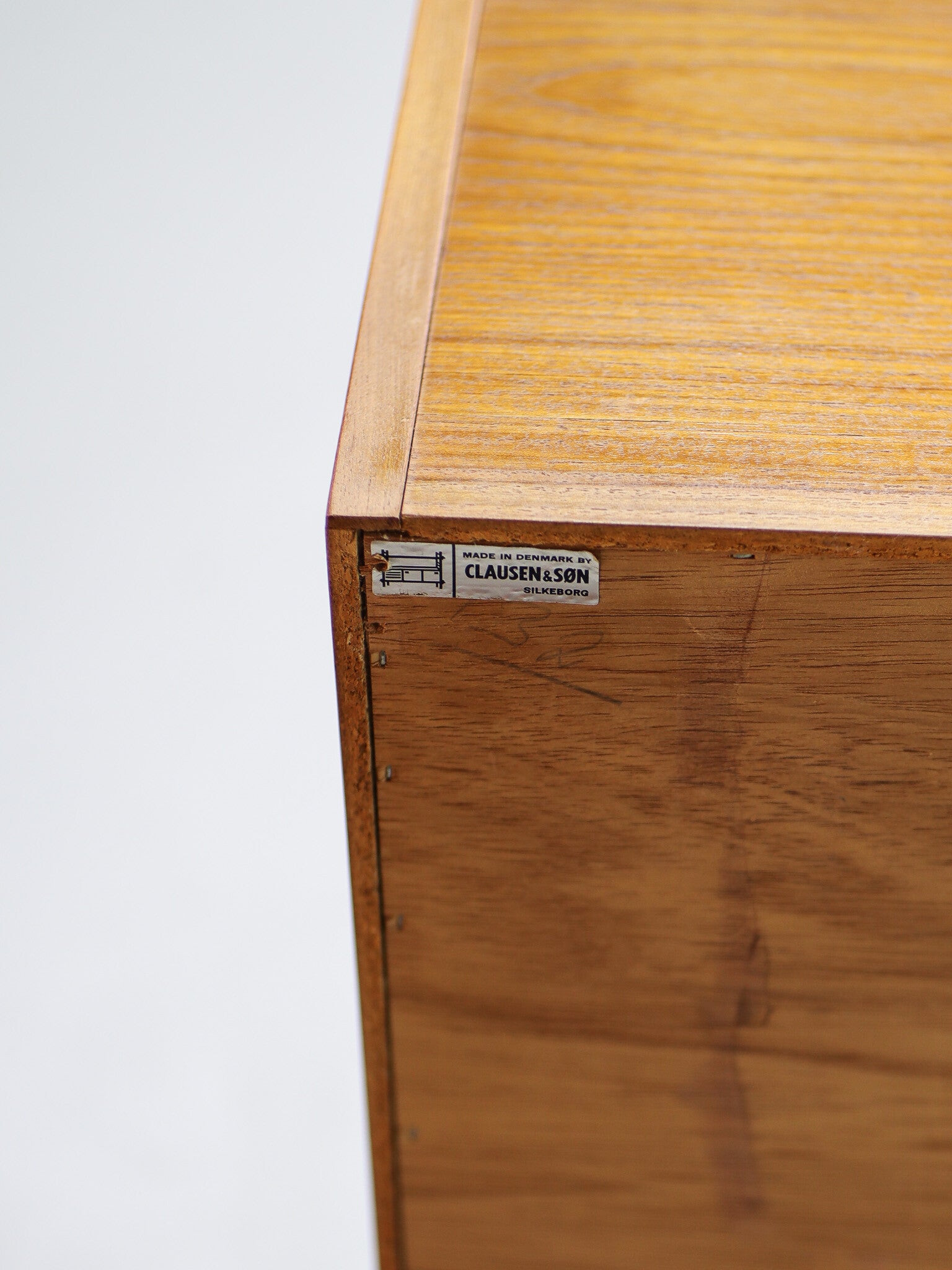 Mooie teakhouten kast geproduceerd door Clausen & Søn in Denemarken, jaren '60. Dit minimalistische Mid-century dressoir heeft twee schuifdeuren met mooie greepjes. In de kast zitten twee in hoogte verstelbare planken. Geschikt als bijvoorbeeld tv-meubel, lp kast / platenkast of bouw hem om tot badkamermeubel!