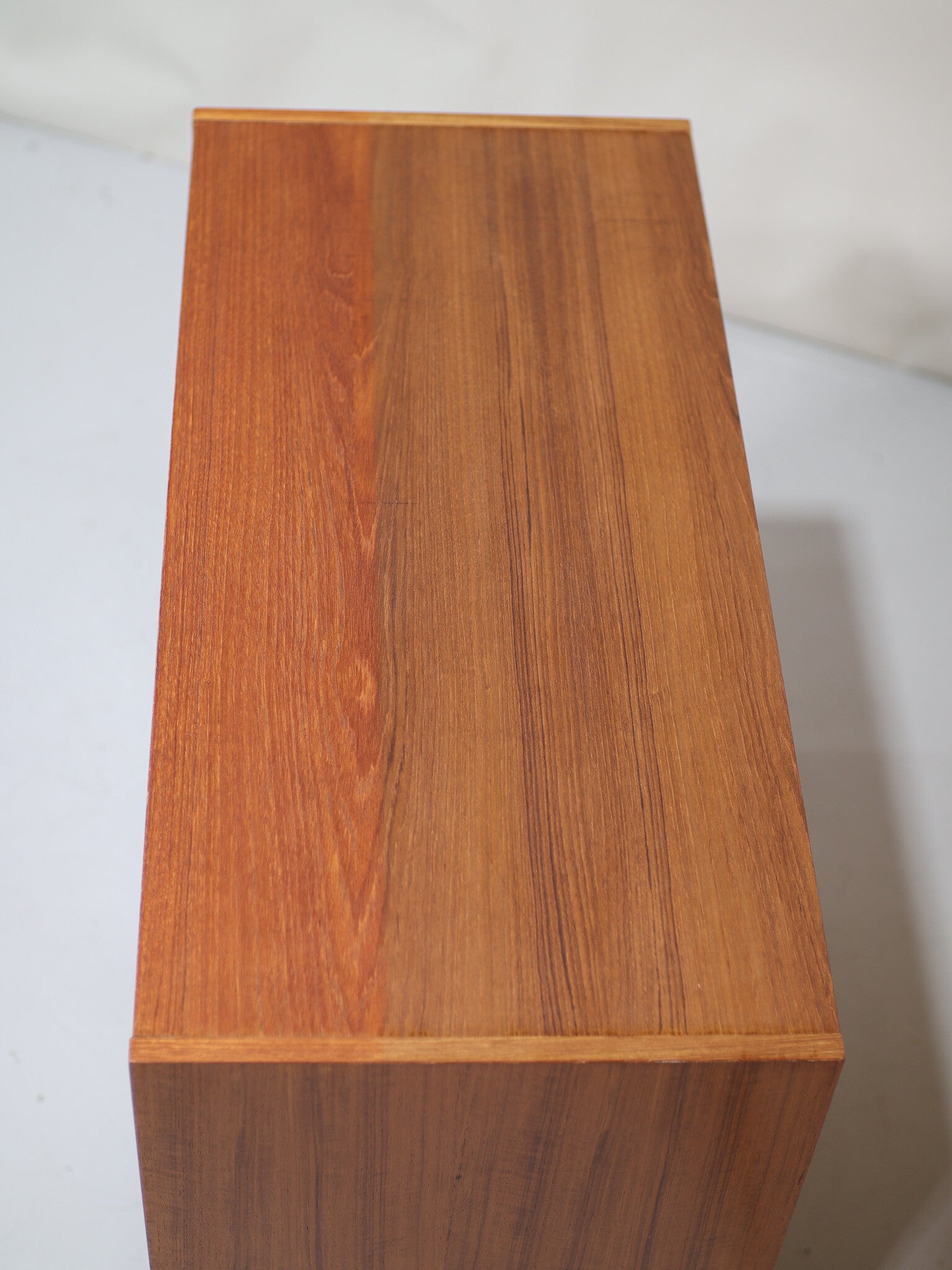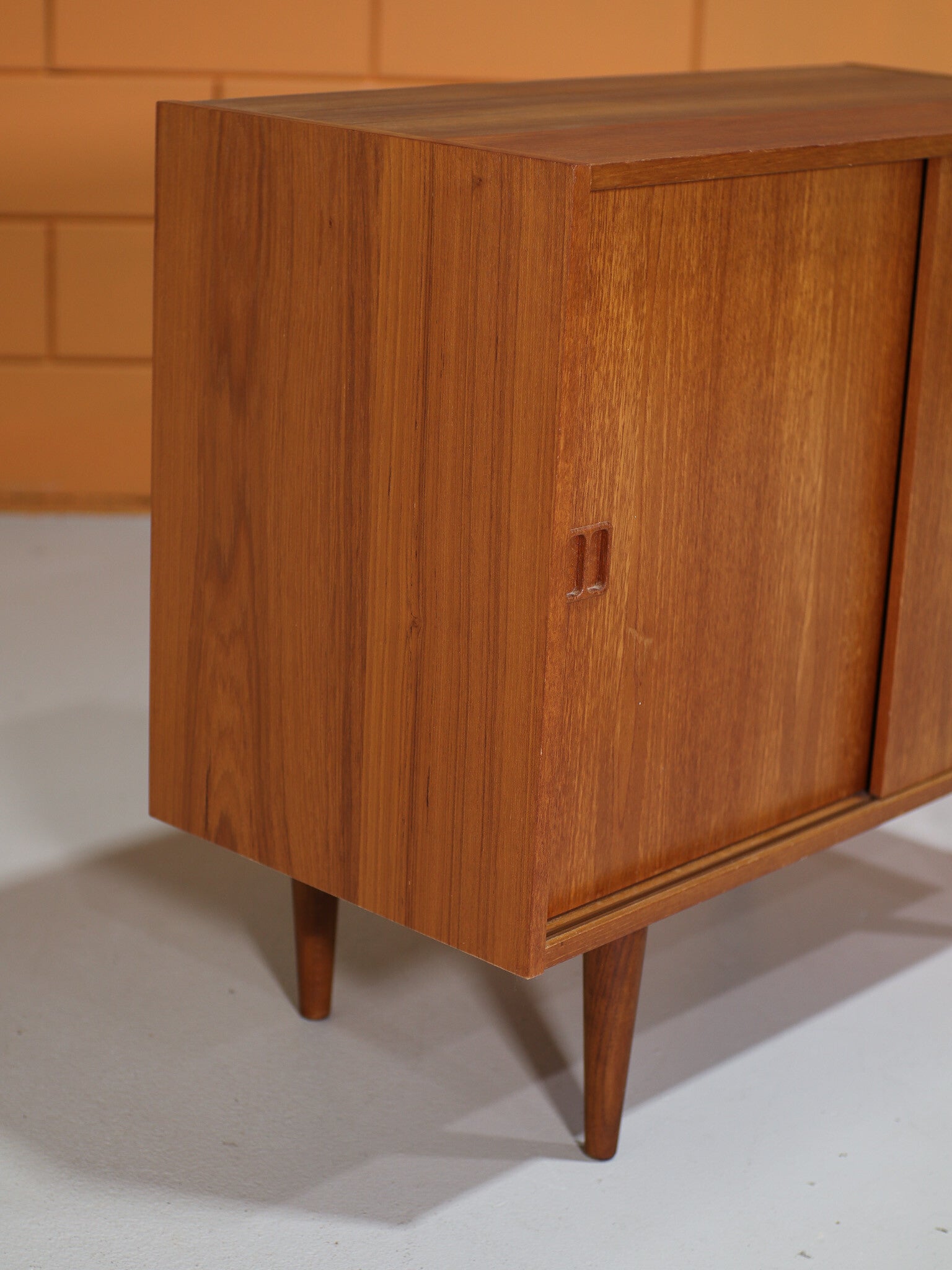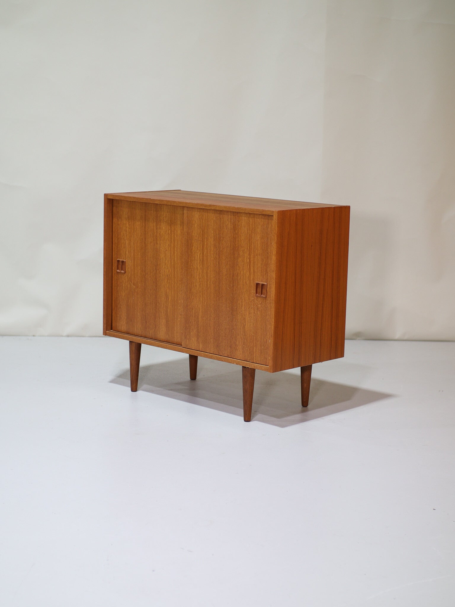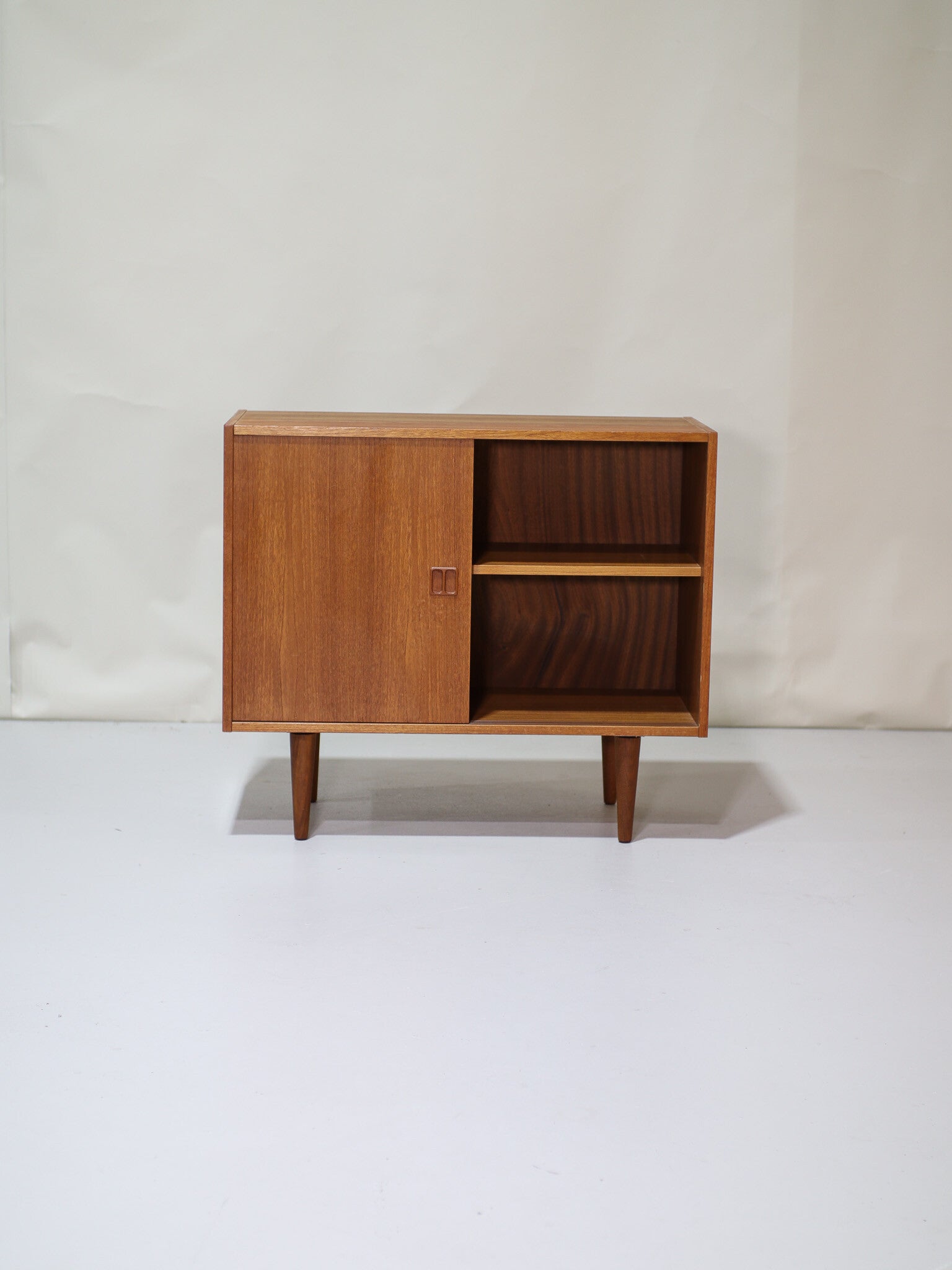 Mooi dressoir uit Denemarken, jaren '60. Dit mid-century kastje is gemaakt van teakhout en heeft twee schuifdeuren. In de kast zit één plank. Ook geschikt om om te bouwen tot badkamermeubel!