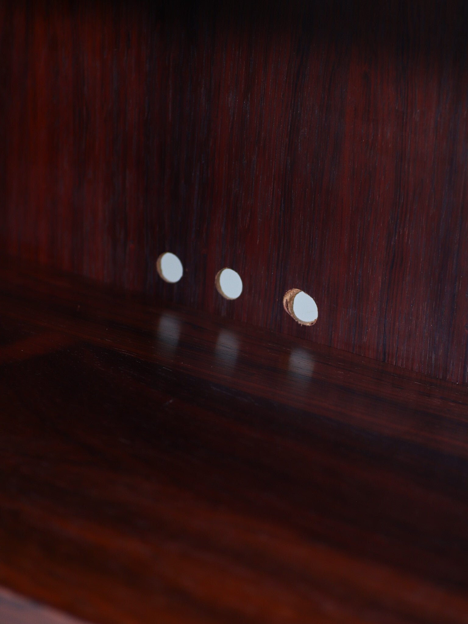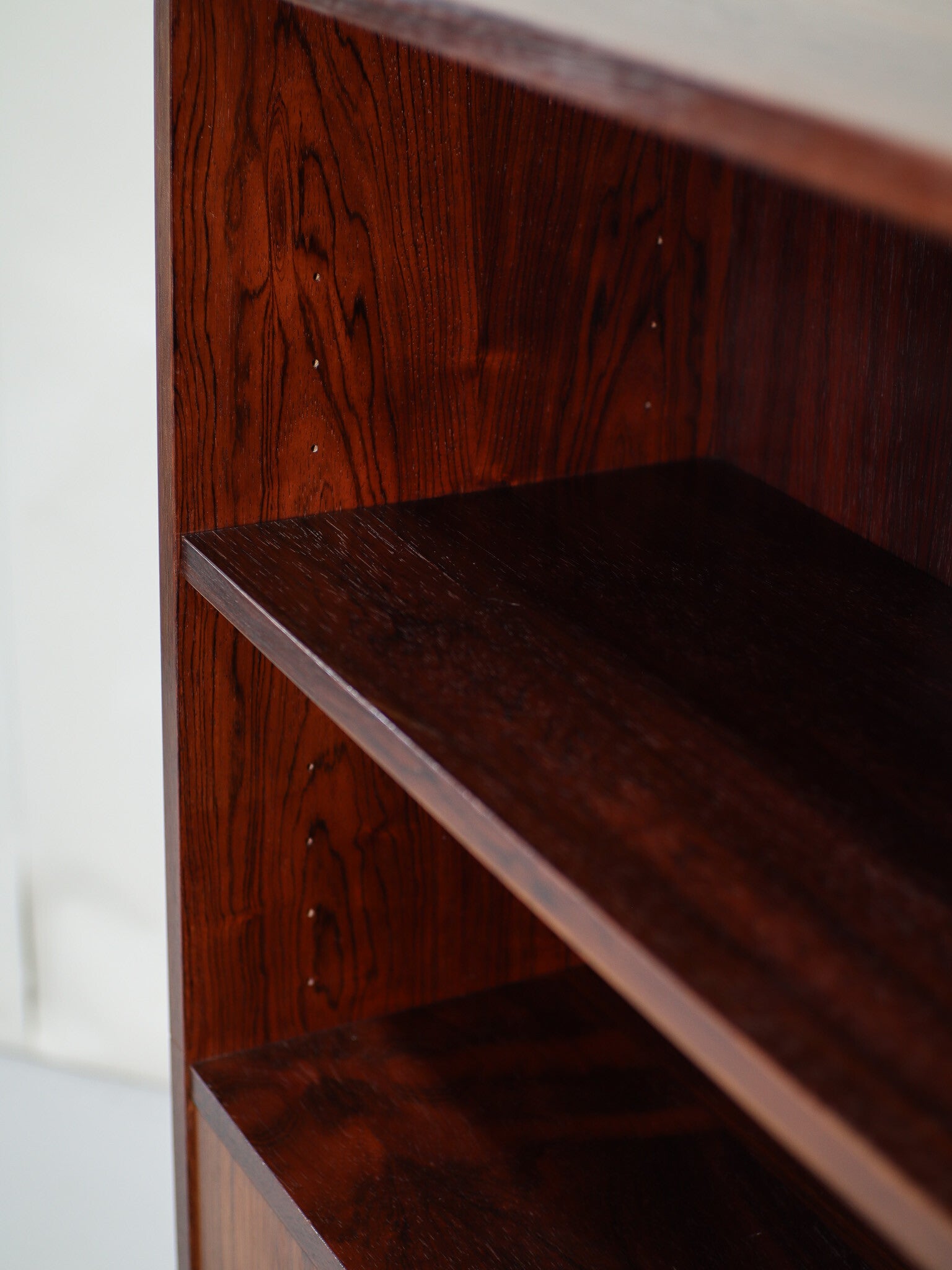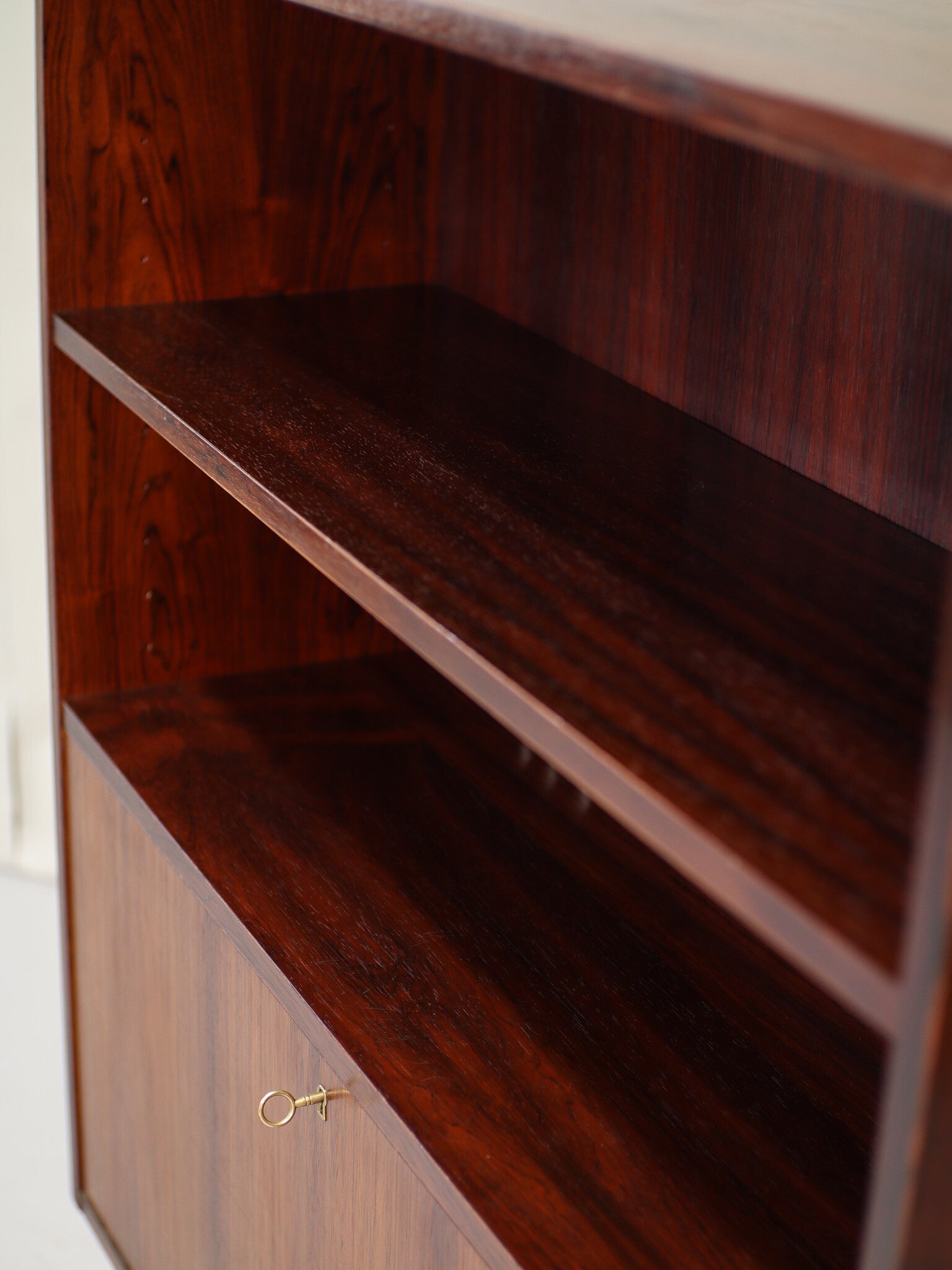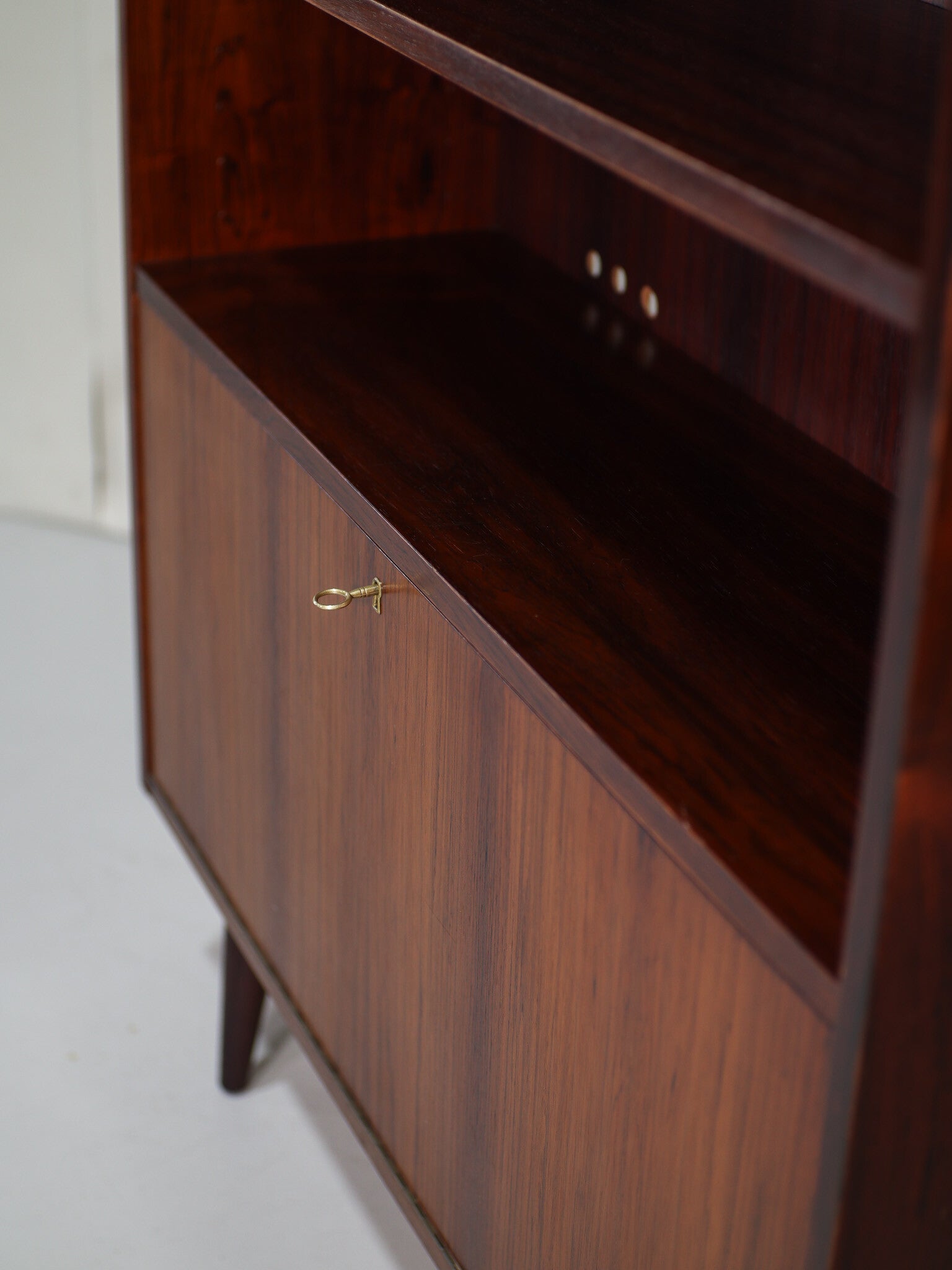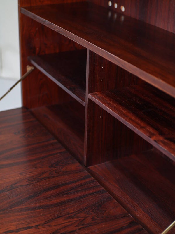 Prachtige klepkast uit Denemarken, jaren '60. Deze vintage kast is gemaakt van palissanderhout met een mooie houttekening. In het open gedeelte zit een in hoogte verstelbare plank en achter de klep twee in hoogte verstelbare planken.