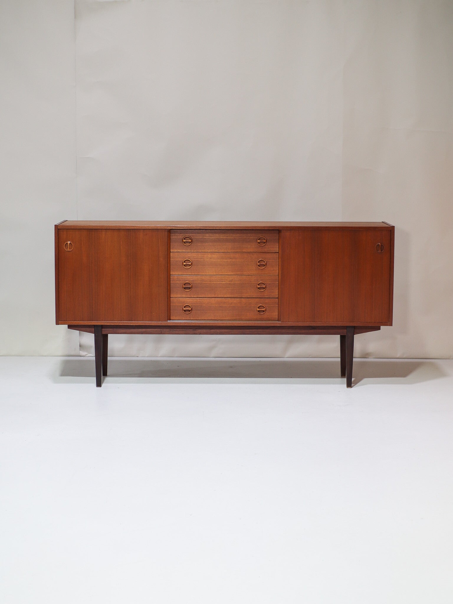Prachtig lang teakhouten dressoir uit Denemarken, jaren '60. Dit sideboard / lowboard heeft een stijlvol en minimalistisch design dankzij de mooie greepjes en de hoge poot. De kast heeft twee schuifdeuren en in het midden vier ruime lades, waarvan de bovenste met groene bekleding. In de kast zitten drie in hoogte verstelbare planken. Een ideaal opbergmeubel om onder andere te gebruiken als tv-meubel of platenkast / lp-kast.