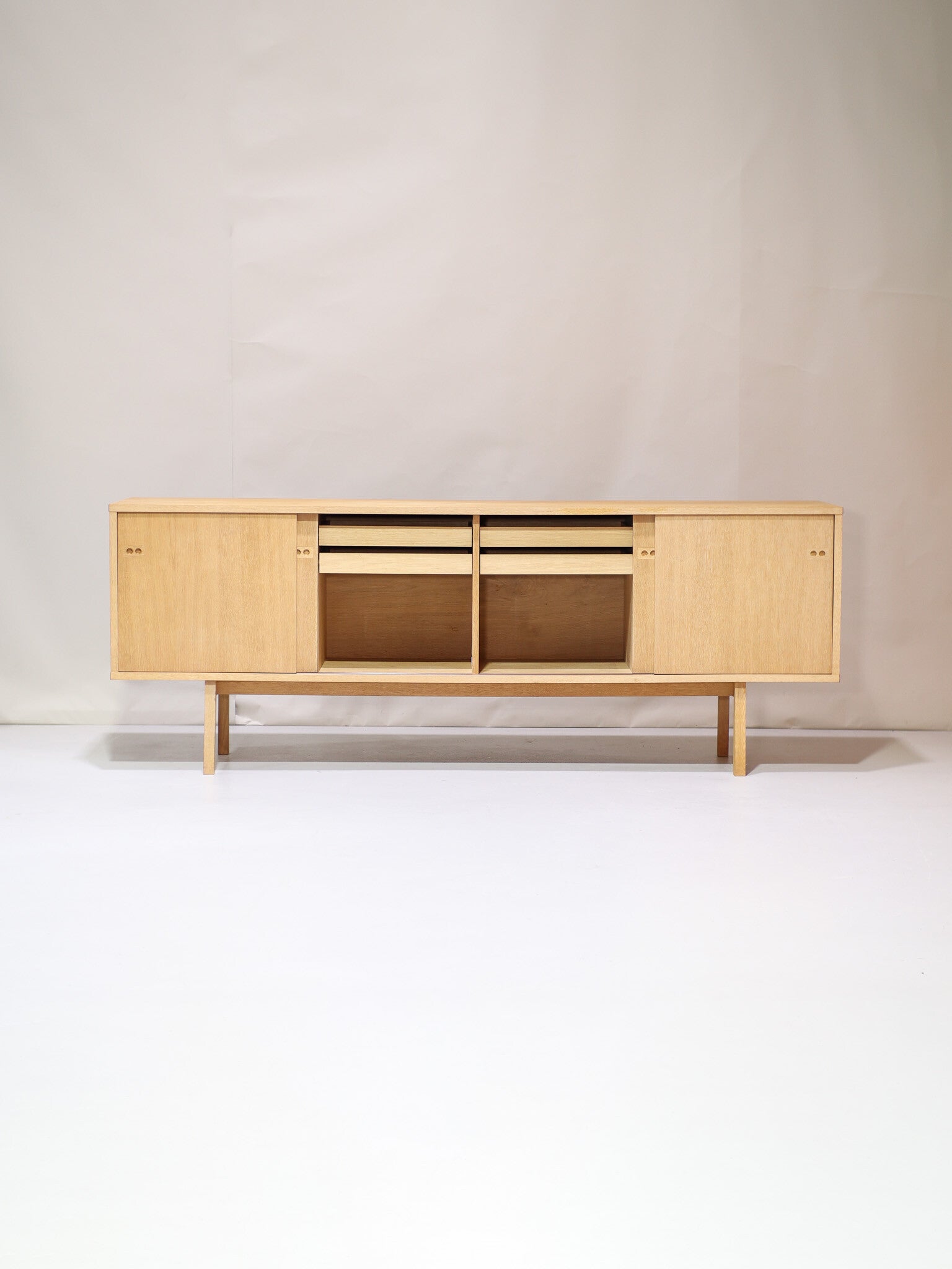Extra lang lowboard uit Denemarken, jaren '60. Vermoedelijk ontworpen door een van de bekende Deense ontwerpers Ib Kofod-Larsen of Arne Vodder. Dit lage dressoir is gemaakt van licht eikenhout. Het heeft een minimalistische en strakke vormgeving met verfijnde afwerking en details, als de ronde greepjes. In de kast zitten vier in hoogte verstelbare planken en vier lades. Een stijlvol en praktisch opbergmeubel om te gebruiken als o.a. tv-meubel of platenkast.