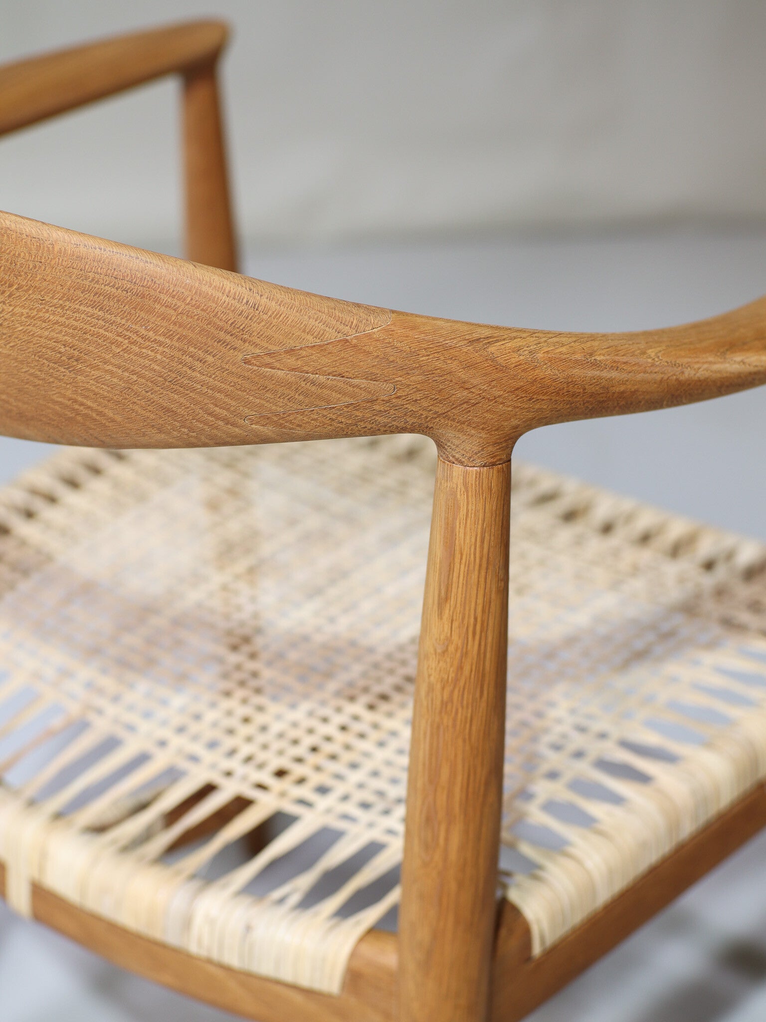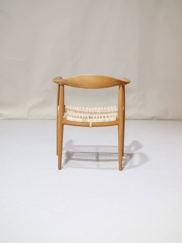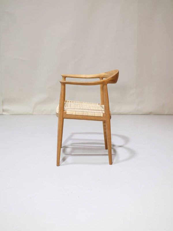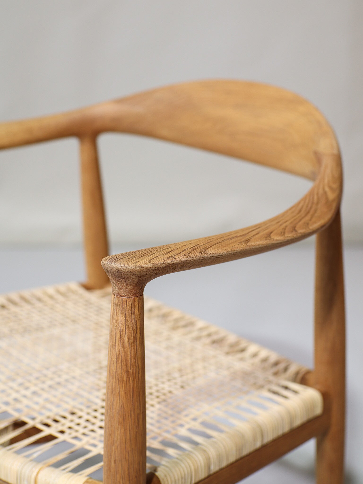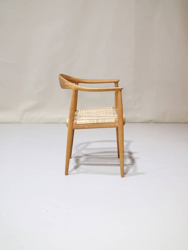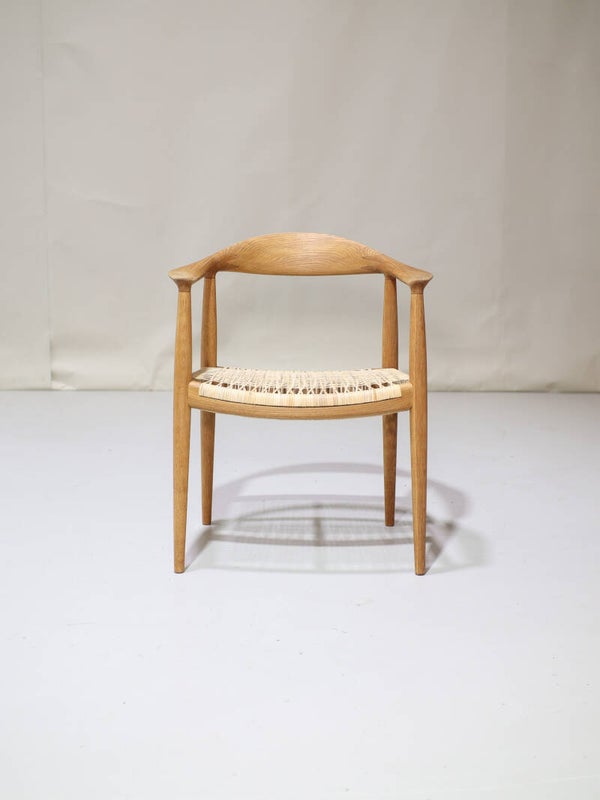 Een van de meest iconische stoelen ooit ontworpen: The Round Chair, ook wel The Chair of JH501 genoemd. Deze stoel is in 1949 ontworpen door Hans J. Wegner en geproduceerd door Johannes Hansen. De zitting is gemaakt van handgevlochten riet en het frame is vakkundig met de hand vormgegeven uit massief eikenhout. Middels een prachtige houtverbinding zijn de arm- en rugleuning één doorlopend, halfrond geheel. Hierdoor zit er eigenlijk geen achterkant aan deze stoel; het is een meesterwerk vanuit elke hoek. Wegner wilde een vereenvoudigde en typisch Deens stoel maken met een zorgvuldig geperfectioneerde vorm en verhouding, met The Chair als resultaat.