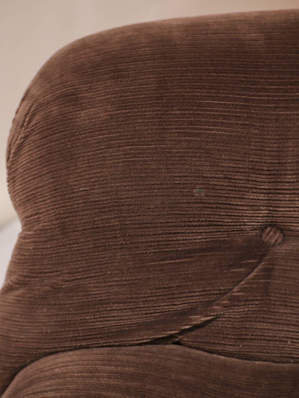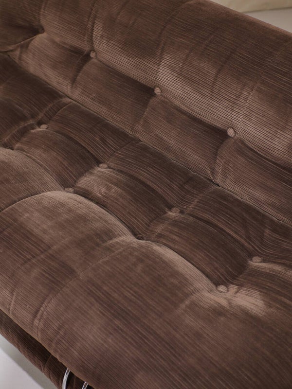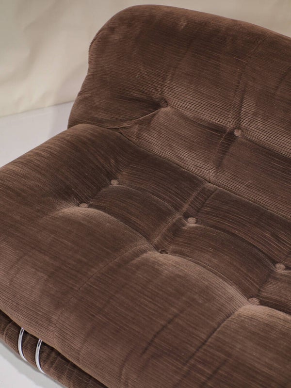 Prachtige vintage 'Soriana' 2 / 2,5-zits bank ontworpen door Afra & Tobia Scarpa voor Cassina, Italië jaren '70. Deze gecapitonneerde bank heeft een stijlvol, luxe en uitnodigend design met plooien, knopen en een verchroomd stalen frame. De bank heeft een heerlijk zitcomfort en is bekleed met de zachte, originele bruine fluwelen ribstof / corduroy.