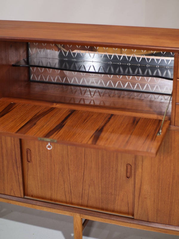 Mooi dressoir / highboard uit Denemarken, jaren '60. Deze vintage barkast is gemaakt van teakhout. Het heeft prachtig vormgegeven details als de schuine randen, unieke poot en stijlvolle grepen. De indeling is speels, met bovenin zes lades en een klep met daarachter een bargedeelte met spiegel en een plank voor o.a. glazen en flessen. Achter de schuifdeuren onderin zitten drie in hoogte verstelbare planken. Kortom: een unieke eyecatcher van topkwaliteit, dat enorm veel opbergruimte biedt!