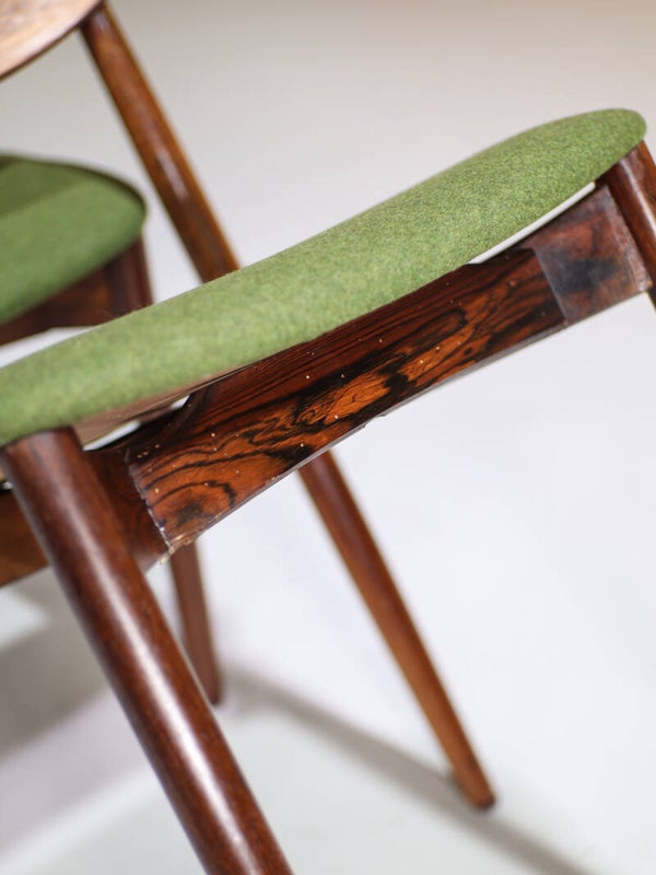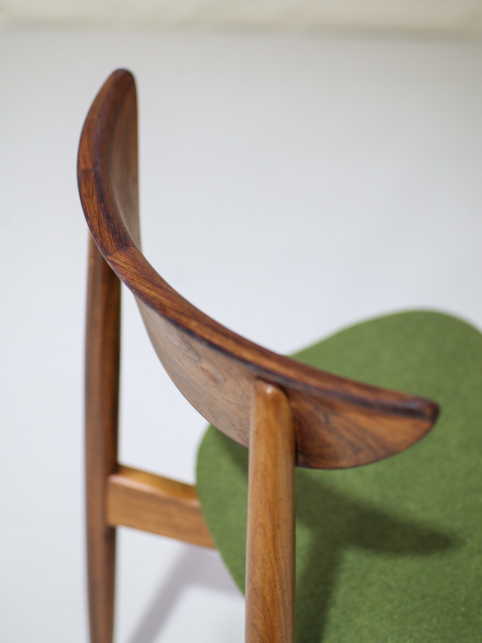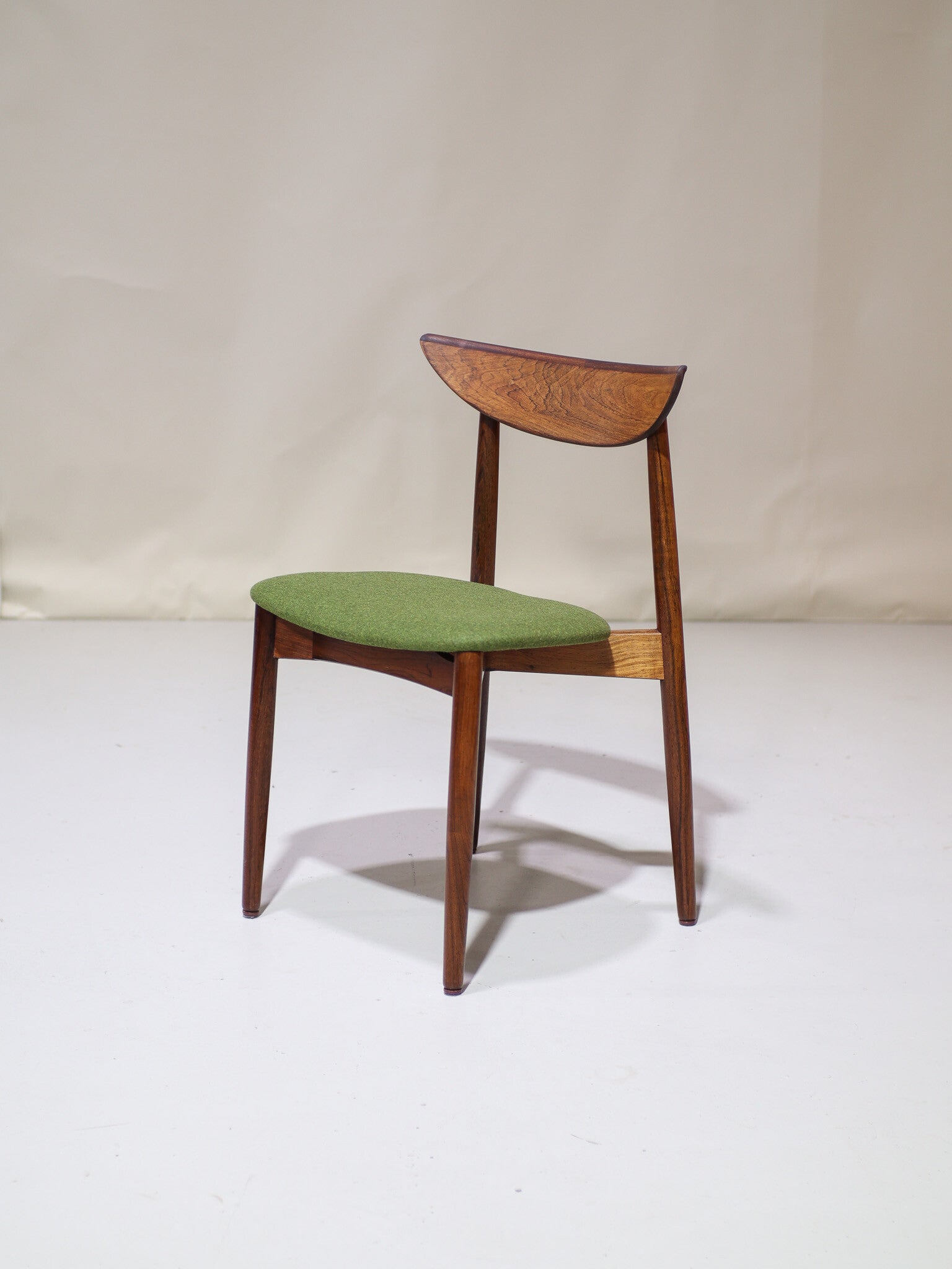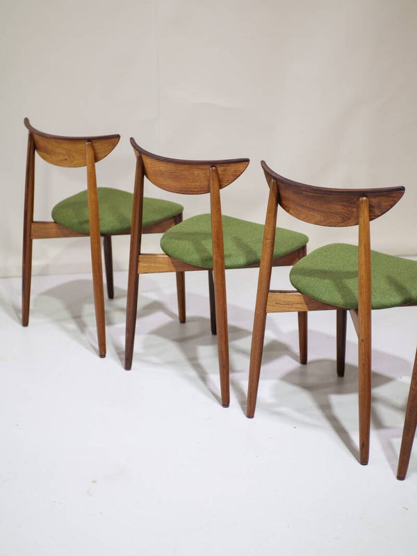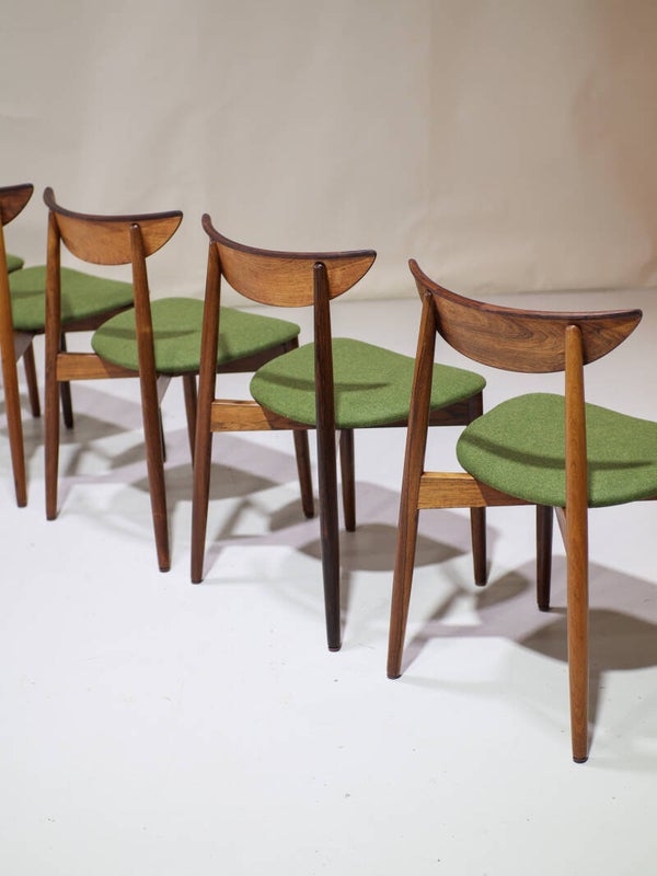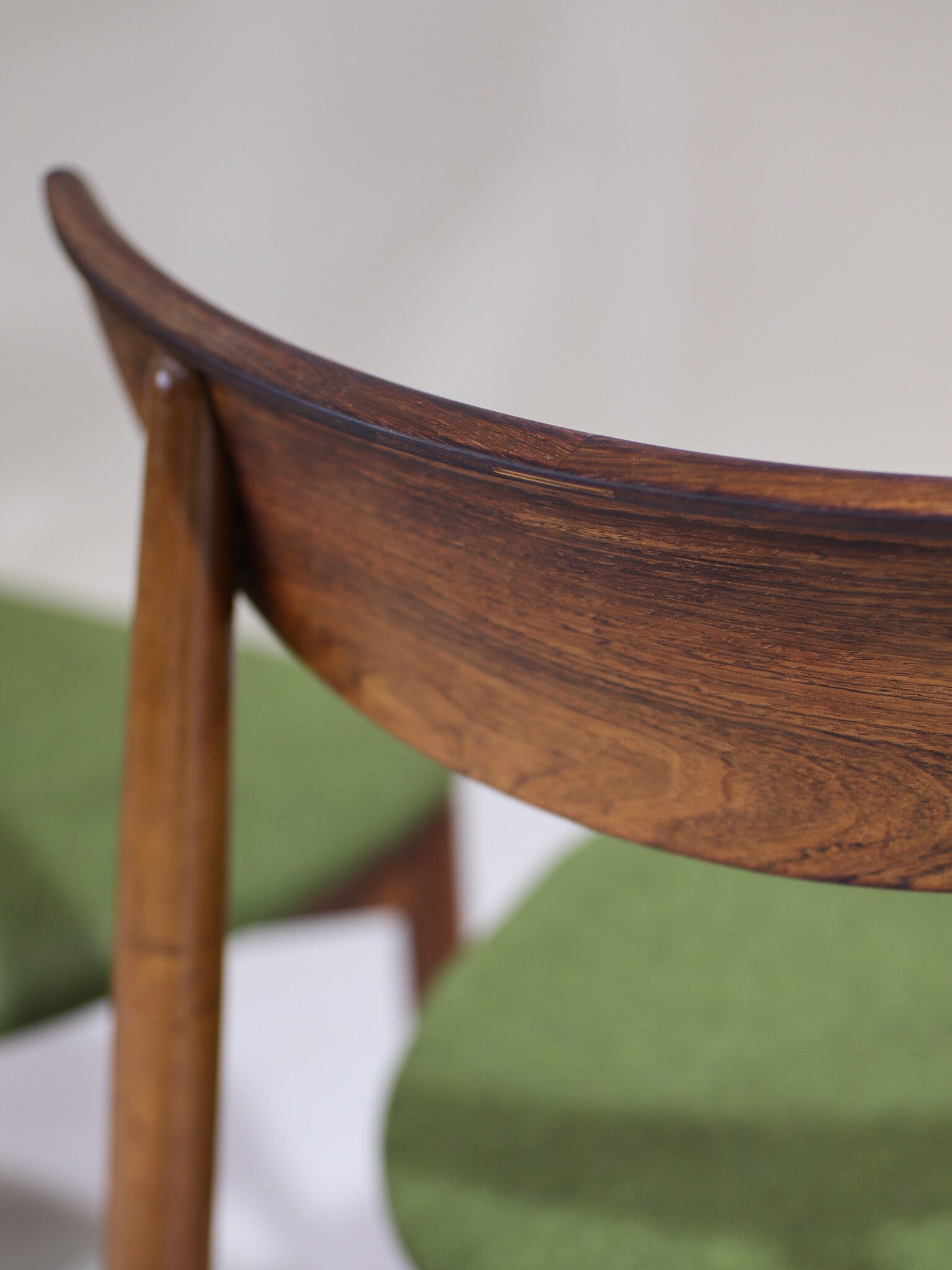 Een set van 6 eetkamerstoelen model 58 ontworpen door Harry Østergaard voor Randers Møbelfabrik in Denemarken, jaren '60. Deze stoelen zijn gemaakt van palissanderhout met een prachtige houttekening. De rugleuningen hebben een stijlvolle vormgeving met een gebogen rand en mooie houtverbinding. De zittingen zijn opnieuw bekleed met een wollen vilt kwaliteitsstof in een mooie groene kleur.