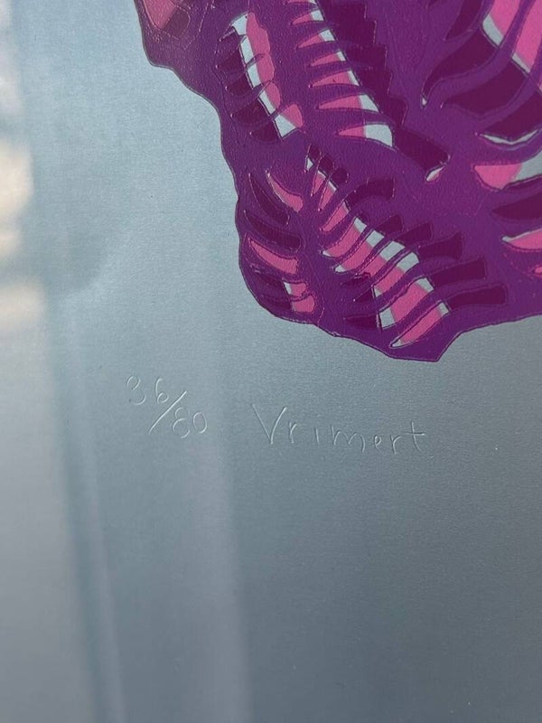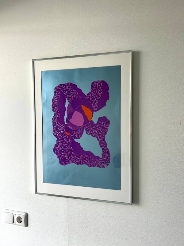 Prachtige lithografie uit Denemarken gesigneerd door Esben Rimfaxe en genummerd '36/80 Vrimert'. Vermoedelijk gemaakt in de jaren '80. Deze litho met abstracte vormen in levendige paars, roze en oranje tinten is gemaakt in gelimiteerde oplage van slechts 80 exemplaren. De grijsblauwe achtergrond heeft een metallic look, waardoor het in elk licht anders lijkt. Dit maakt het echt een eyecatcher! De litografie zit in een nieuwe aluminium lijst.