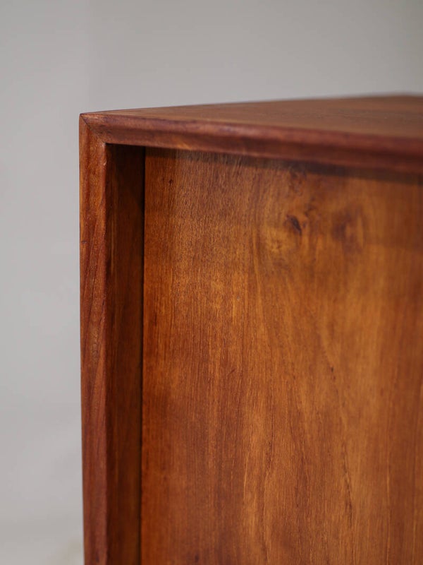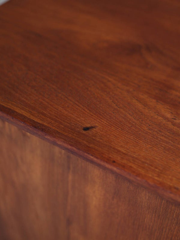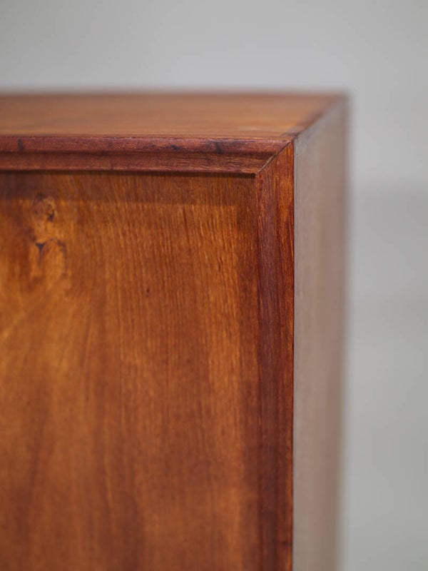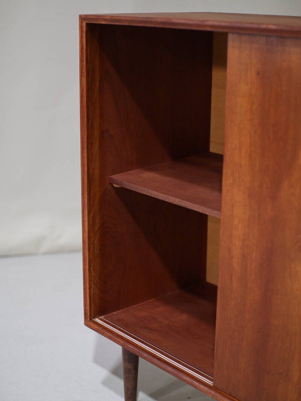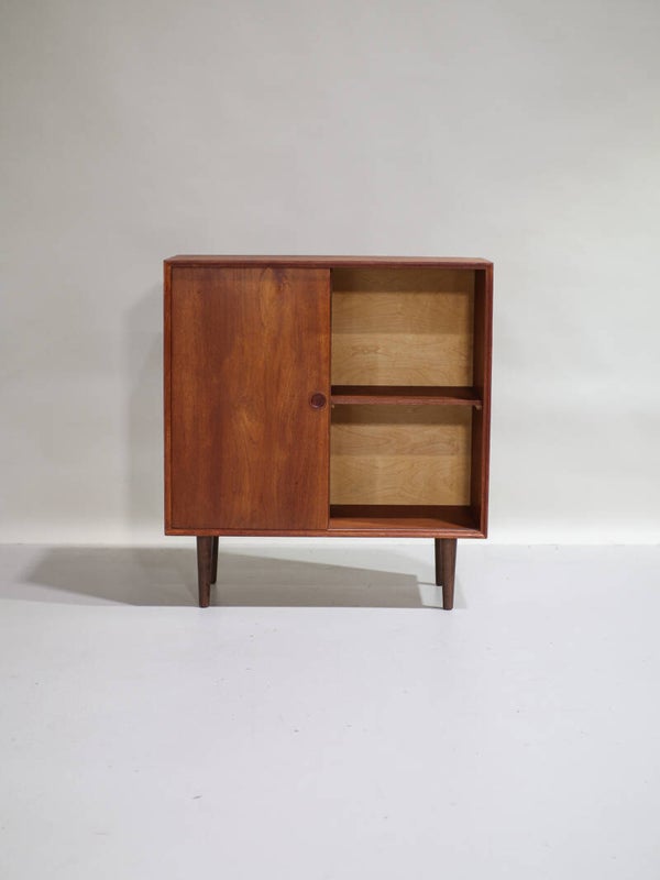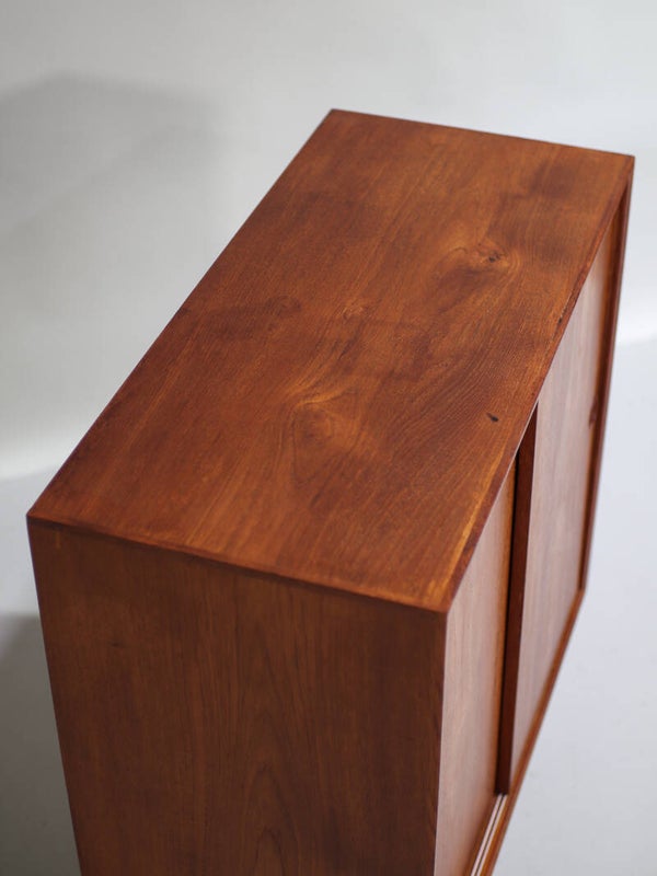 Prachtig smal dressoir uit Denemarken jaren '60. Dit kastje is gemaakt van teakhout en heeft twee schuifdeuren met stijlvolle ronde grepen die doen denken aan de ontwerpen van Børge Mogensen. Ook de rand van de kast is prachtig vormgegeven. In de kast zitten twee planken.