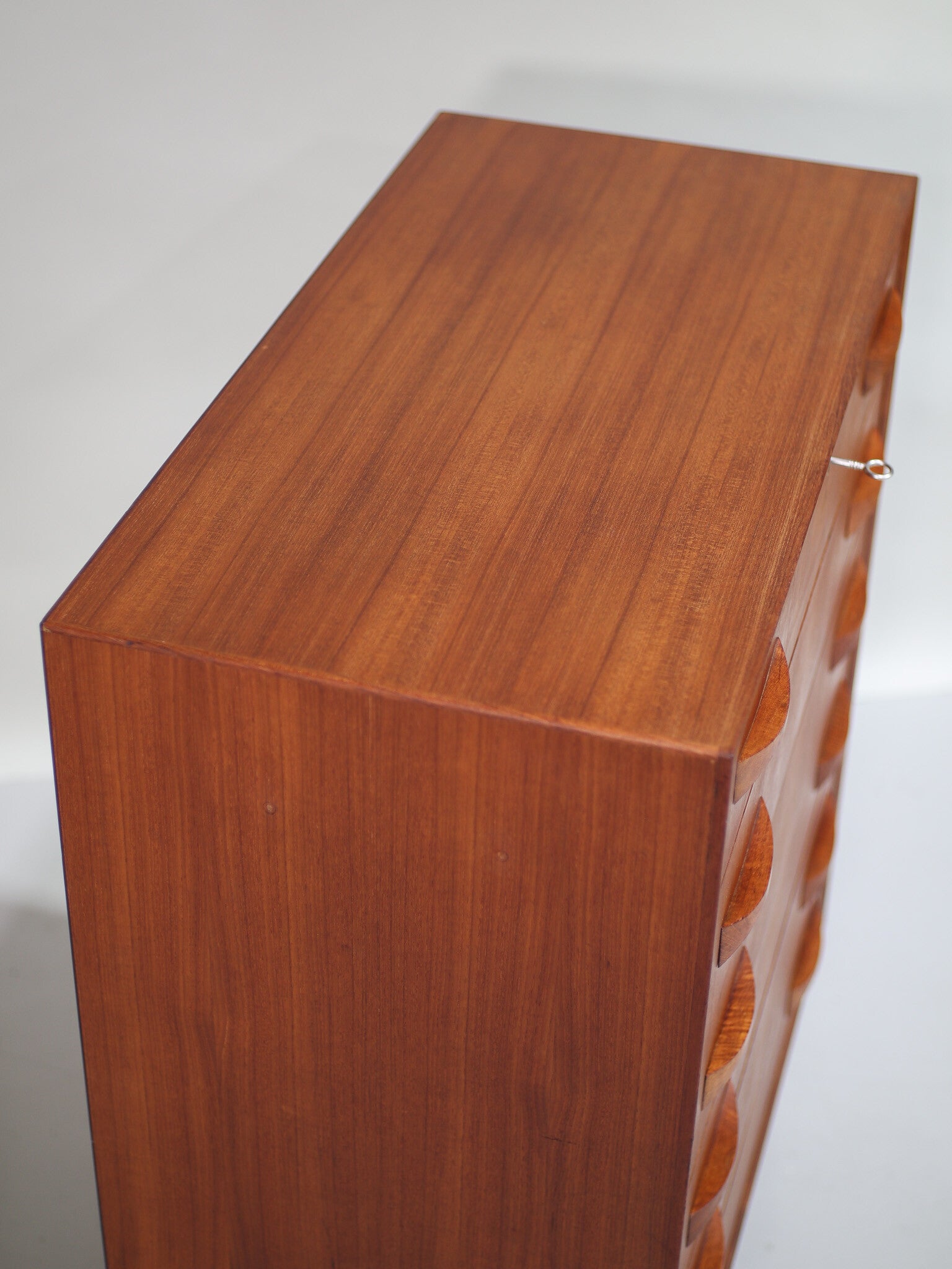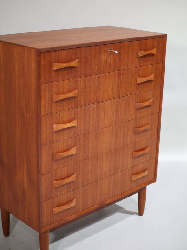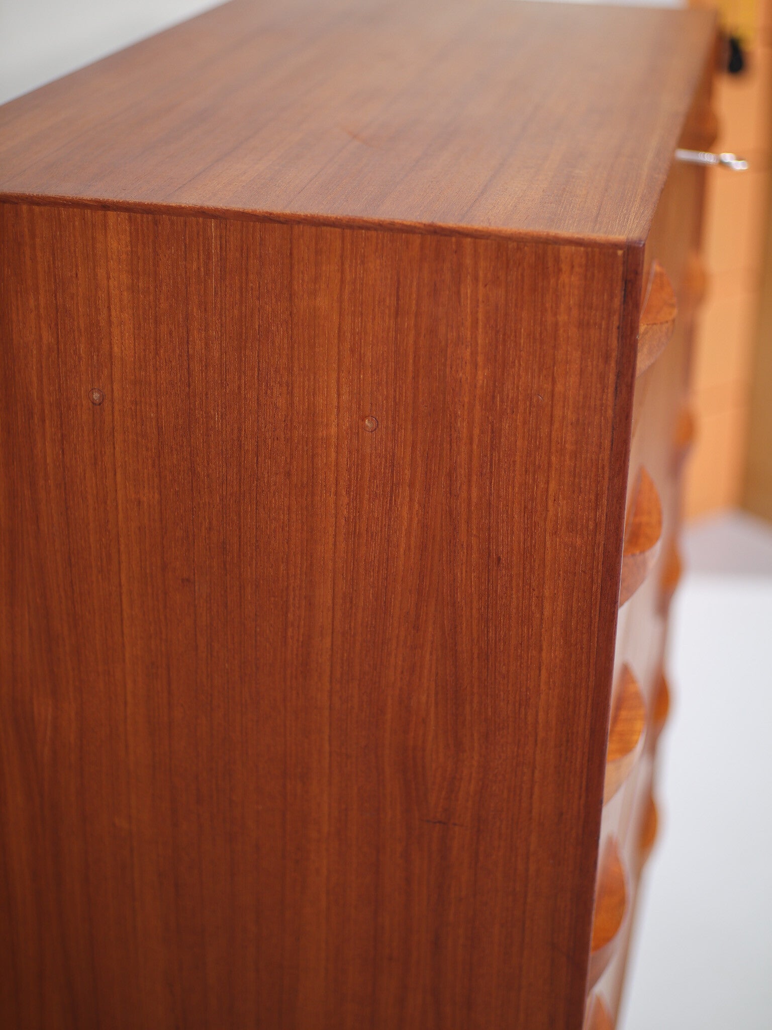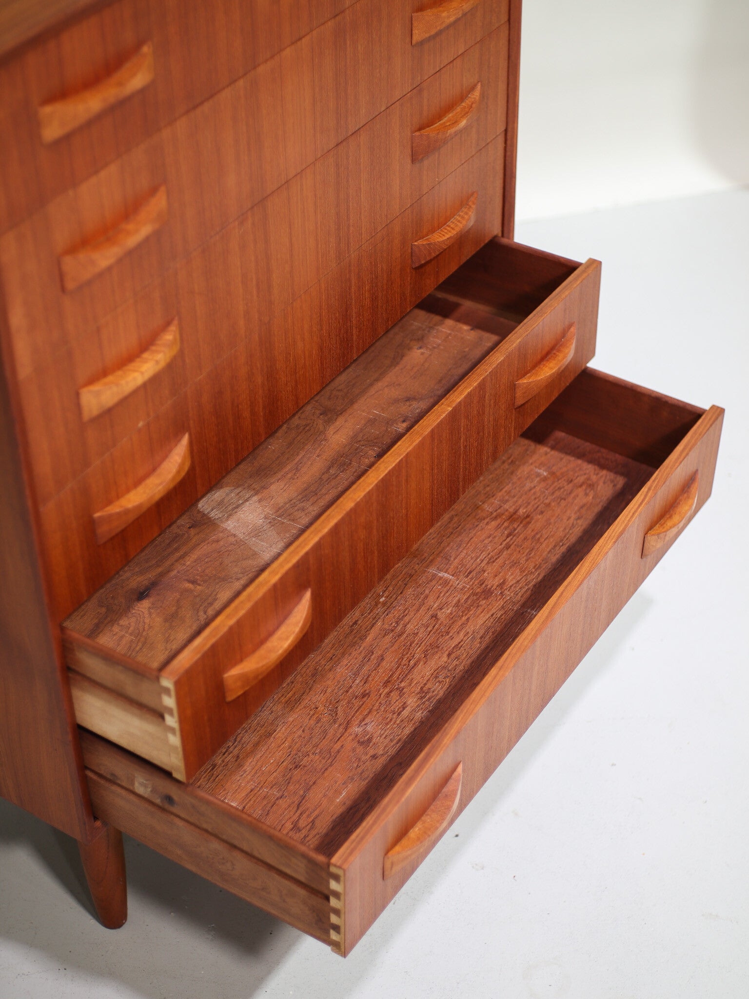 Prachtige hoge ladekast uit Denemarken, jaren '60. Deze kast is gemaakt van teakhout en heeft zes lades met unieke handgrepen. Een hoog kwalitatief, stijlvol en minimalistisch design met een mooie afwerking.