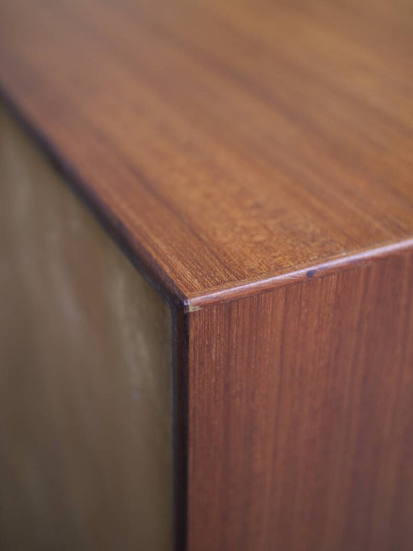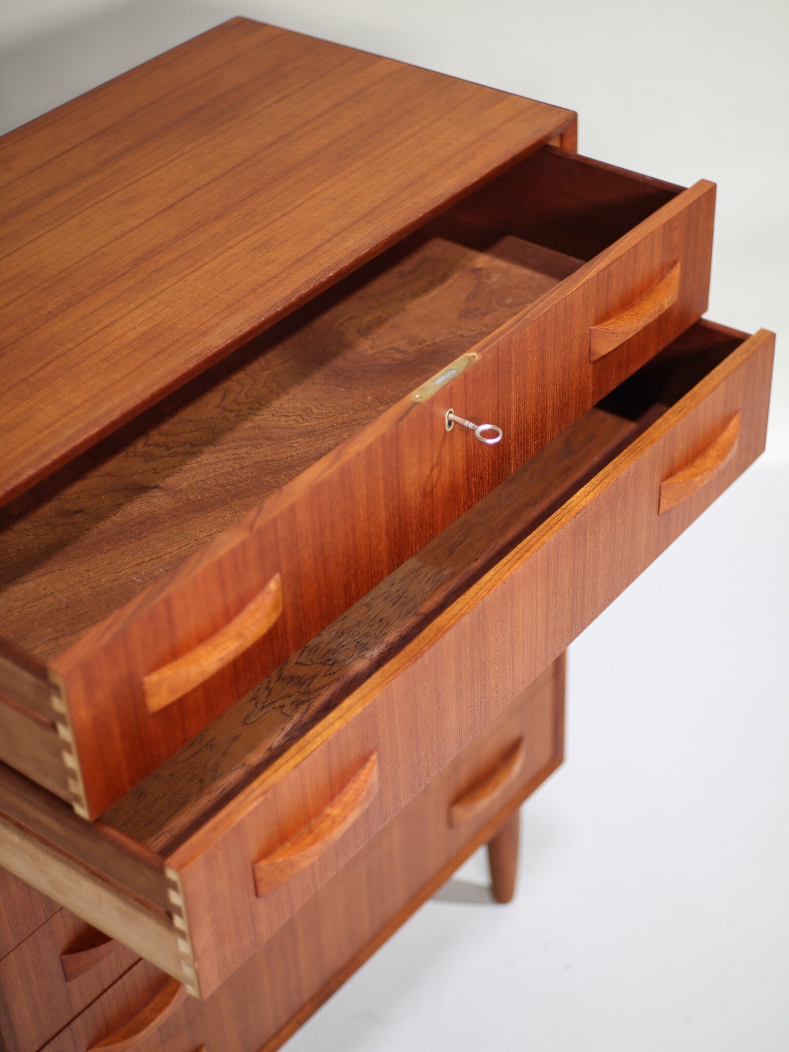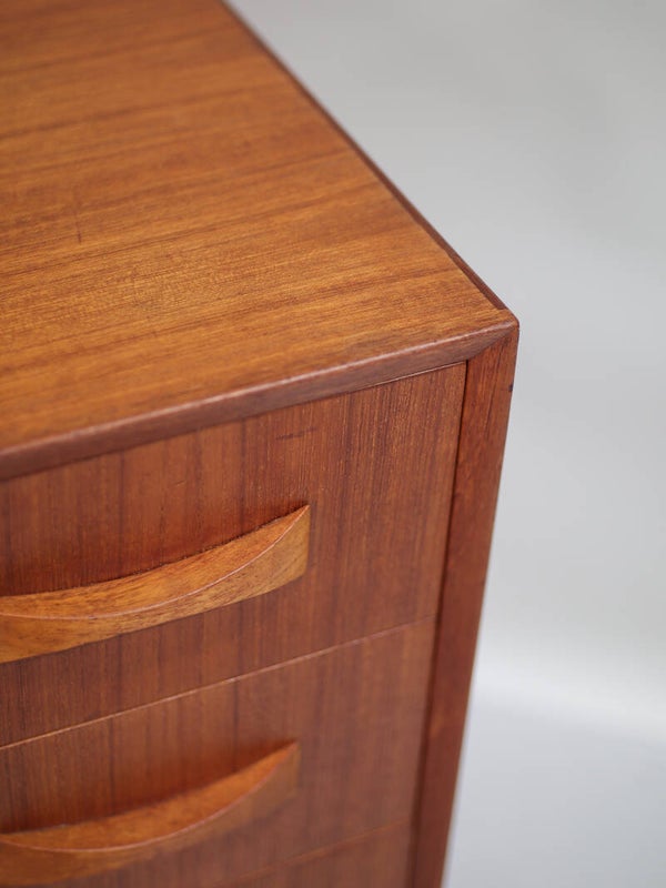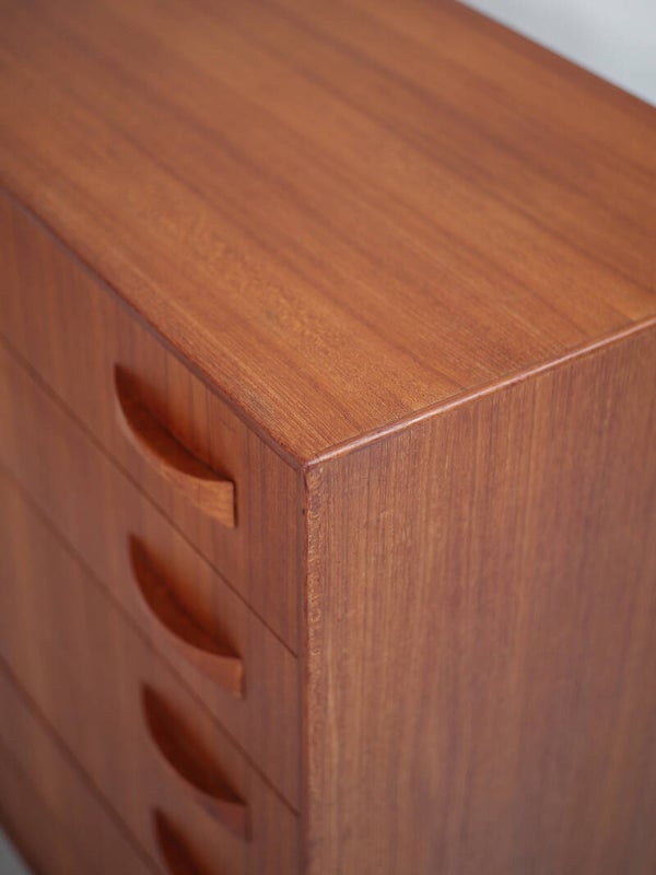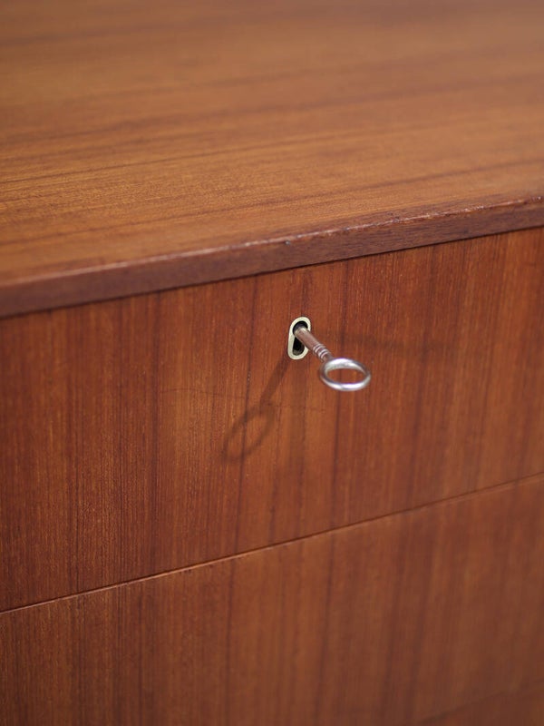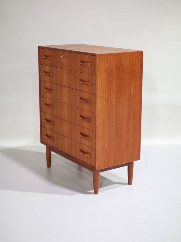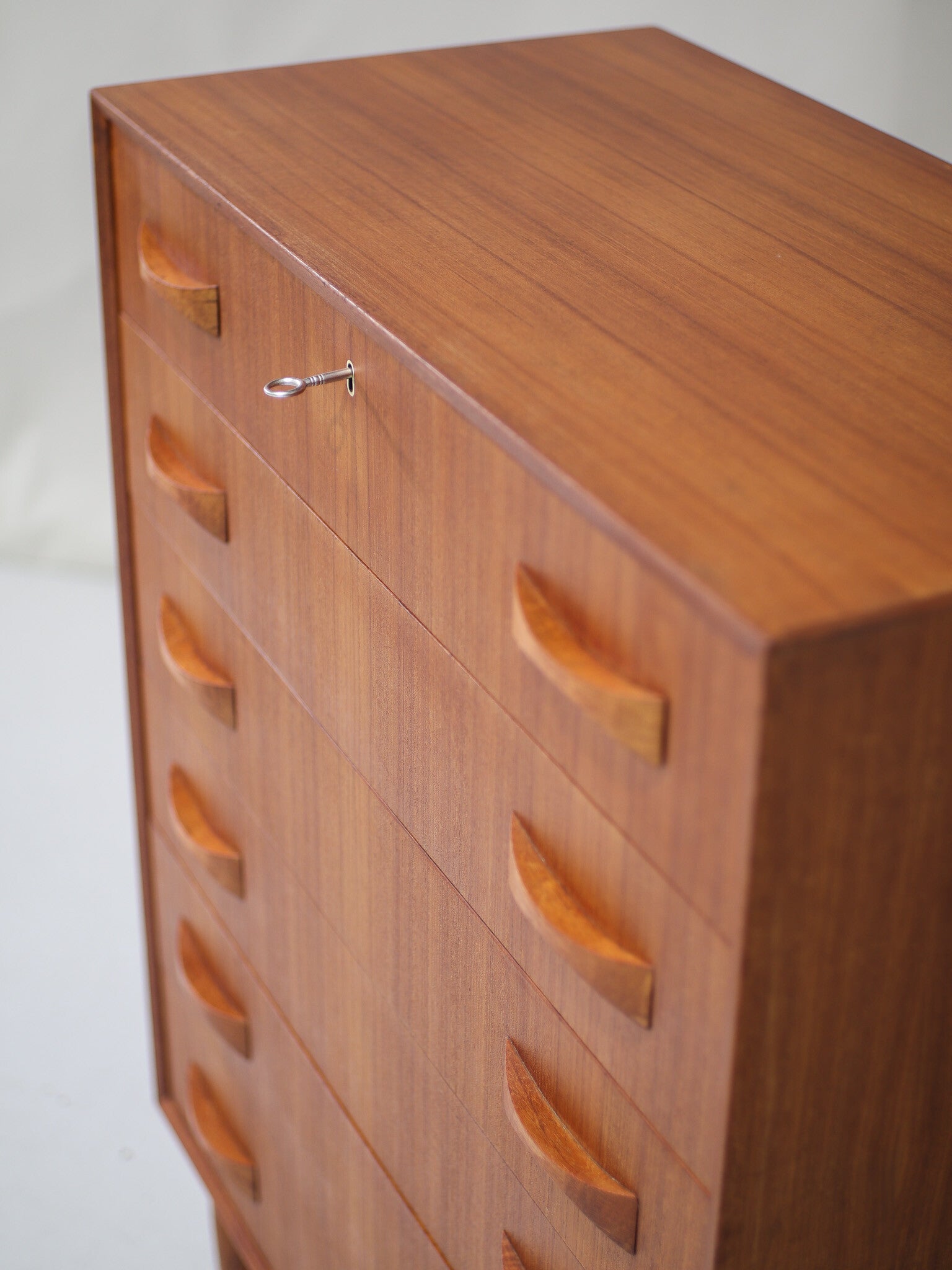 Prachtige hoge ladekast uit Denemarken, jaren '60. Deze kast is gemaakt van teakhout en heeft zes lades met unieke handgrepen. Een hoog kwalitatief, stijlvol en minimalistisch design met een mooie afwerking.