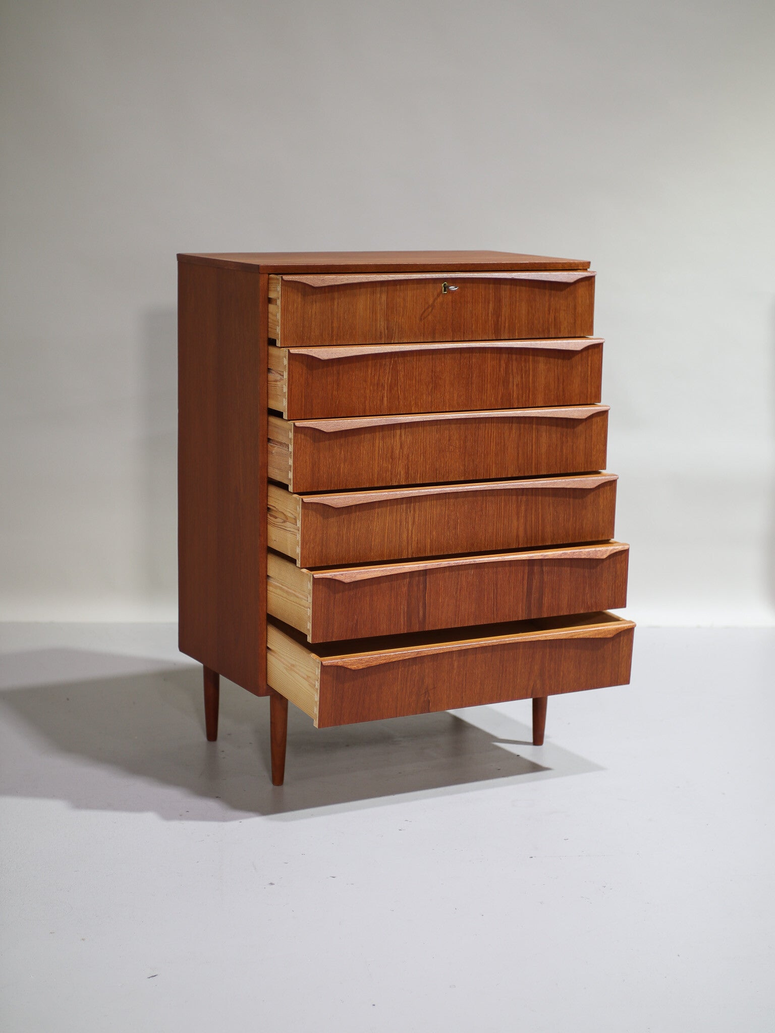 Prachtige ladekast van hoge kwaliteit uit Denemarken, jaren '60. Deze kast is gemaakt van teakhout en heeft zes ruime lades. De lange houten handgrepen zijn erg fraai vormgegeven.