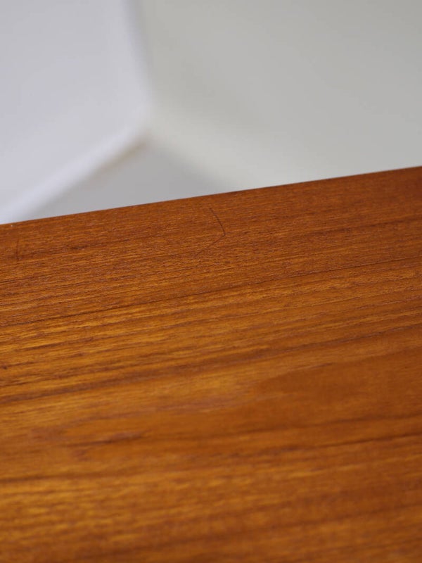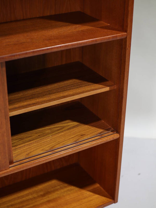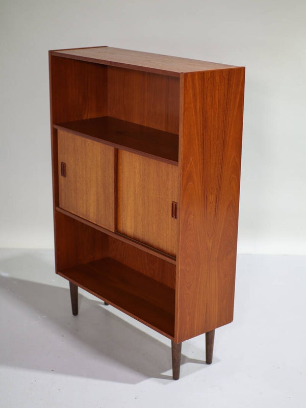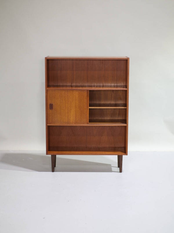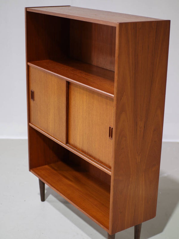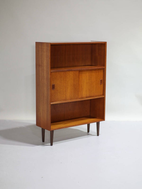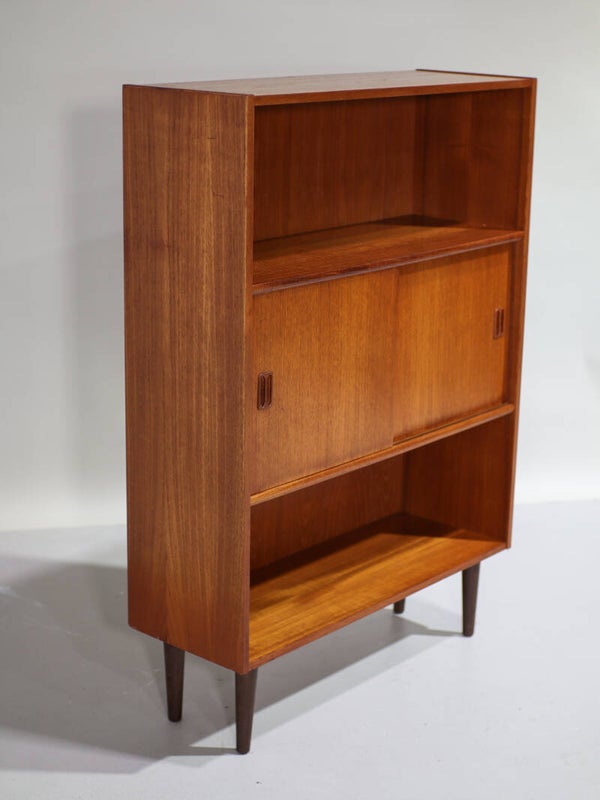 Mooie vintage boekenkast uit Denemarken, jaren '60. Deze kast is gemaakt van teakhout. De kast is speels en praktisch ingedeeld met twee open vakken en in het midden een gesloten gedeelte met twee schuifdeuren en daarachter een plank.