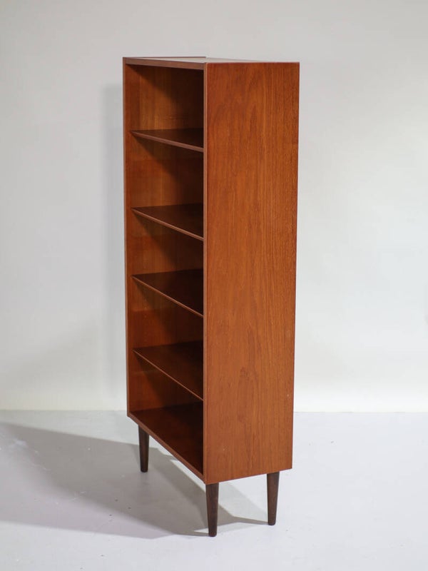 Smalle hoge boekenkast ontworpen door Poul Hundevad in Denemarken, jaren '60. Deze open vakkenkast is gemaakt van teakhout. Een prachtig minimalistisch ontwerp met schuin afgewerkte en in hoogte verstelbare planken.