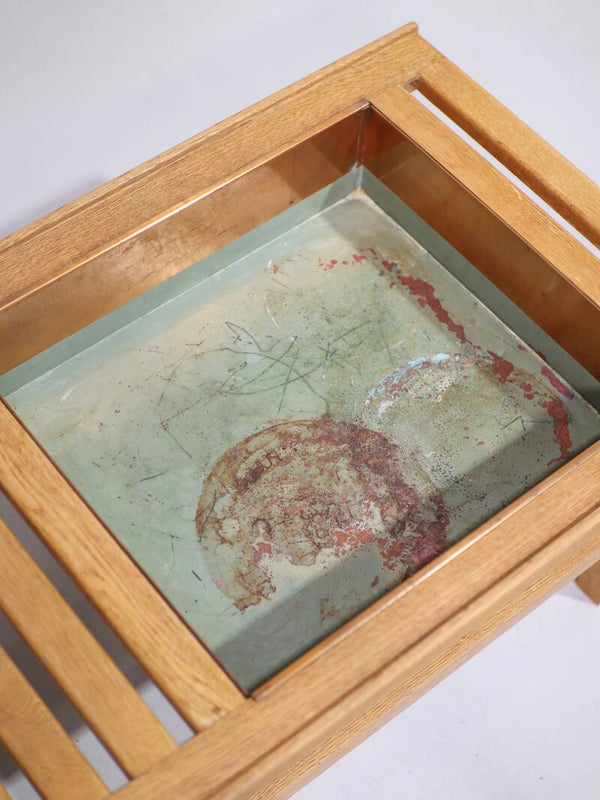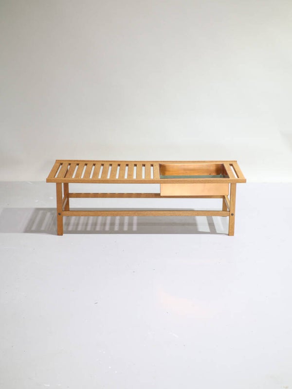 Zeldzaam halbankje uit Zweden, jaren '60. Vermoedelijk ontworpen door Yngve Ekström. Dit bankje is gemaakt van licht eikenhout, prachtig vormgegeven met latjes, opstaande randen en mooie houtverbindingen. Verder zit er een uitneembare koperen bloem- / plantenbak in. Naast halbankje / sidetable zou dit meubel ook geschikt zijn als salontafel of simpelweg een uniek decoratiestuk in de woonkamer.