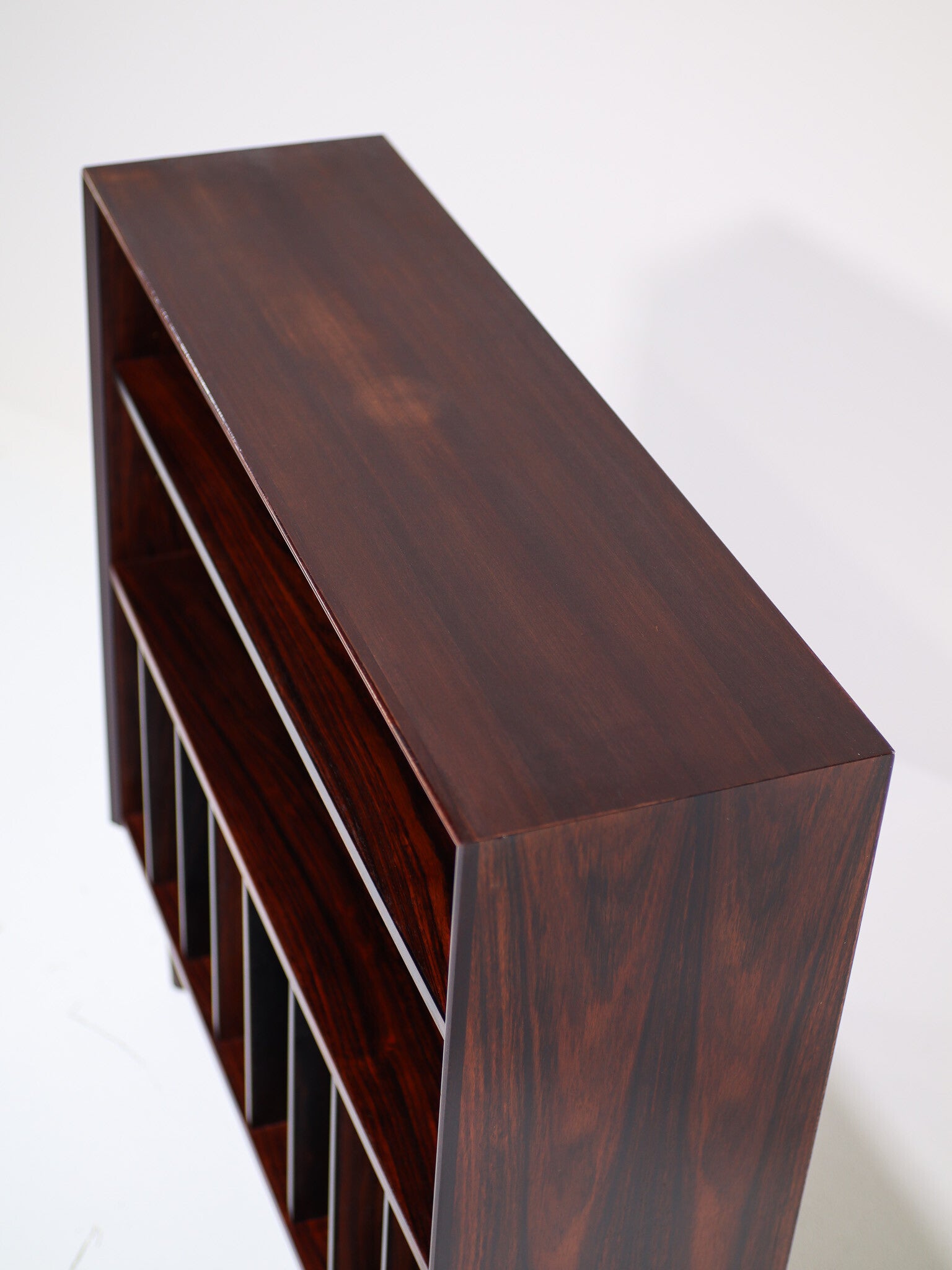 Prachtige open boekenkast met lp-vakken ontworpen door E. Brouer voor Brouer Møbelfabrik in de jaren '60 in Denemarken. Dit platenkastje is gemaakt van palissanderhout met een mooie houttekening. De plank is in hoogte verstelbaar en de schotten kunnen ook worden verwijderd of verplaatst. De kast is afgewerkt met schuine randen.