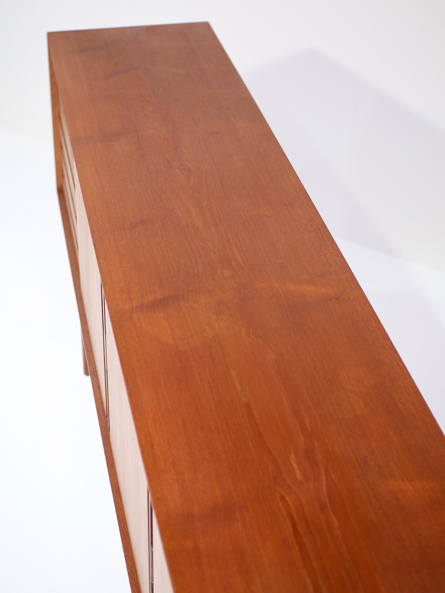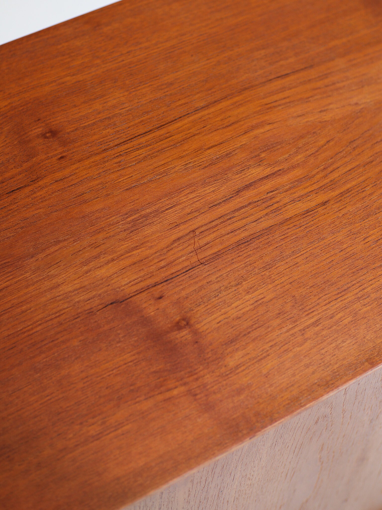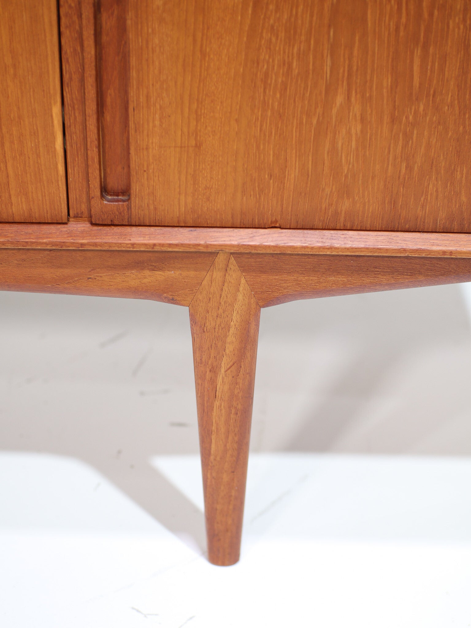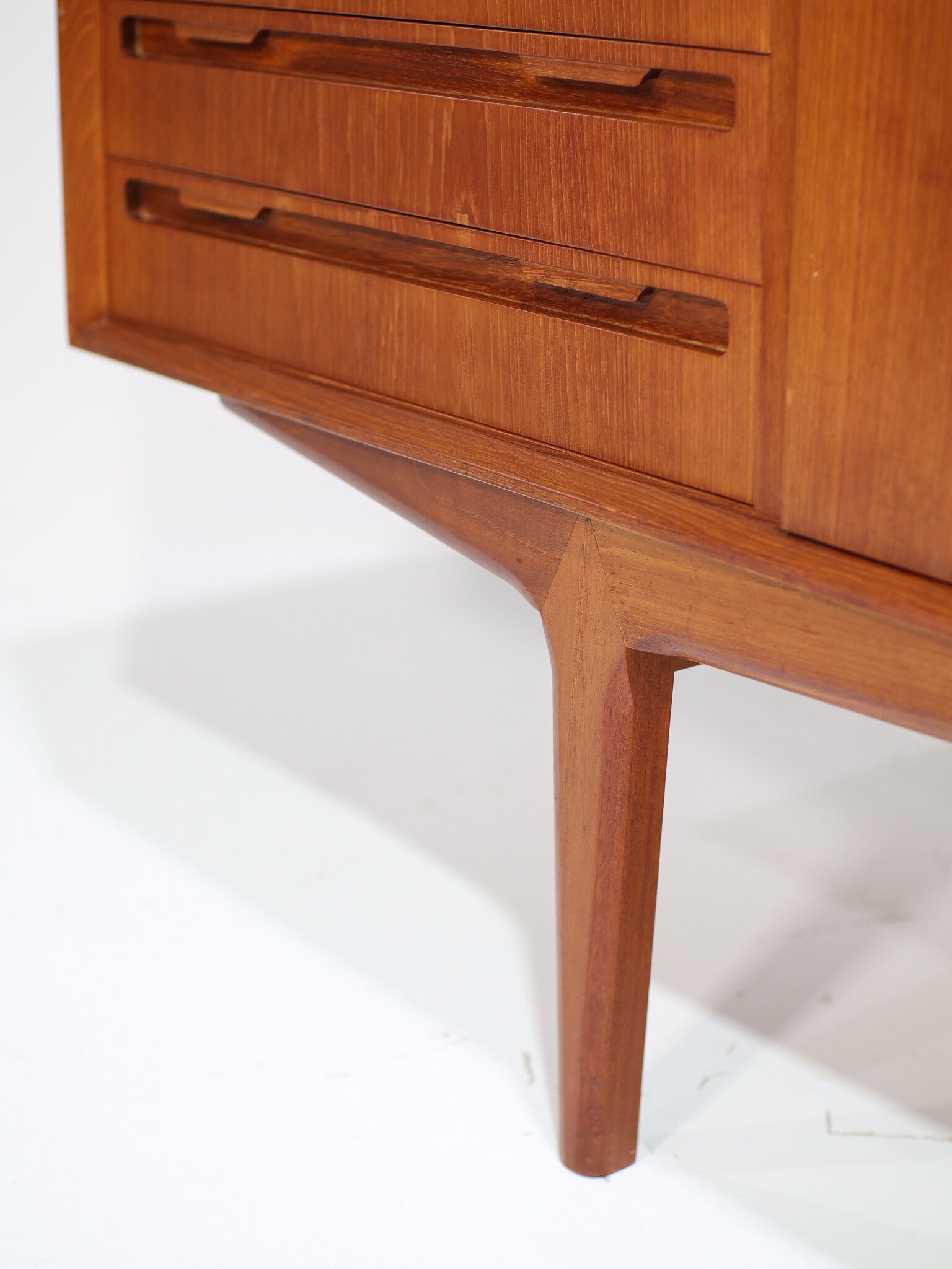 Zeldzaam dressoir / lowboard ontworpen door Knud Nielsen voor Løsning Møbelfabrik in Denemarken, jaren '60. Deze lange kast is gemaakt van teakhout en heeft een prachtige vormgeving met unieke grepen en poot. Pure Deense vakmanschap! Dit dressoir bevat vijf lades en drie deuren met daarachter twee in hoogte verstelbare planken. Onder andere geschikt als tv-meubel, buffetkast of platenkast.