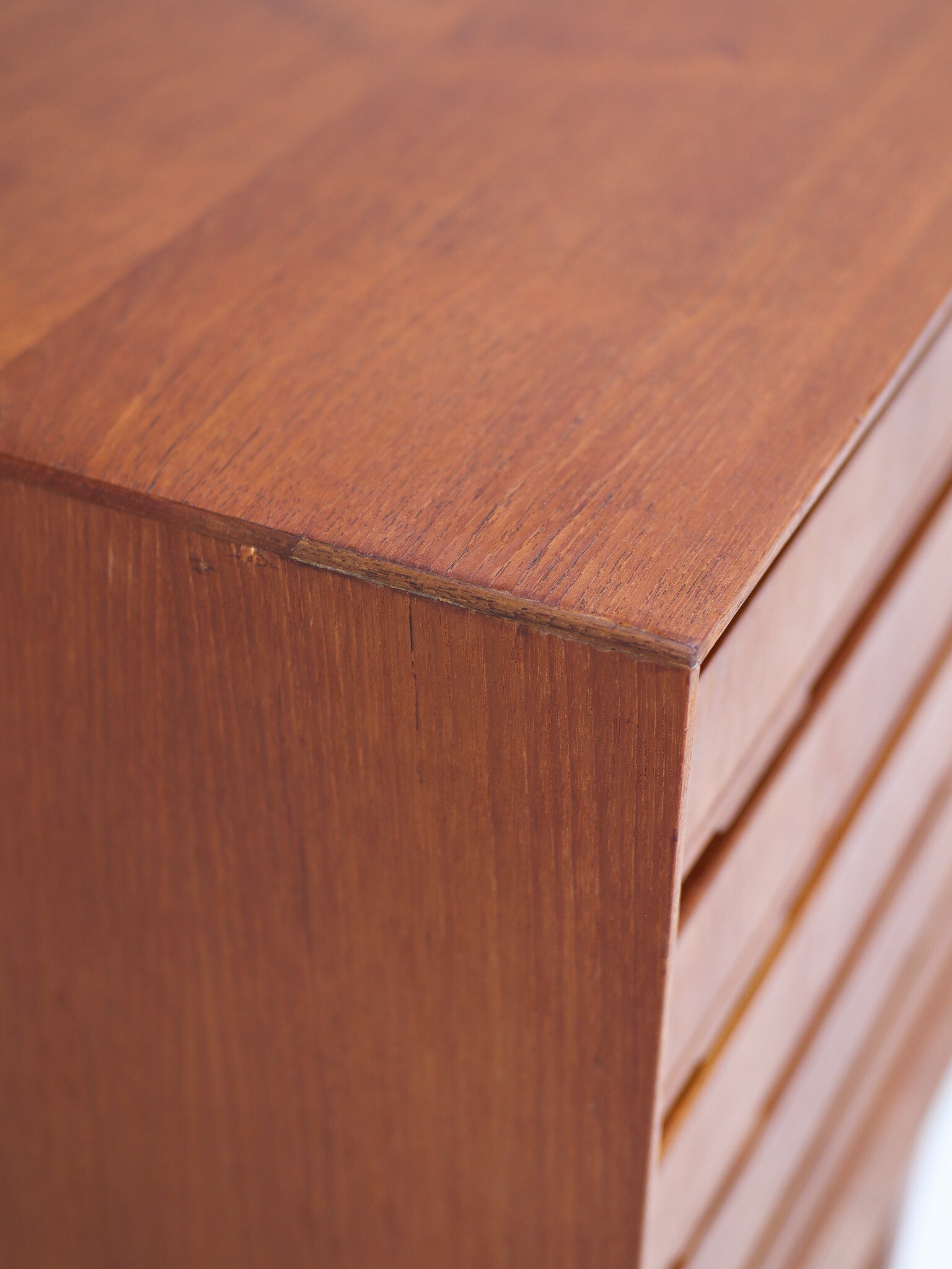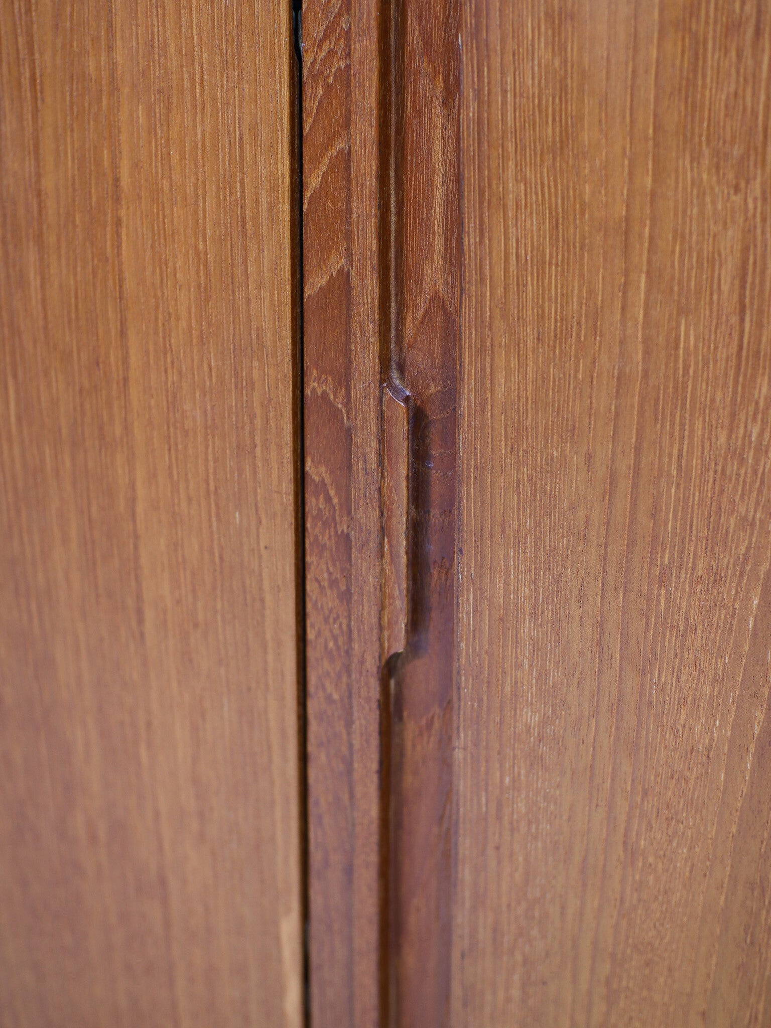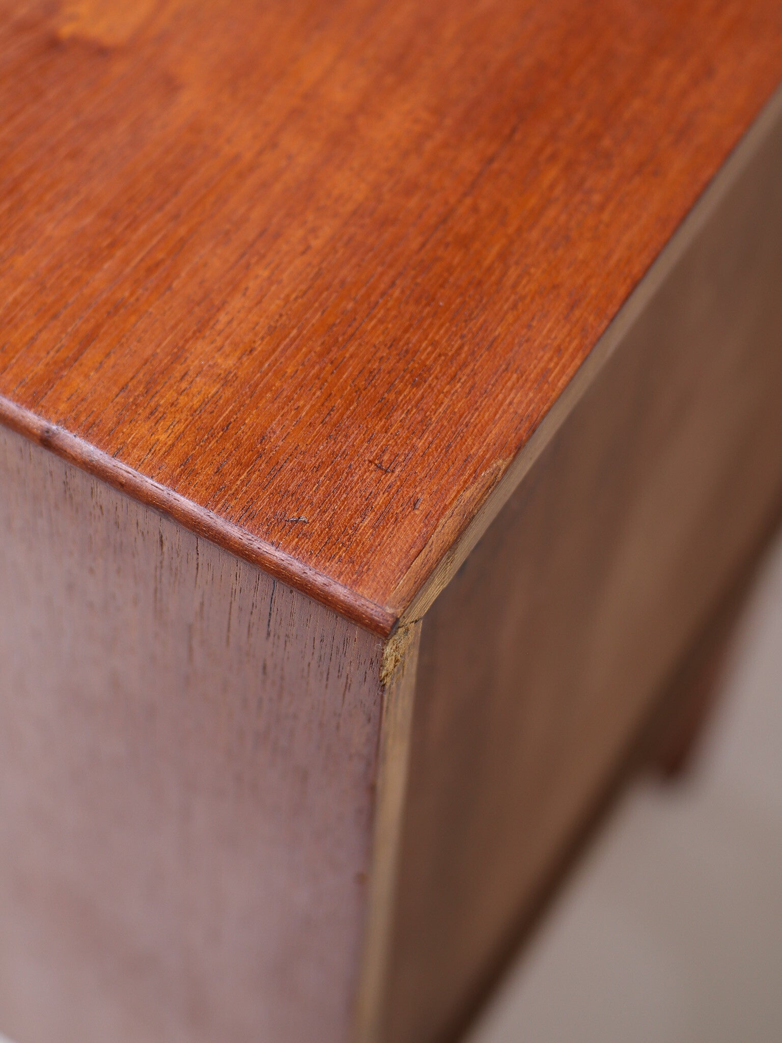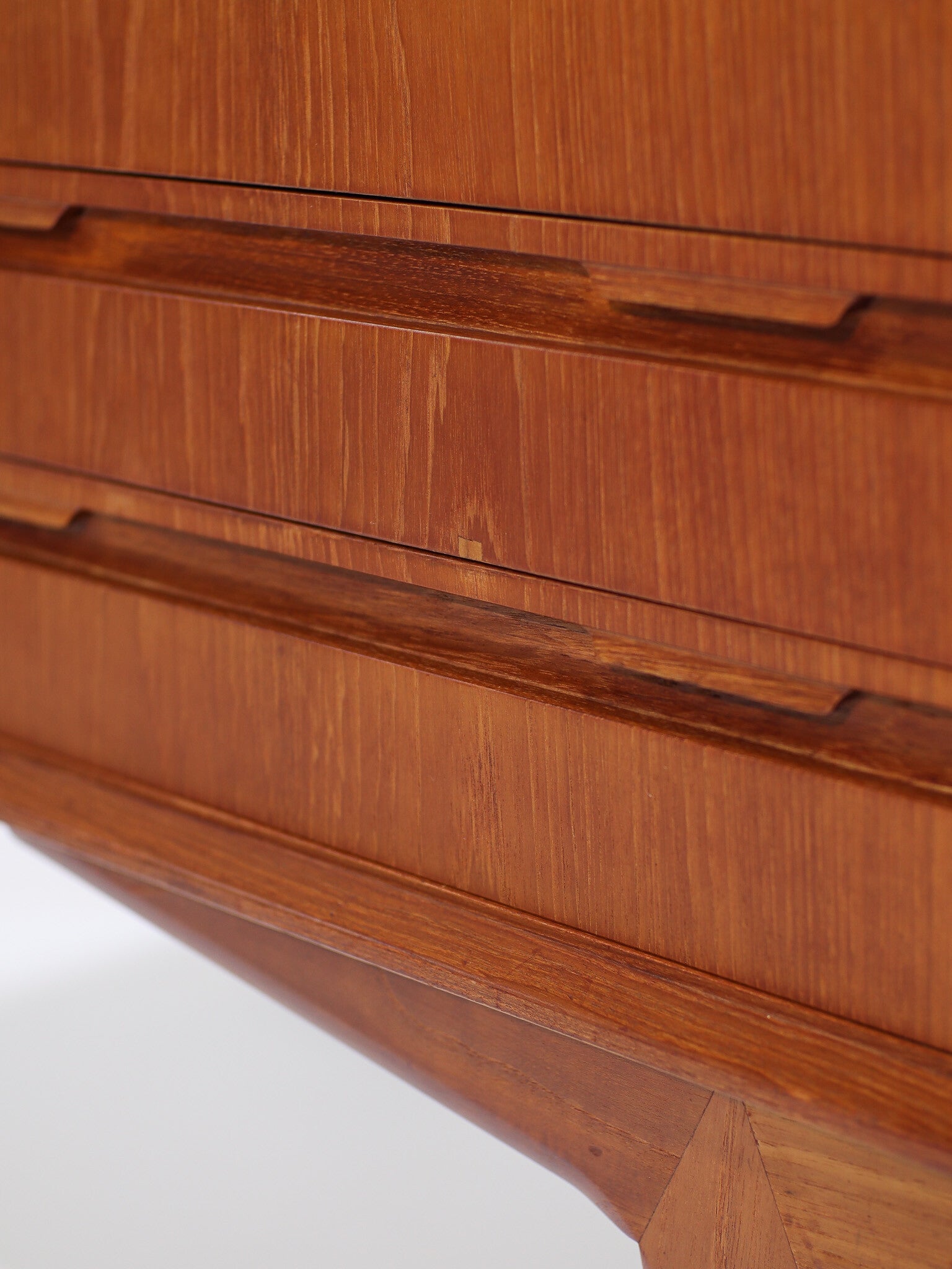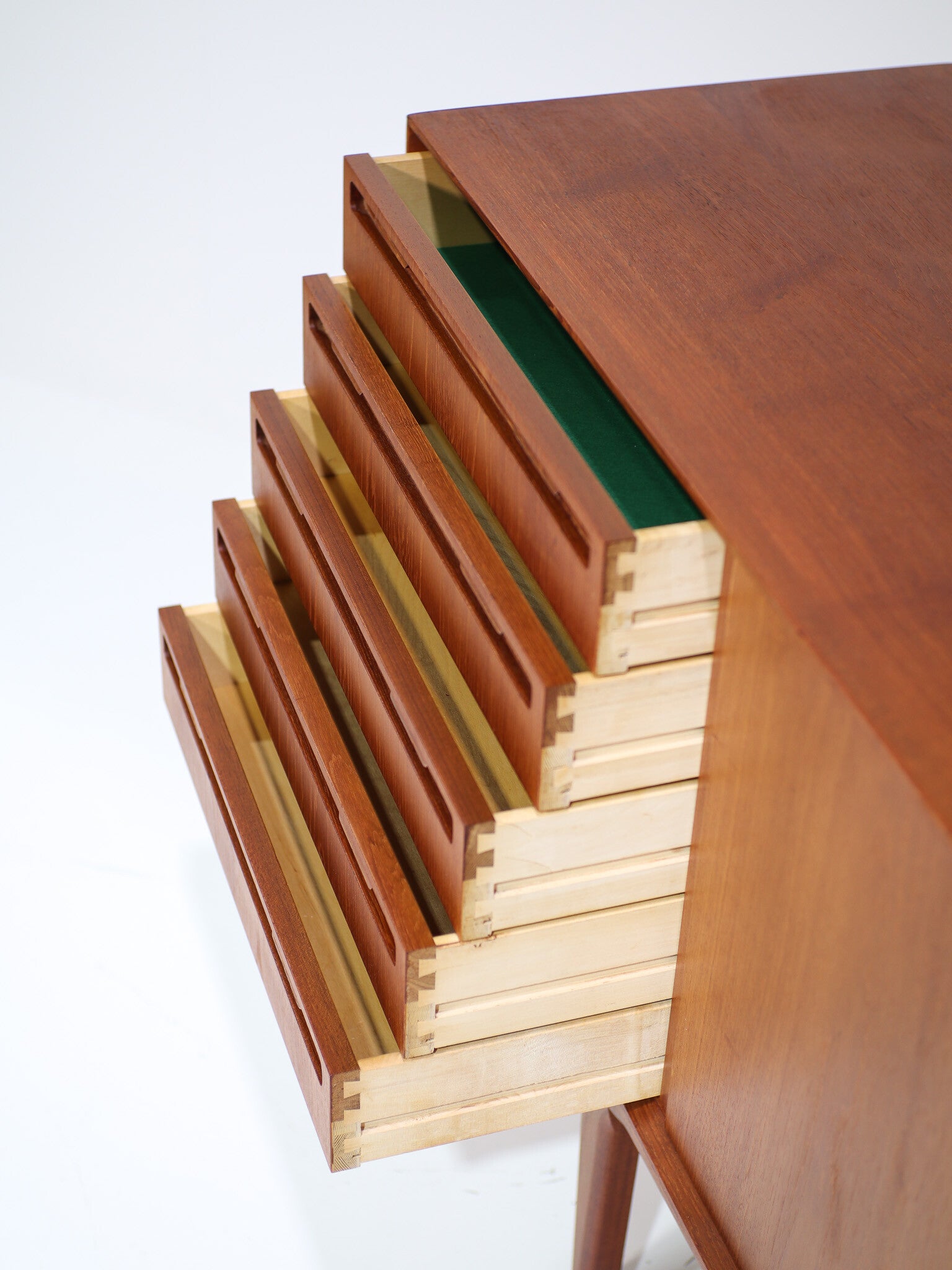Zeldzaam dressoir / lowboard ontworpen door Knud Nielsen voor Løsning Møbelfabrik in Denemarken, jaren '60. Deze lange kast is gemaakt van teakhout en heeft een prachtige vormgeving met unieke grepen en poot. Pure Deense vakmanschap! Dit dressoir bevat vijf lades en drie deuren met daarachter twee in hoogte verstelbare planken. Onder andere geschikt als tv-meubel, buffetkast of platenkast.