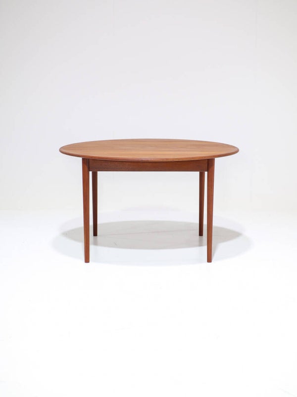 Uitschuifbare ronde / ovale eettafel uit Denemarken, jaren '60. Deze tafel is gemaakt van teakhout en heeft een minimalitstisch design met mooie randen en ronde poten. Rond is deze mid-century tafel geschikt als 4-persoons eettafel. Doordat de tafel met één tot twee extra bladen te verlengen is, tover je de tafel eenvoudig om tot een 6- of 8- persoons ovale eettafel.