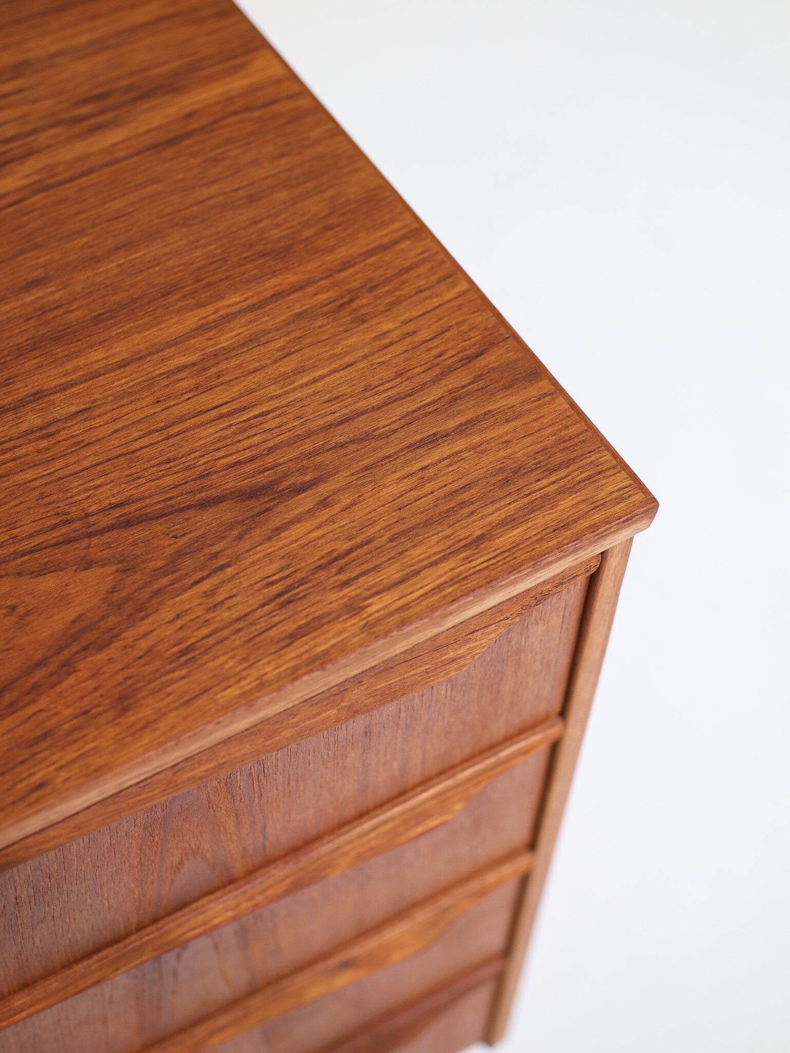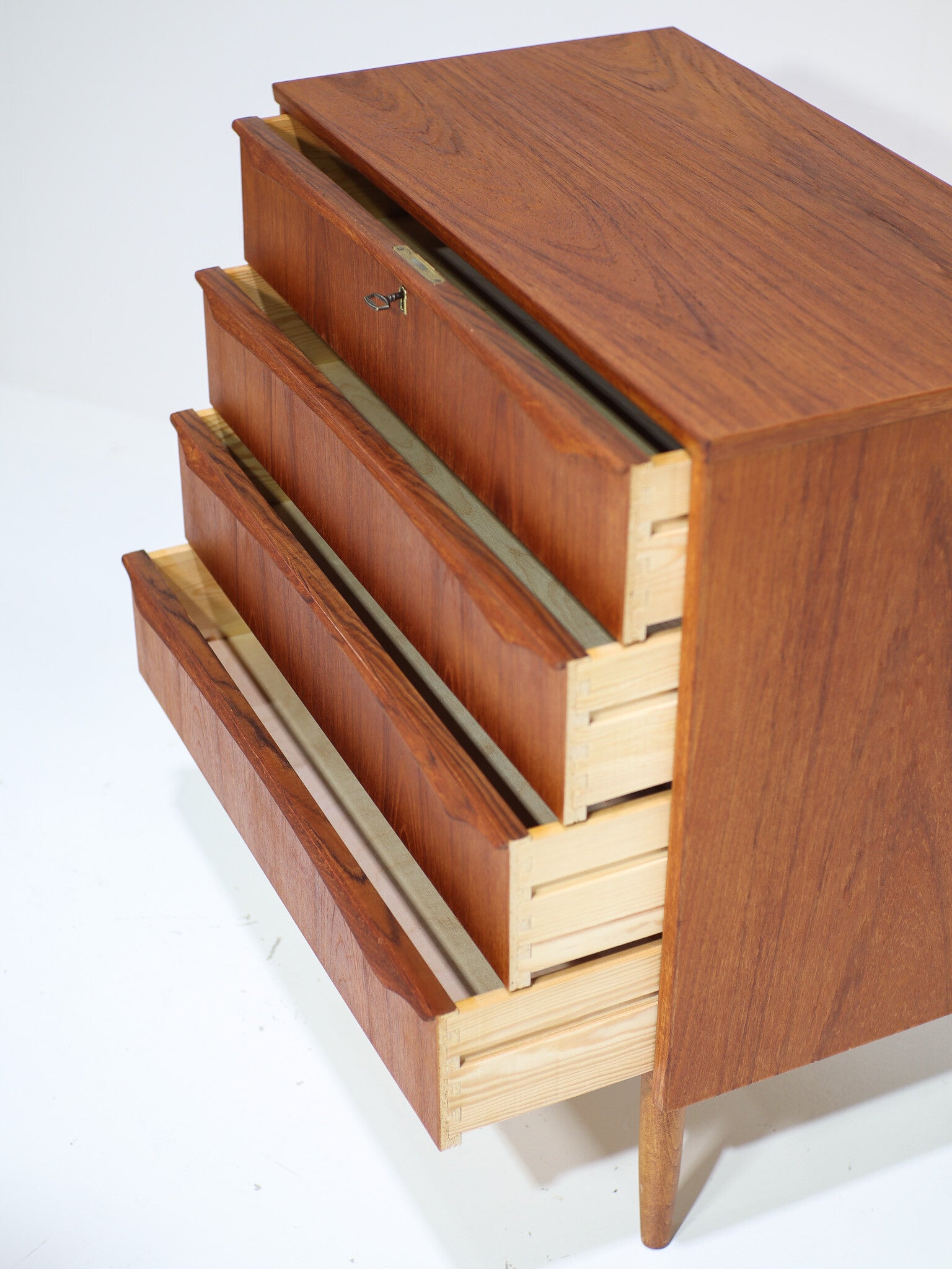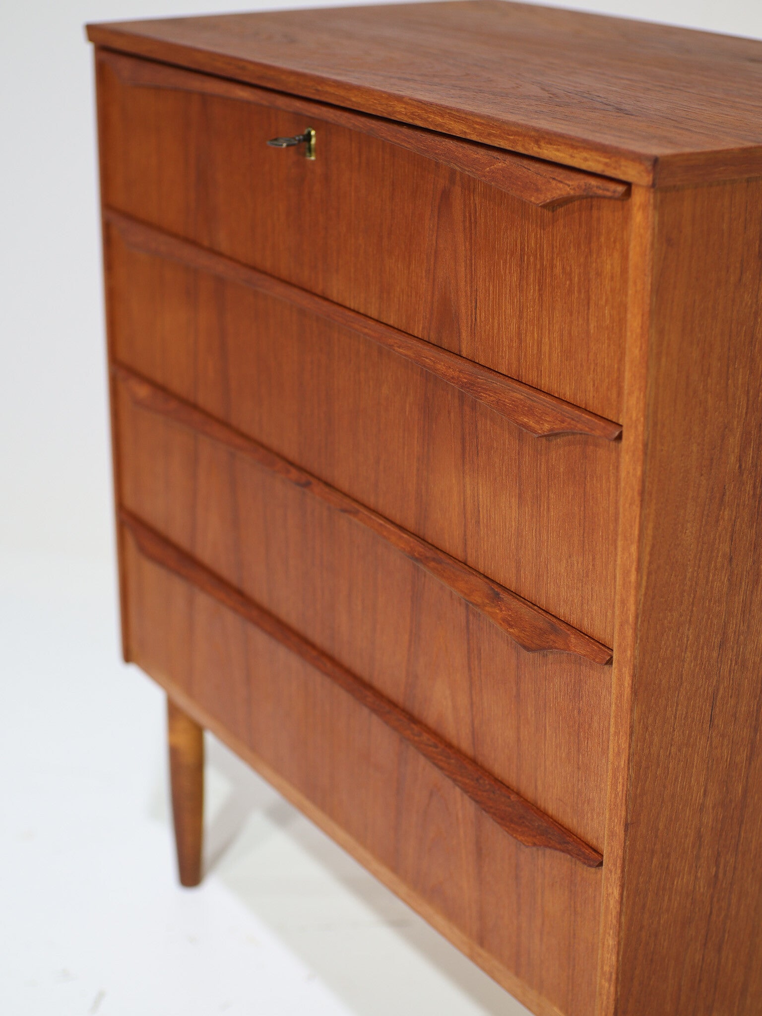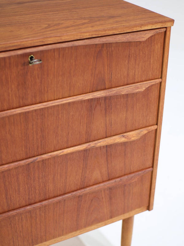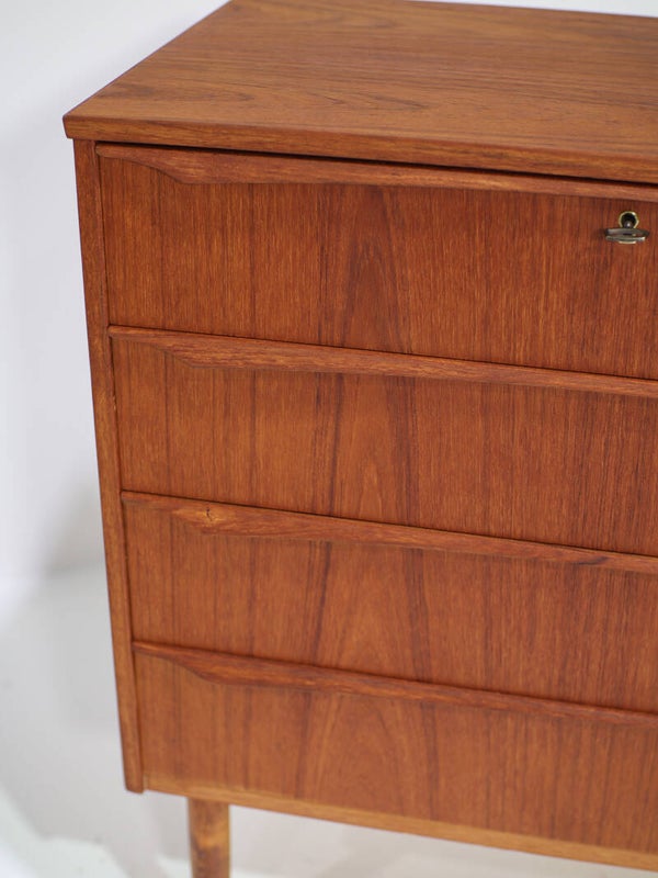 Prachtig ladekastje van hoge kwaliteit uit Denemarken, jaren '60. Deze kast is gemaakt van teakhout en heeft vier ruime lades. De lange houten handgrepen zijn erg fraai vormgegeven.