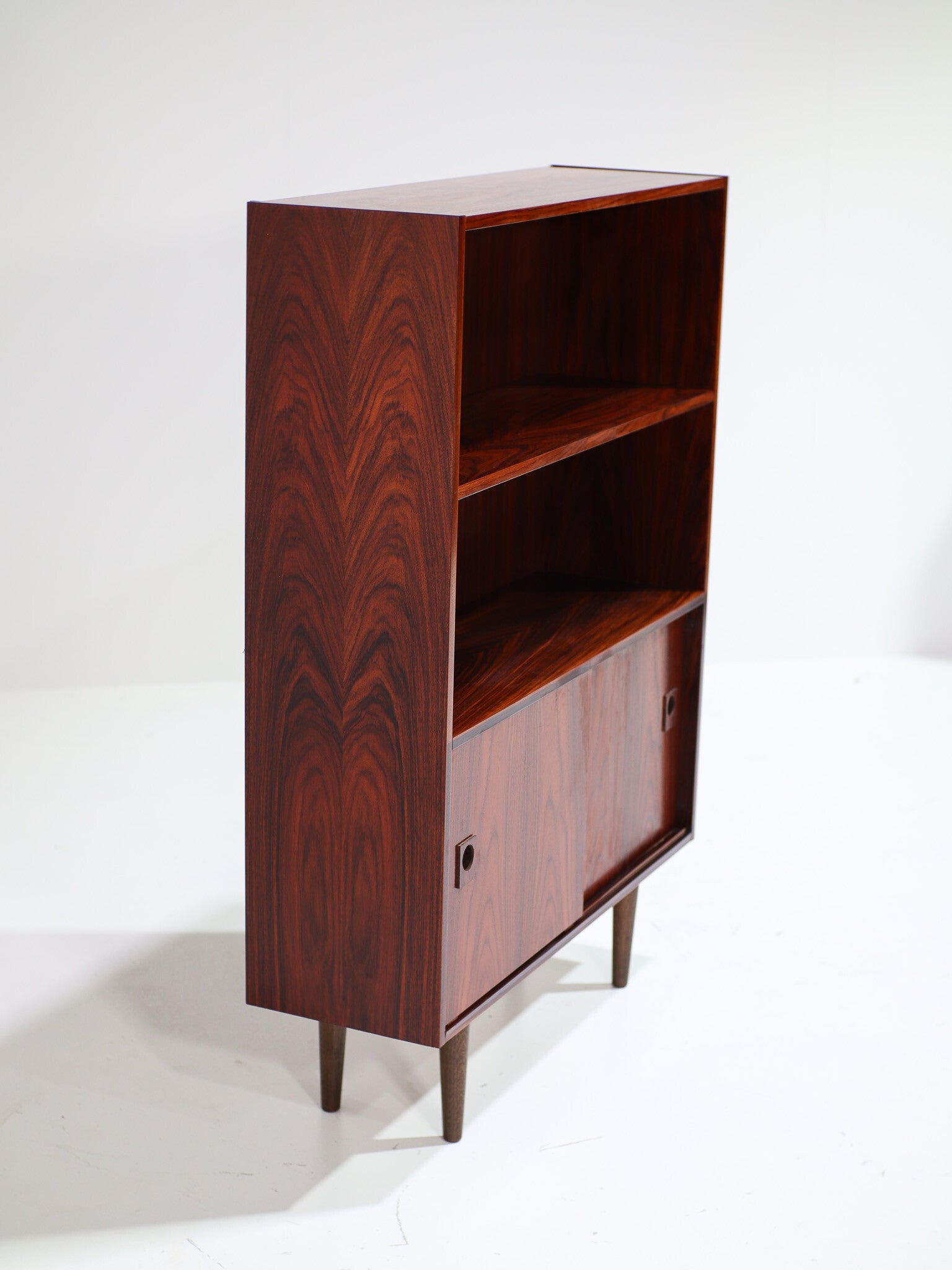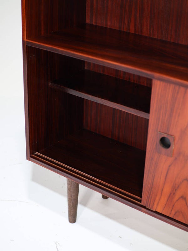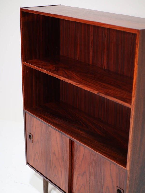 Mooie vintage boekenkast uit Denemarken, jaren '60. Deze kast is gemaakt van palissanderhout met een mooie houttekening. De kast is speels en praktisch ingedeeld met een in hoogte verstelbare plank in het open gedeelte en onderin een gesloten gedeelte met twee schuifdeuren en daarachter in hoogte verstelbare een plank.