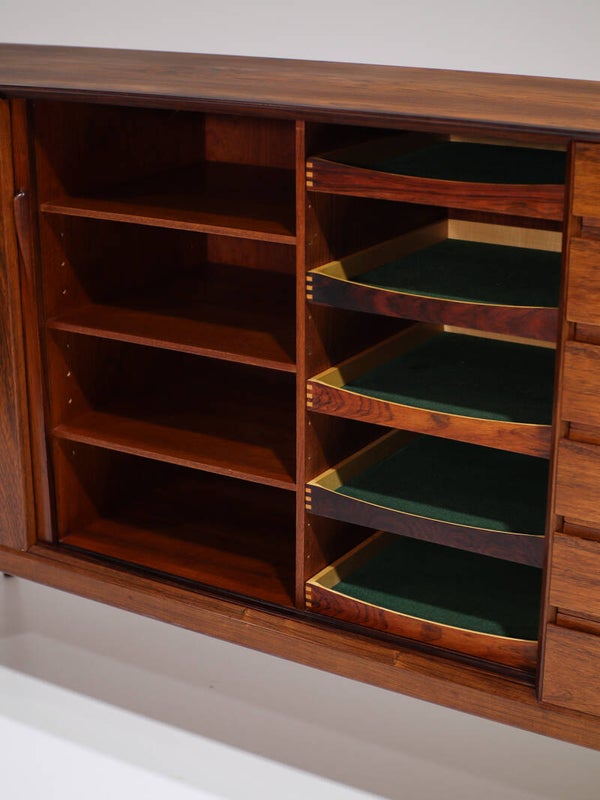 Zeldzaam hoog dressoir (model 38) ontworpen door Henry Rosengren Hansen voor Brande Møbelfabrik, Denemarken jaren '60. Dit sideboard met schuifdeuren en lades is gemaakt van palissanderhout met een mooie houttekening. De planken en lades die in de kast zitten zijn in hoogte verstelbaar.
