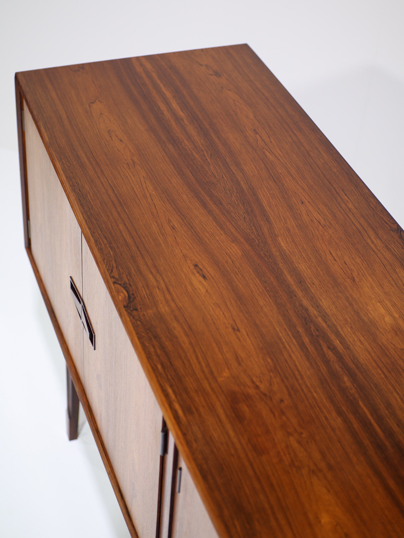 Zeldzaam sideboard geproduceerd door NC Møbler Odense, Denemarken jaren '60. Vermoedelijk ontworpen door Niels Clausen, maar wordt ook toegeschreven aan Henry Rosengren Hansen. Dit dressoir op hoge poten is gemaakt van palissanderhout met een prachtige houttekening. De vijf planken in de kast zijn in hoogte verstelbaar. De kast heeft vier deuren met unieke en verfijnde handgrepen. Ook de randen en poten zijn zeer stijlvol vormgegeven. Pure Deense vakmanschap en kwaliteit!