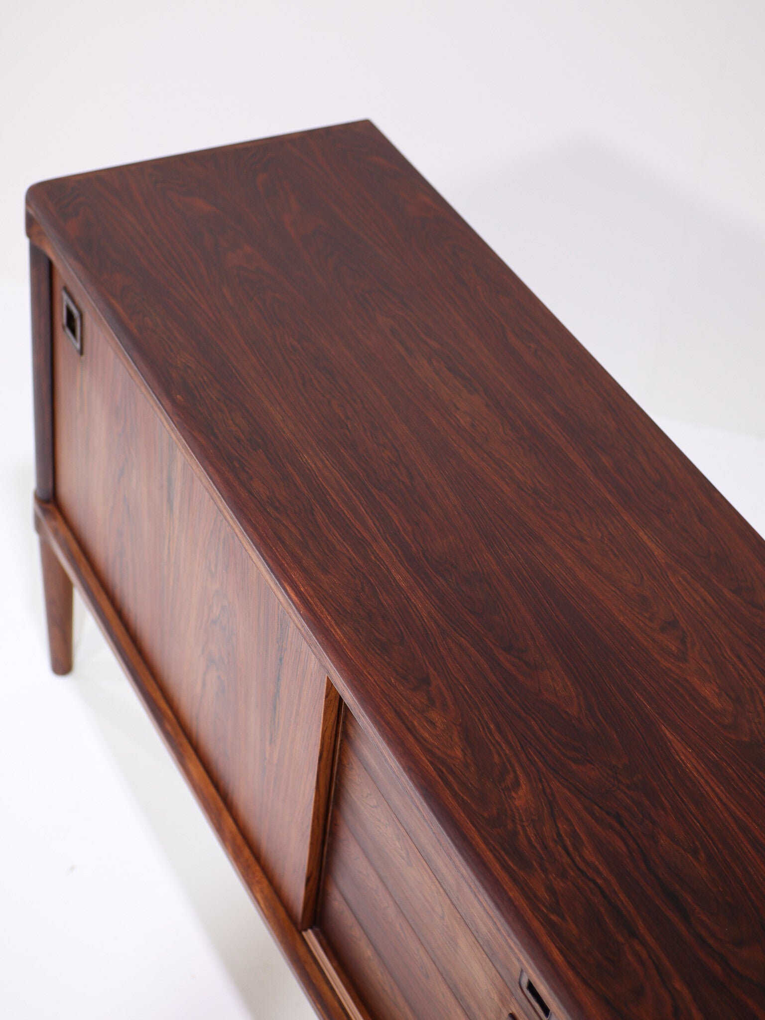 Zeldzaam dressoir ontworpen door Henry Walter Klein voor Bramin, Denemarken 1960s. Dit sideboard is gemaakt van palissanderhout met een prachtige houttekening. De kast heeft vier ruime lades in het midden en twee schuifdeuren met daarachter in hoogte verstelbare planken. De vormgeving is strak en tegelijkertijd organisch met de vierkante grepen, ronde hoeken en prachtige rand. Een minimalistisch, tijdloos en verfijnd design waar de vakmanschap en kwaliteit vanaf spat.
