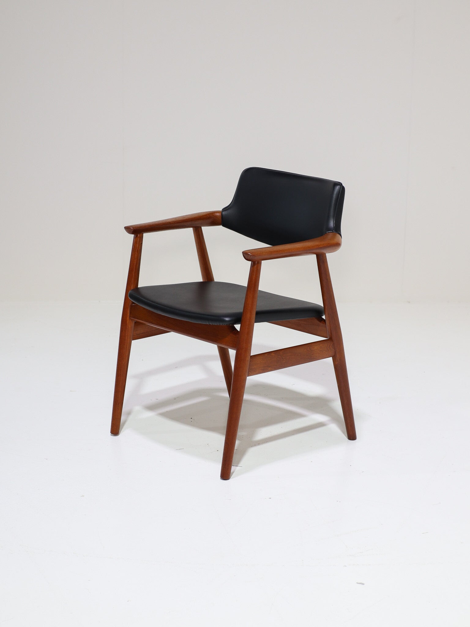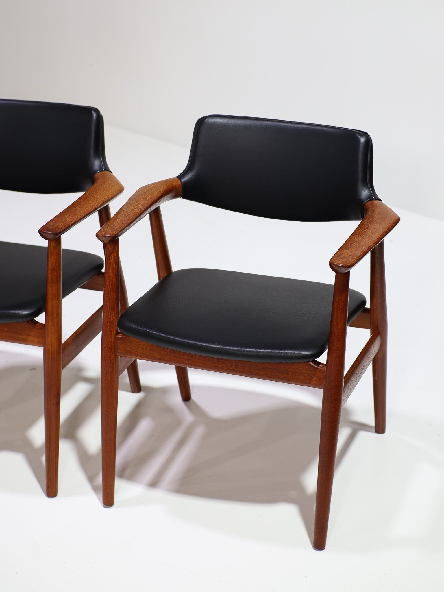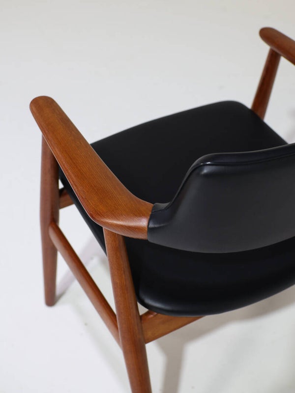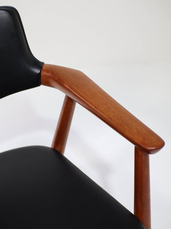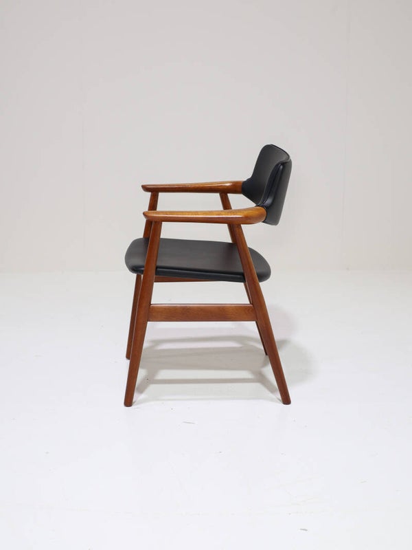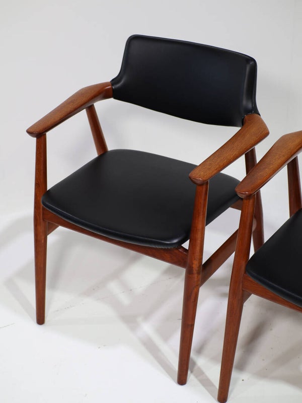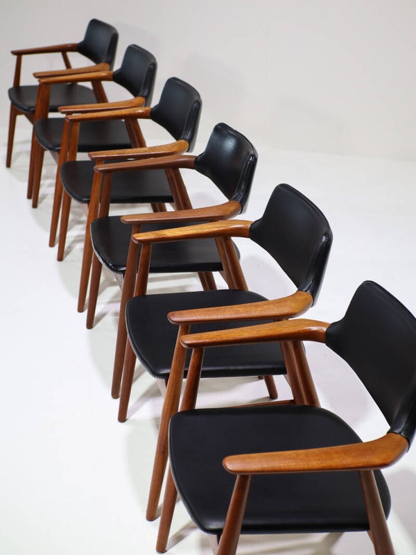 Zeldsame set van 6 'GM11' eetkamerstoelen met armleuningen ontworpen door Svend Åge Eriksen voor Glostrup Møbelfabrik in Denemarken, jaren '60. Deze armstoelen zijn gemaakt van teakhout en hebben zwart skai leren bekleding op de zitting en rug. Het frame is prachtig vormgegeven met organische vormen, verfijnde details en de perfecte verhoudingen. Pure vakmanschap! Een tijdloos, hoog kwalitatief design dat niet alleen erg stijlvol is, maar ook veel ondersteuning en comfort biedt voor gezellige lange avonden aan tafel.