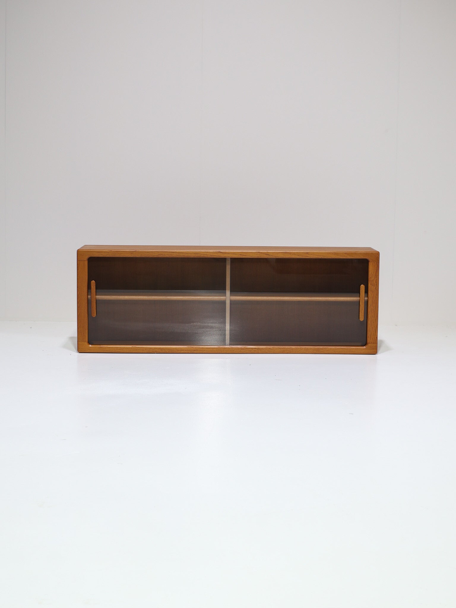 Prachtige lange vitrinekast / wandkast geproduceerd door CFC Silkeborg Møbler in Denemarken, jaren '60. Deze vitrinekast is gemaakt van teakhout en heeft twee glazen deuren met prachtige houten grepen en twee in hoogte verstelbare planken met afgeronde rand. Dit dressoir is aan de wand te hangen, maar indien gewenst kunnen wij het ook voorzien van poten.
