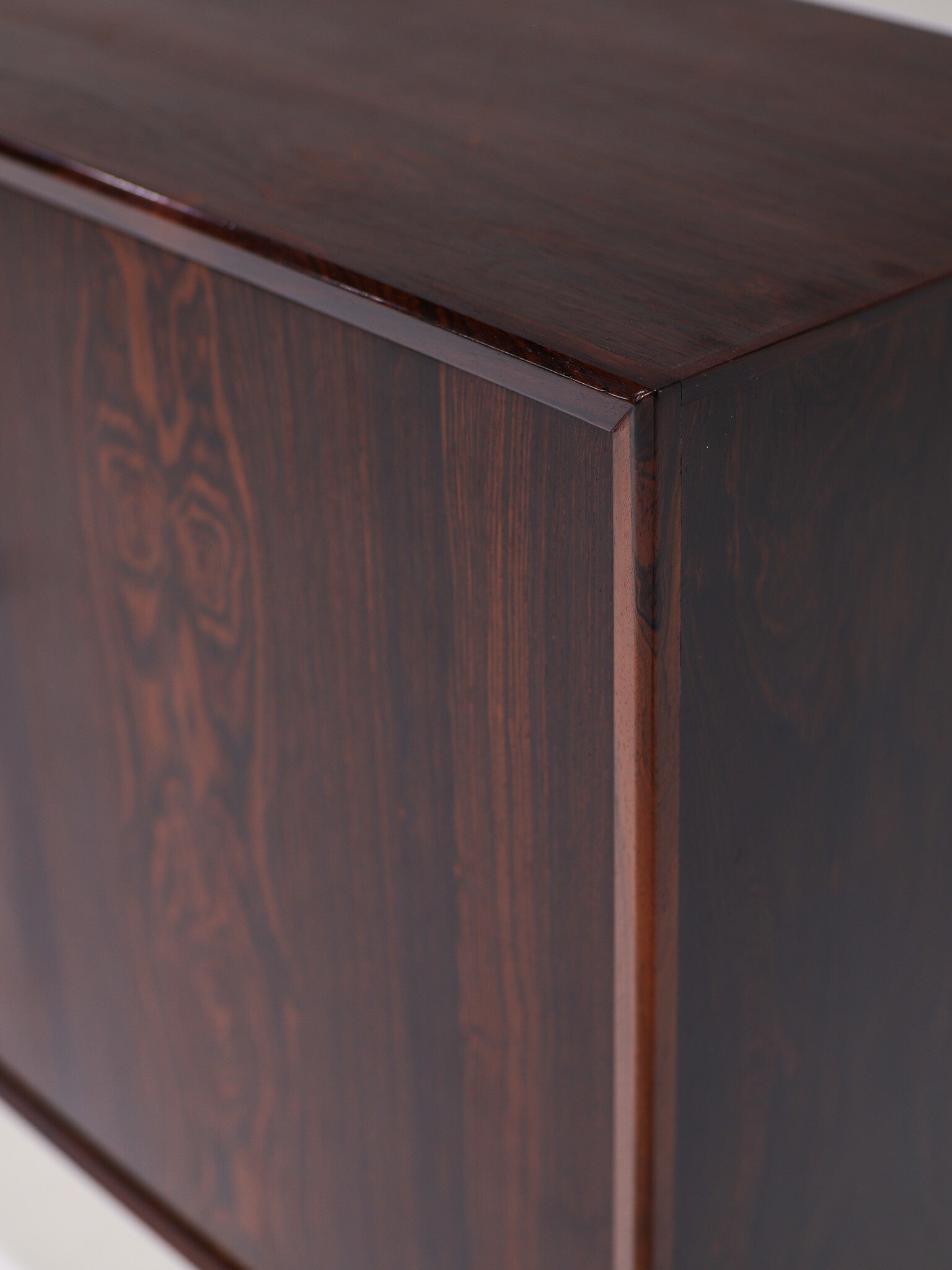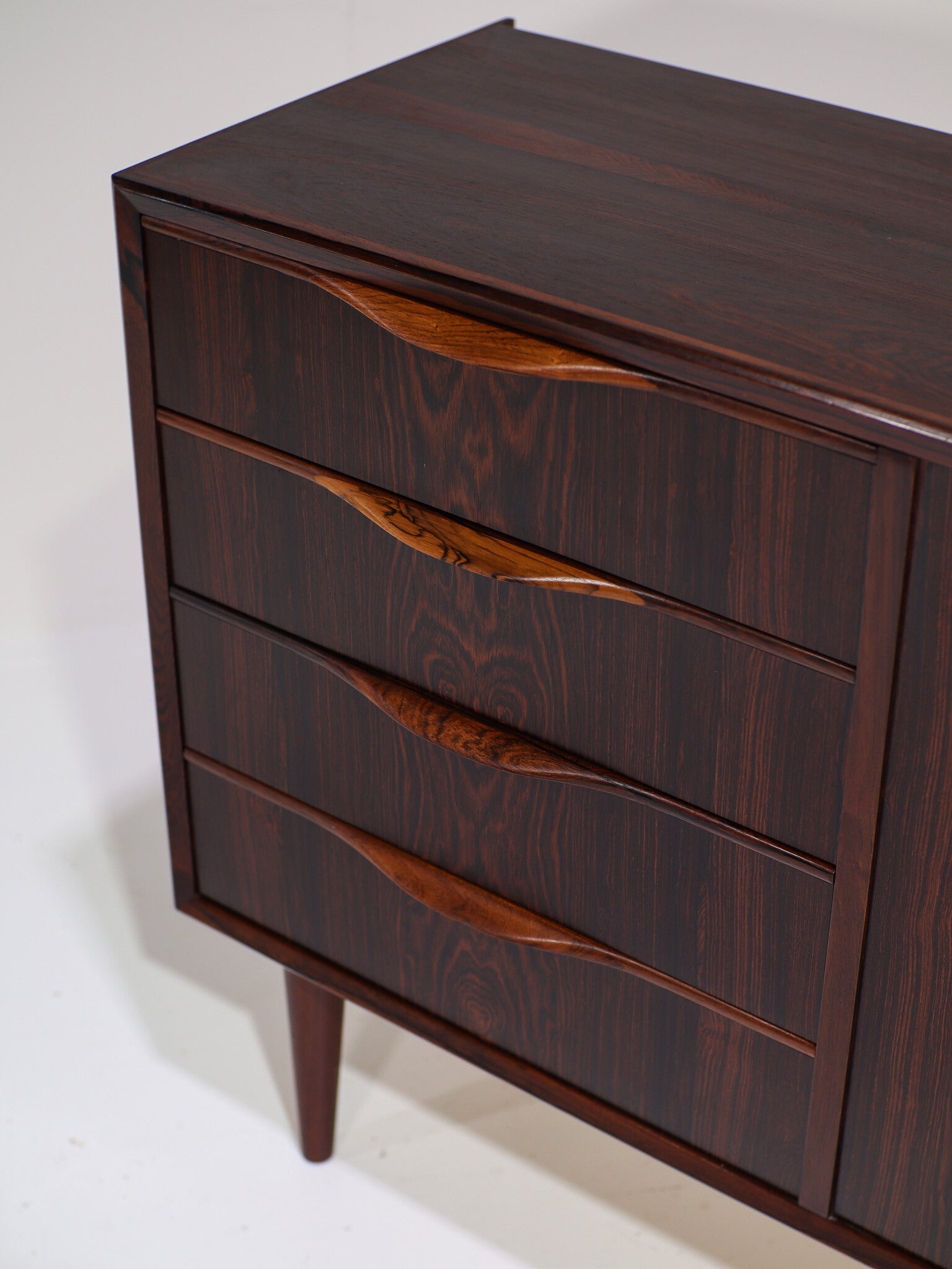 Prachtig lowboard / sideboard ontworpen door Erling Torvits voor Klim Møbelfabrik in Denemarken, jaren '60. Dit dressoir is gemaakt van donker palissanderhout met een zeer indrukwekkende houttekening. De kast heeft links vier lades met verfijnde handgrepen. Rechts zitten twee deuren met daarachter twee in hoogte verstelbare planken. Een tijdloos meubelstuk dat kwaliteit en vakmanschap uitstraalt, onder andere een ideaal formaat om te gebruiken als tv-meubel of platenkast / LP-kast.