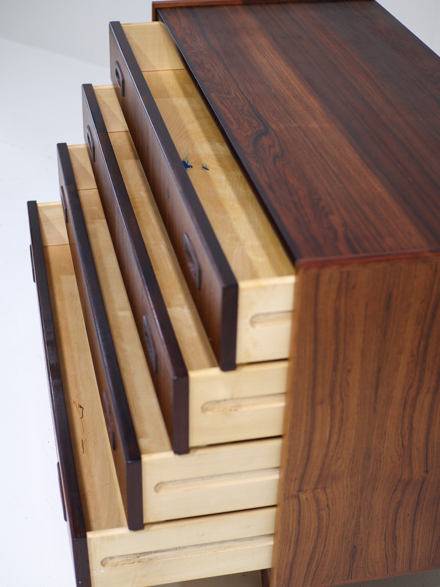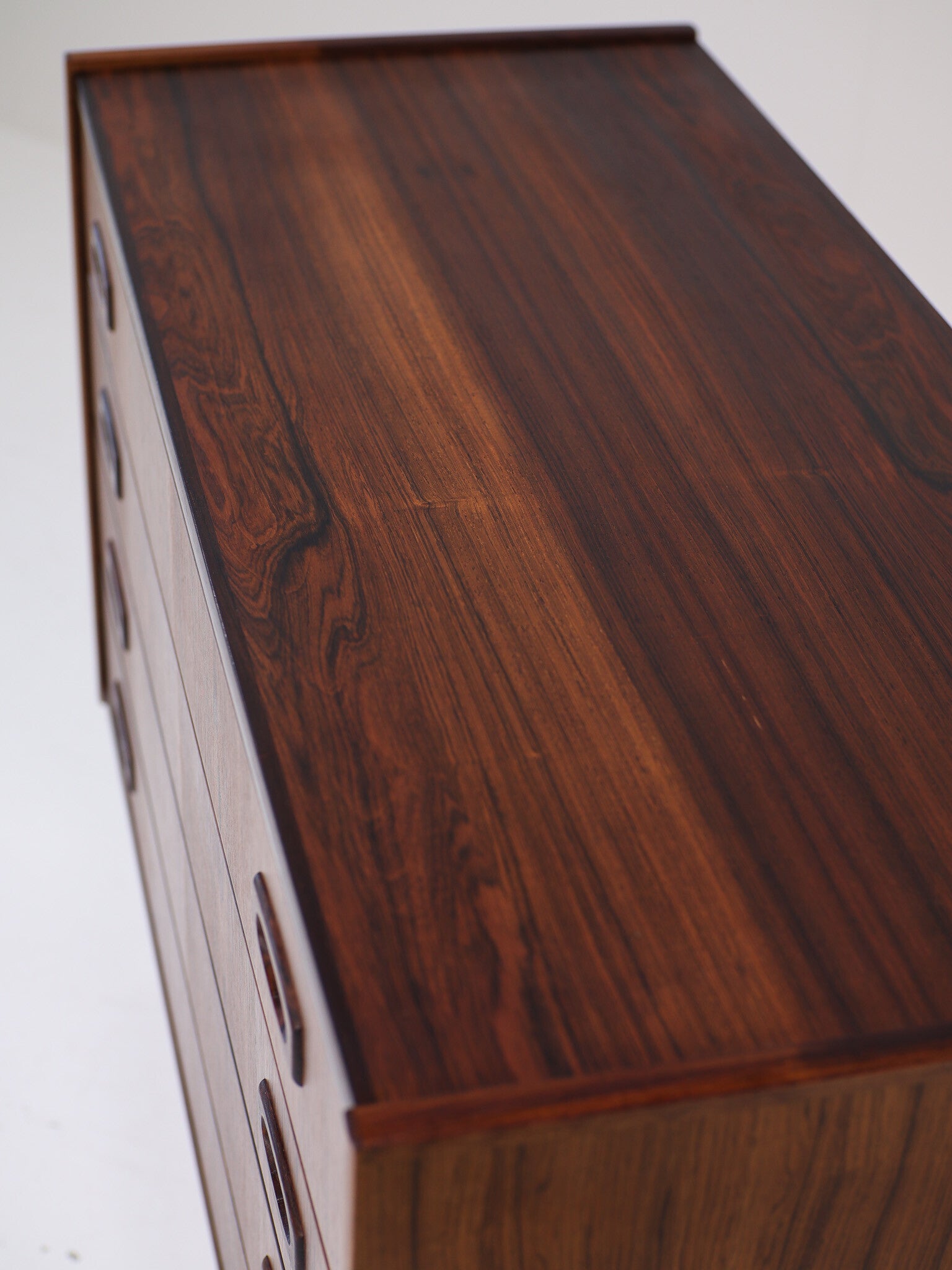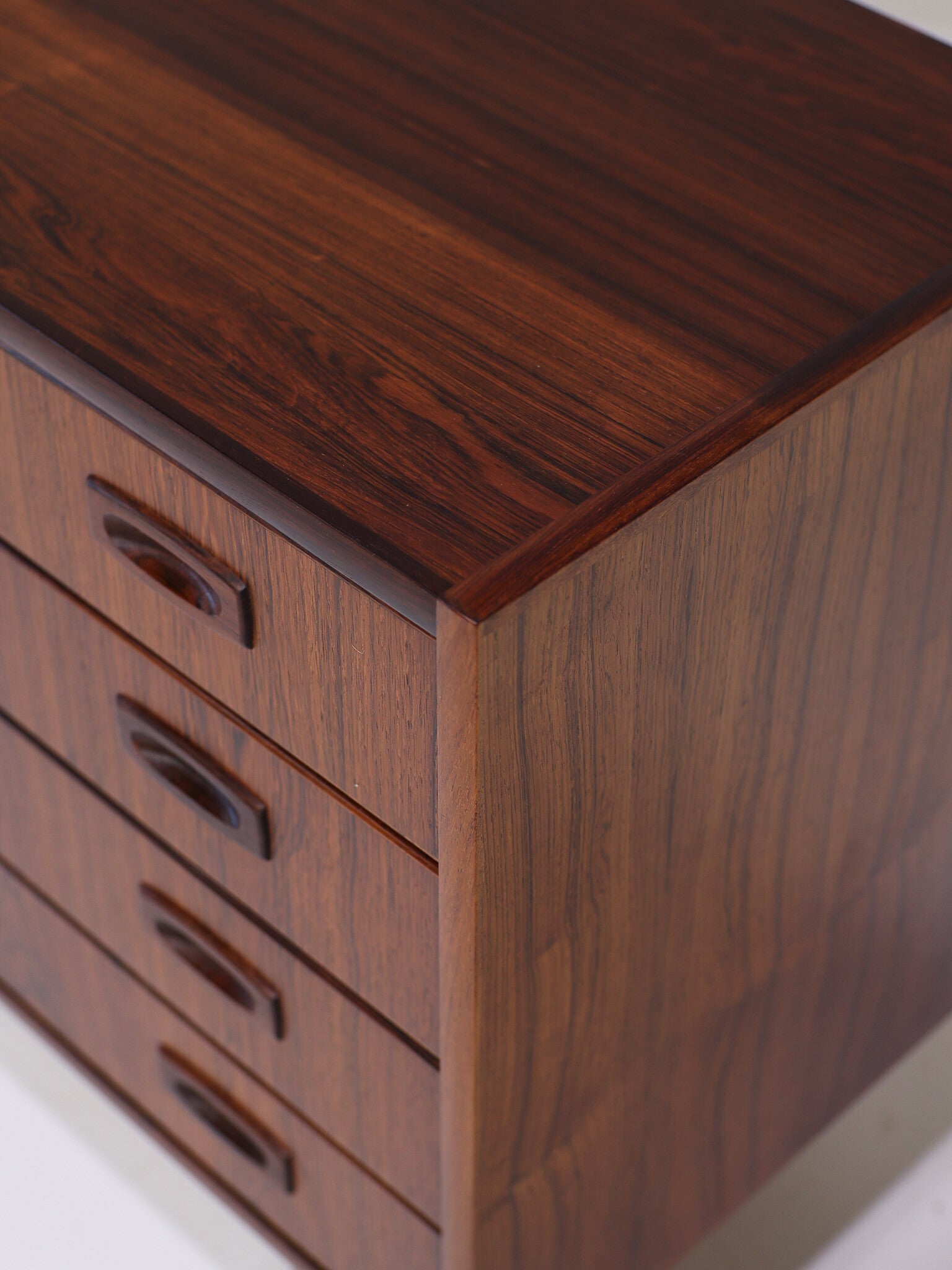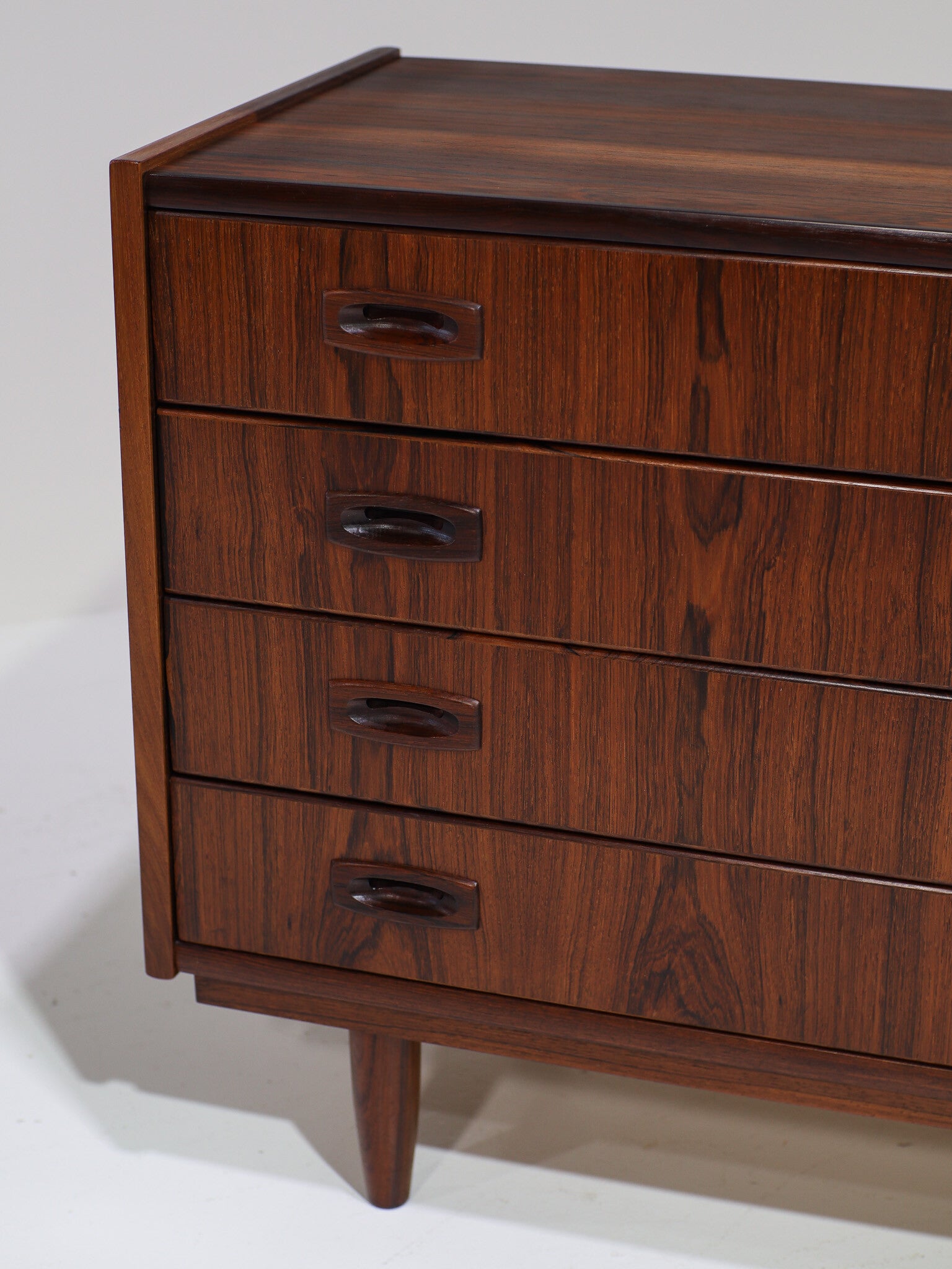Mooie lage ladekast uit Denemarken, jaren '60. Het ontwerp wordt toegeschreven aan Arne Hovmand-Olsen. Deze kast met vier lades is gemaakt van palissanderhout met een prachtige houttekening. De materiaalkeuze en de verfijnde afwerking van de stijlvolle grepen en afgeronde randen tonen de hoge kwaliteit en van dit meubel en vakmanschap van de maker. Een tijdloos en praktisch meubelstuk dat prachtig staat in ieder interieur.