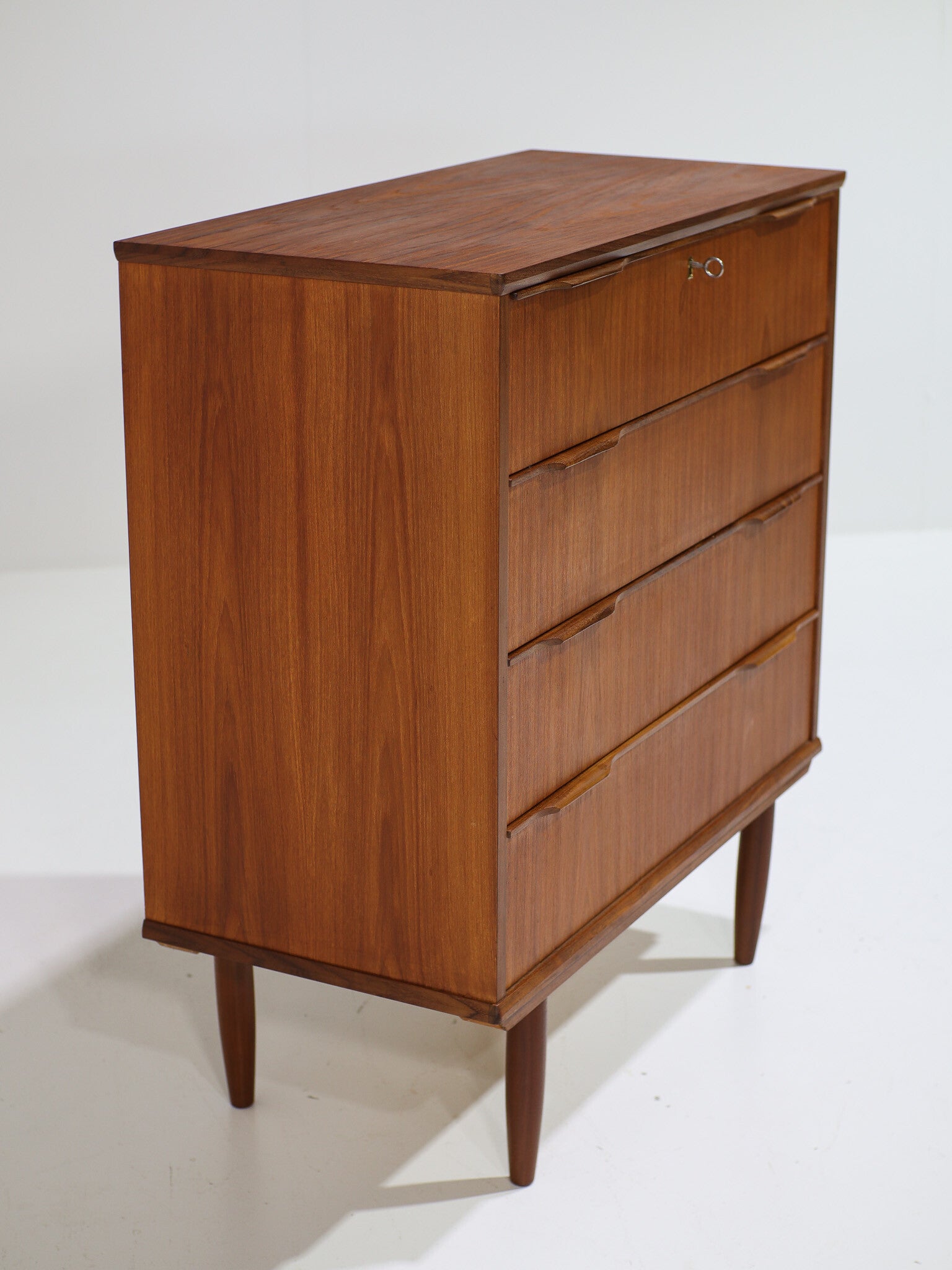 Ladekast uit Denemarken, jaren '60. Deze relatief grote ladekast heeft vier lades en is gemaakt van teakhout. De grepen en randen zijn mooi vormgegeven. Op het label aan de achterkant is te zien dat het meubel destijds is aangekocht bij Daells Varehus, een warenhuis dat tussen 1912 en 1999 gevestigd was in Kopenhagen.
