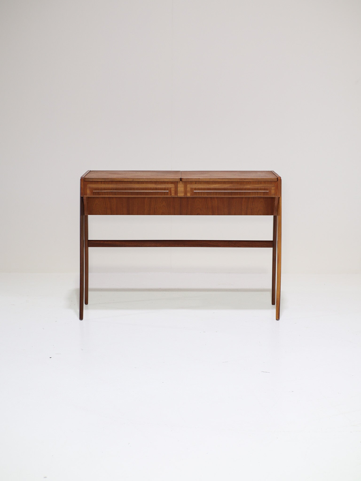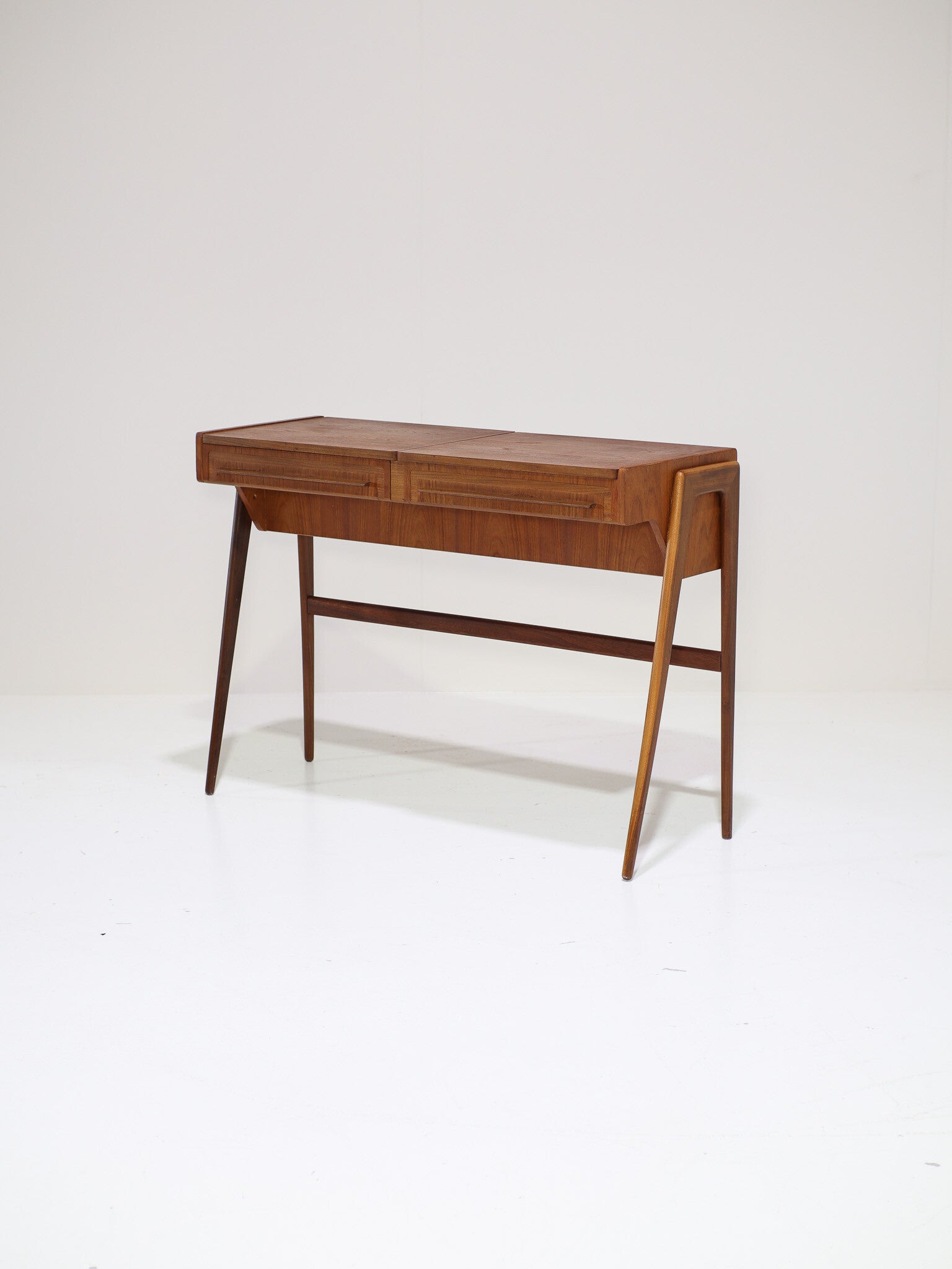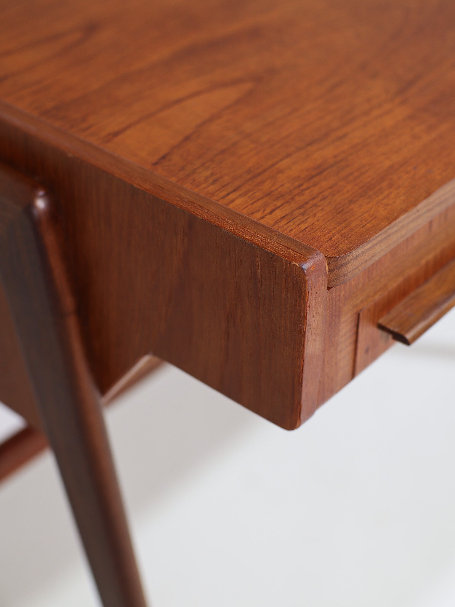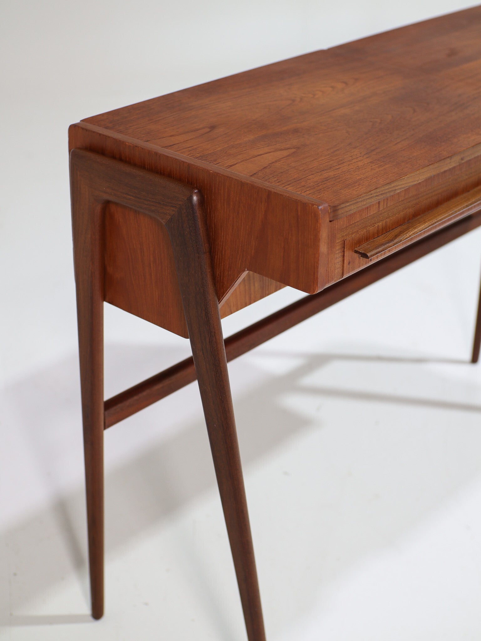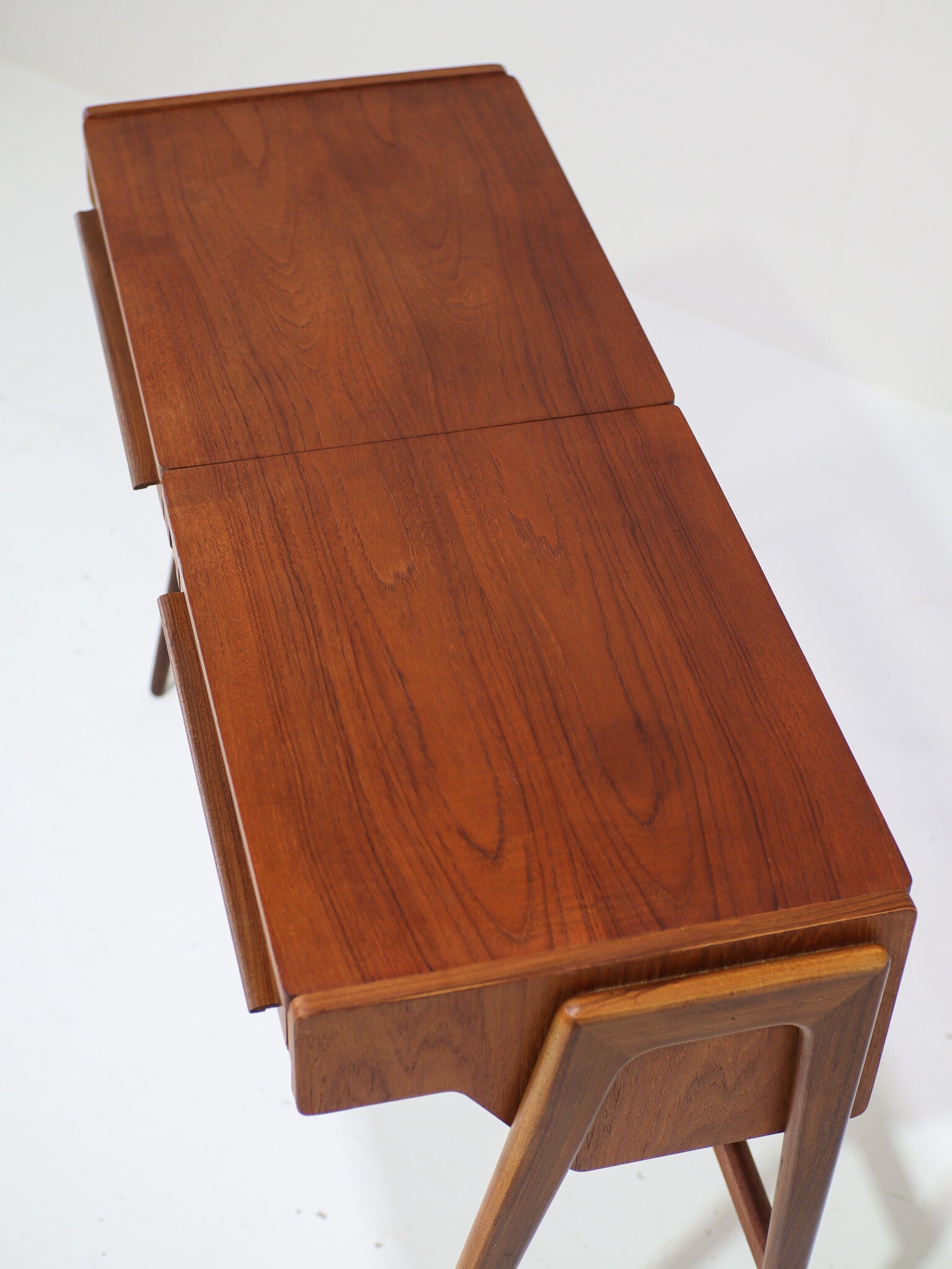 Mooie vintage kaptafel uit Denemarken, jaren '60. Dit bureautje / kaptafeltje is gemaakt van teakhout. Het design is elegant met unieke vormen en details. Hoewel het lijkt alsof het tafeltje twee lades heeft, zit er enkel links een lade en rechts een opklapbare spiegel met daaronder veel opbergruimte voor o.a. make-up of sieraden.
