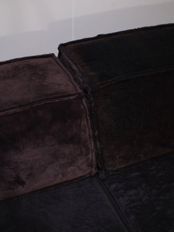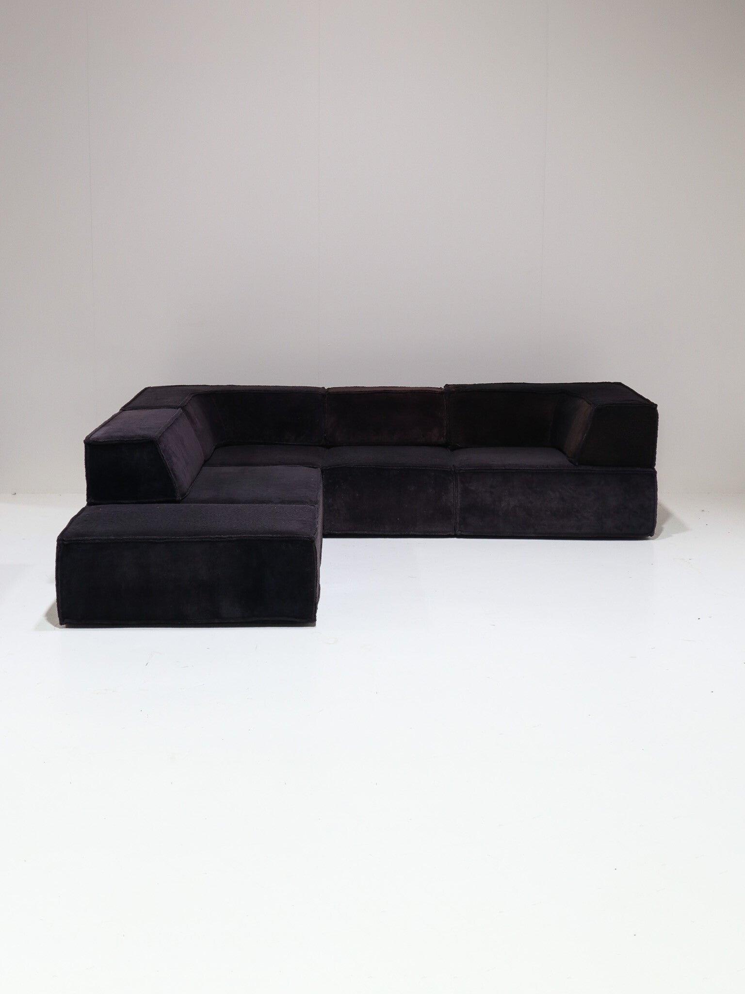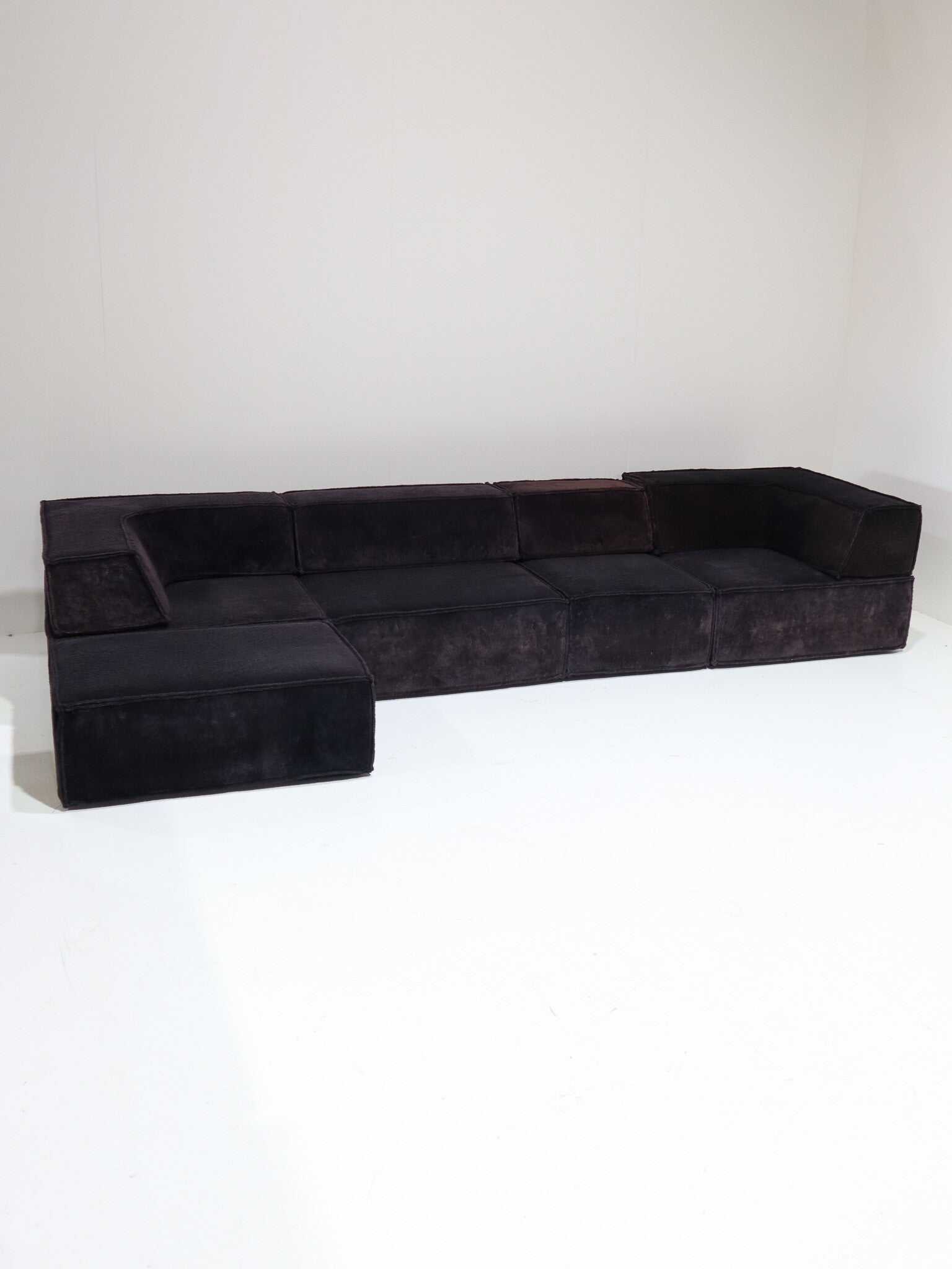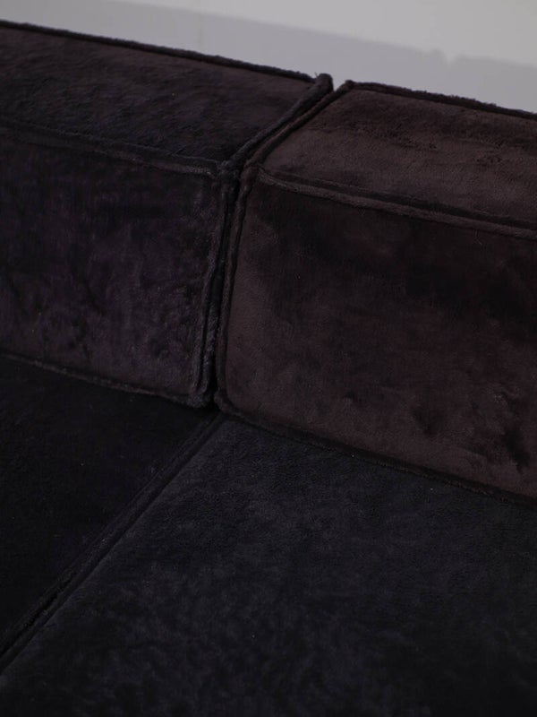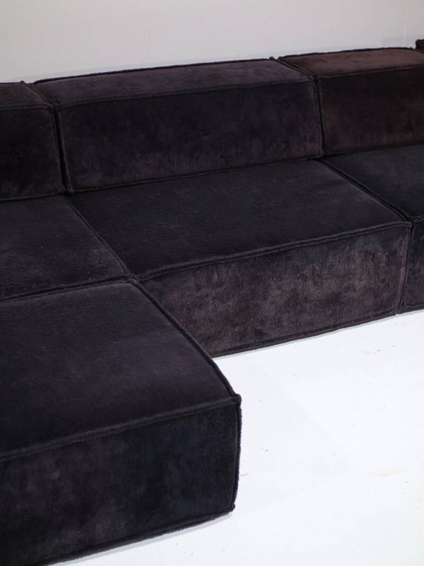 Prachtige elementen 'Trio' sofa ontworpen door Team Form AG voor Cor in Zwitserland, 1973. Deze comfortabele en veelzijdige lounge bank bestaat uit vijf zitelementen, waarvan twee smal, twee rugleuningen en twee hoekleuningen. De mogelijkheden van de Trio zijn eindeloos, doordat de leuningen te verplaatsen zijn. Zo kun je bijvoorbeeld één grote rechte bank maken, een hoekbank, een enorm loungebed of een speels zitlandschap / ziteiland met zitplekken aan twee kanten. Dit vintage exemplaar is bekleed met de originele zachte teddy stof in een donkerpaars-bruine kleur.